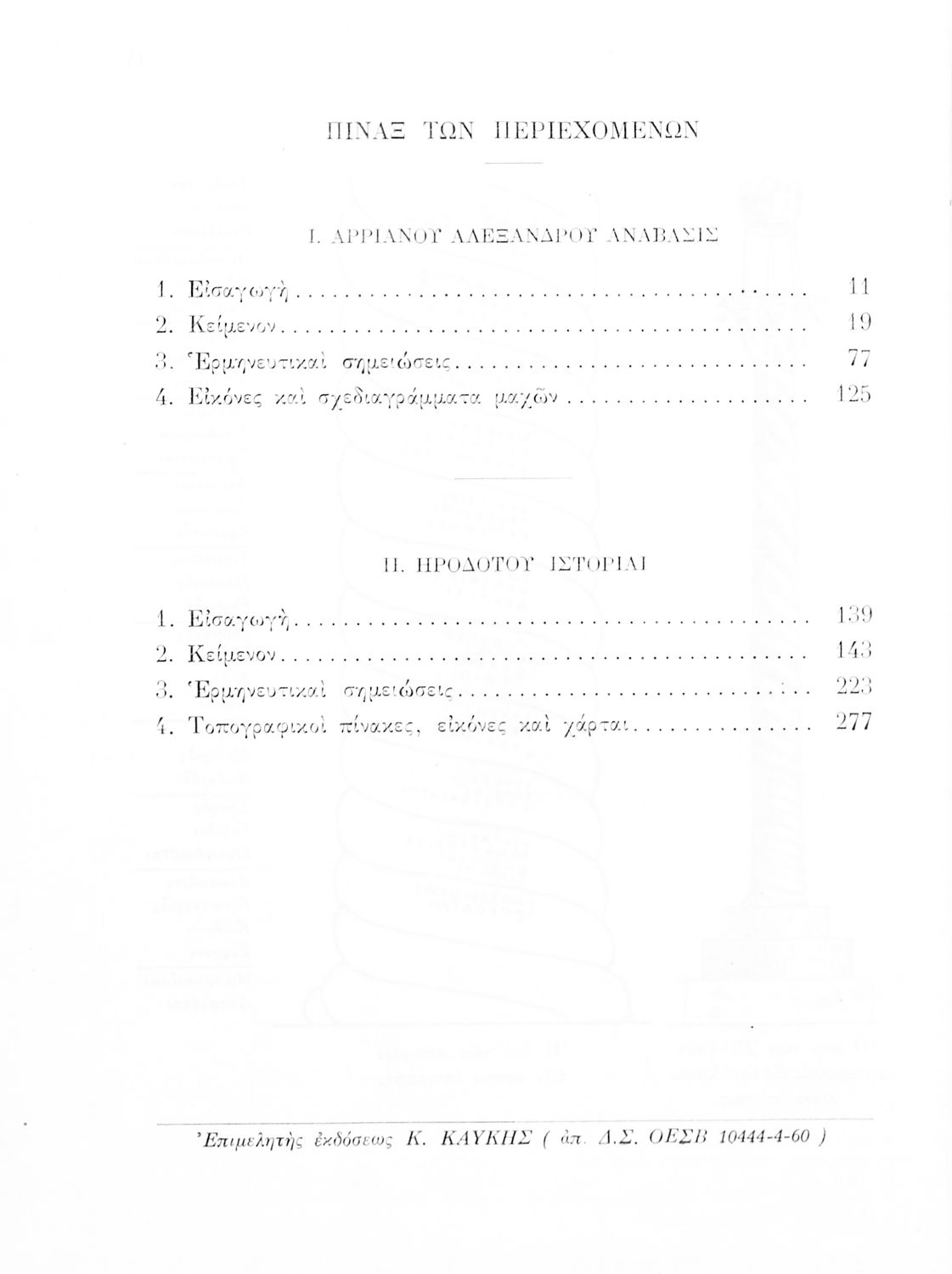 Σχολικό εγχειρίδιο Αρχαίων Ελληνικών που περιλαμβάνει αποσπάσματα από το έργο του Αρριανού Αλέξανδρου Ανάβασις και του Ηρόδοτου Ιστορίαι, ερμηνευτικές και λεξιλογικές παρατηρήσεις καθώς και τοπογραφικούς ...