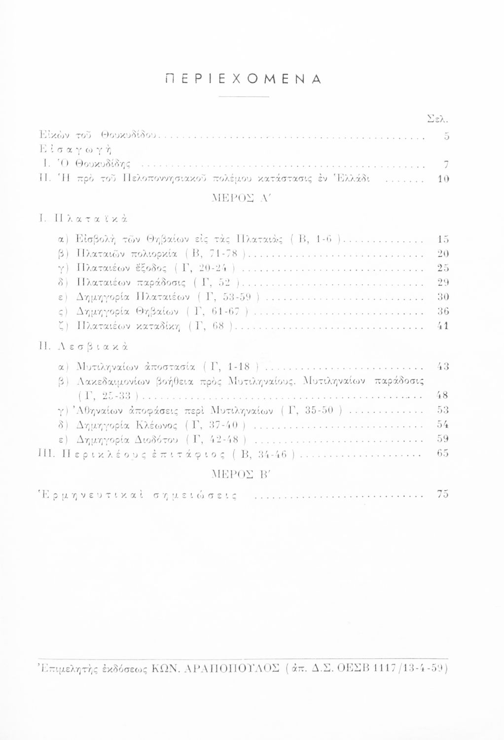 Σχολικό εγχειρίδιο Αρχαίων Ελληνικών που περιέχει εισαγωγή στη ζωή και το έργο του Θουκυδίδη, αποσπάσματα από τα Πλαταιϊκά, τα Λεσβιακά και τον Επιτάφιο του Περικλή και ερμηνευτικές σημειώσεις.