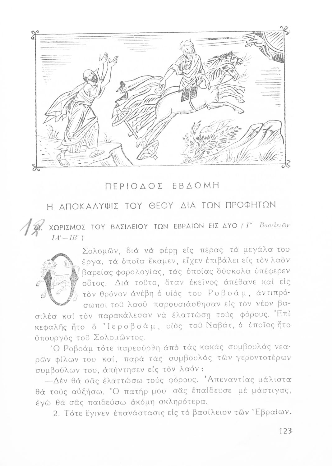 Σχολικό εγχειρίδιο Θρησκευτικών που συνιστά μία εξιστόρηση της Παλαιάς Διαθήκης από τη δημιουργία του κόσμου ως την υποταγή των Εβραίων στους Ρωμαίους.