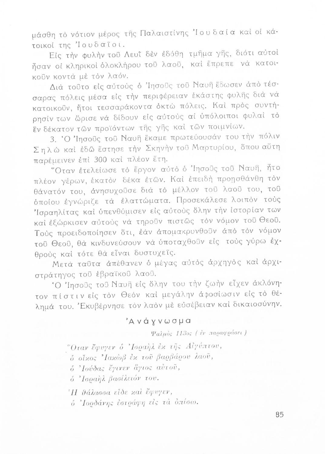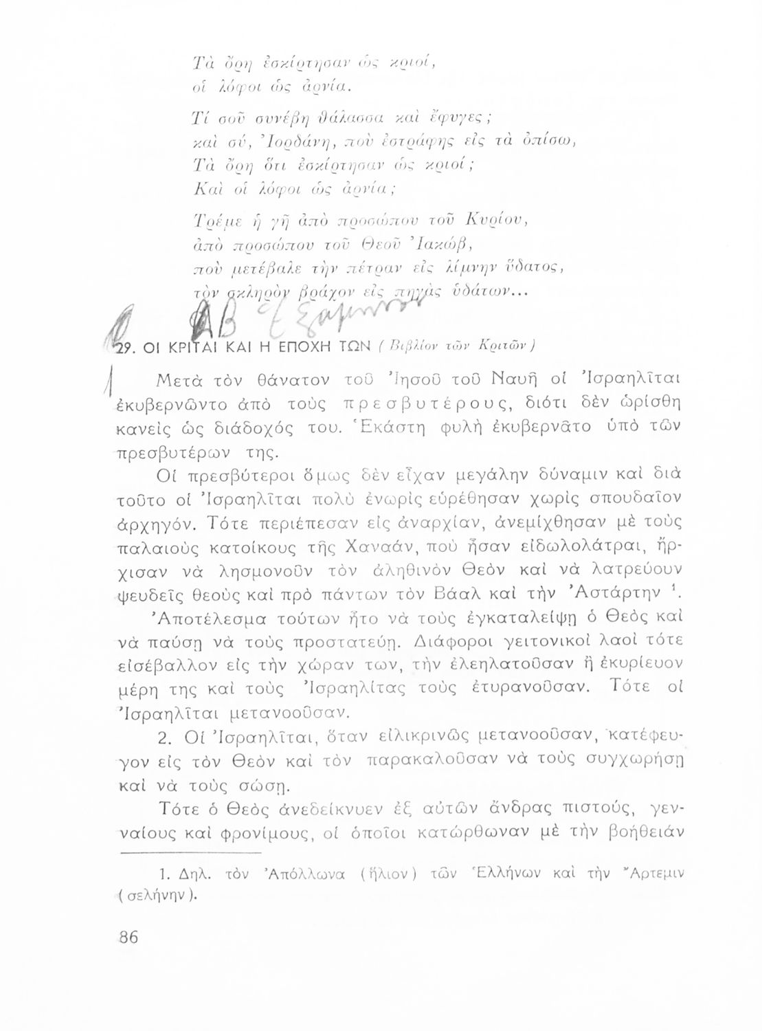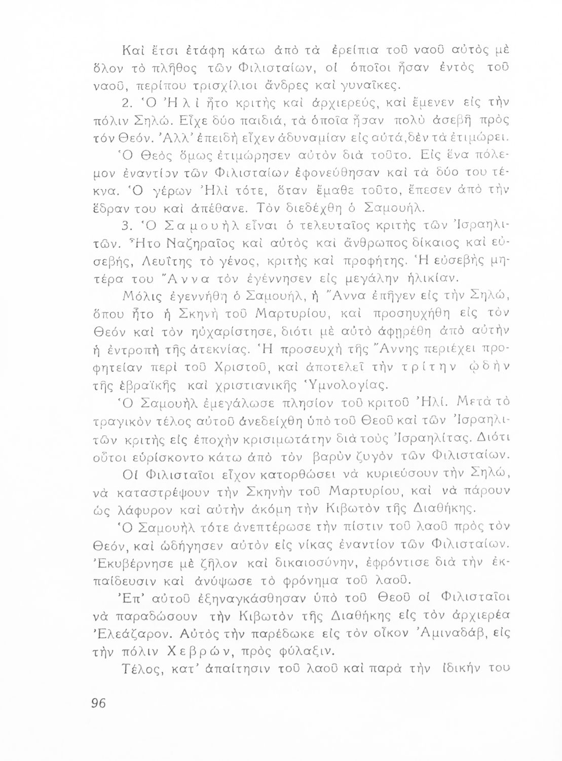 Σχολικό εγχειρίδιο Θρησκευτικών που συνιστά μία εξιστόρηση της Παλαιάς Διαθήκης από τη δημιουργία του κόσμου ως την υποταγή των Εβραίων στους Ρωμαίους. Περιέχει και στοιχεία γεωγραφίας της Παλαιστίνης.