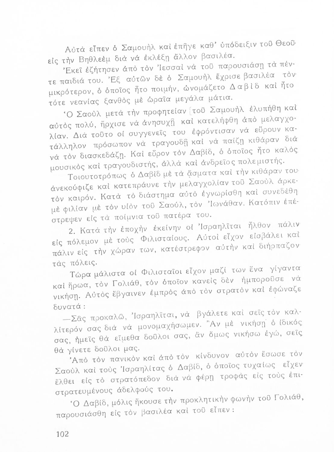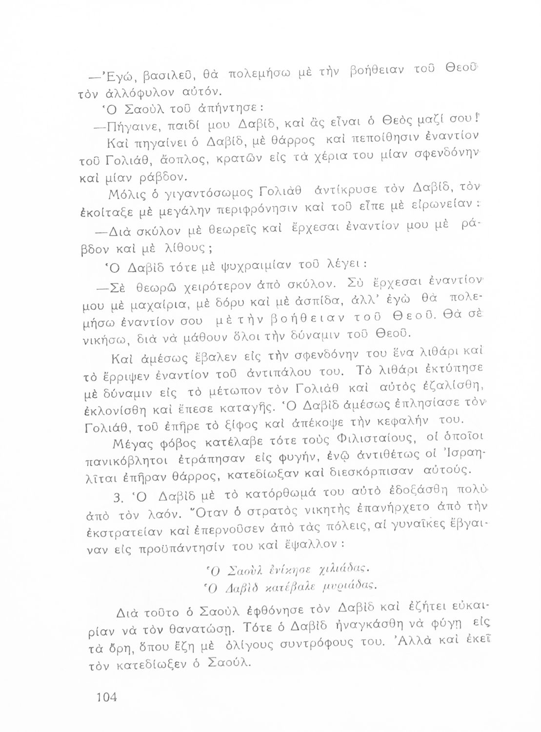 Σχολικό εγχειρίδιο Θρησκευτικών Δημοτικού που συνιστά μία εξιστόρηση της Παλαιάς Διαθήκης από τη δημιουργία του κόσμου ως τους Μακκαβαίους. Περιέχει και ποιήματα θρησκευτικού περιεχομένου.