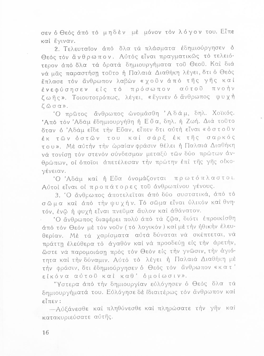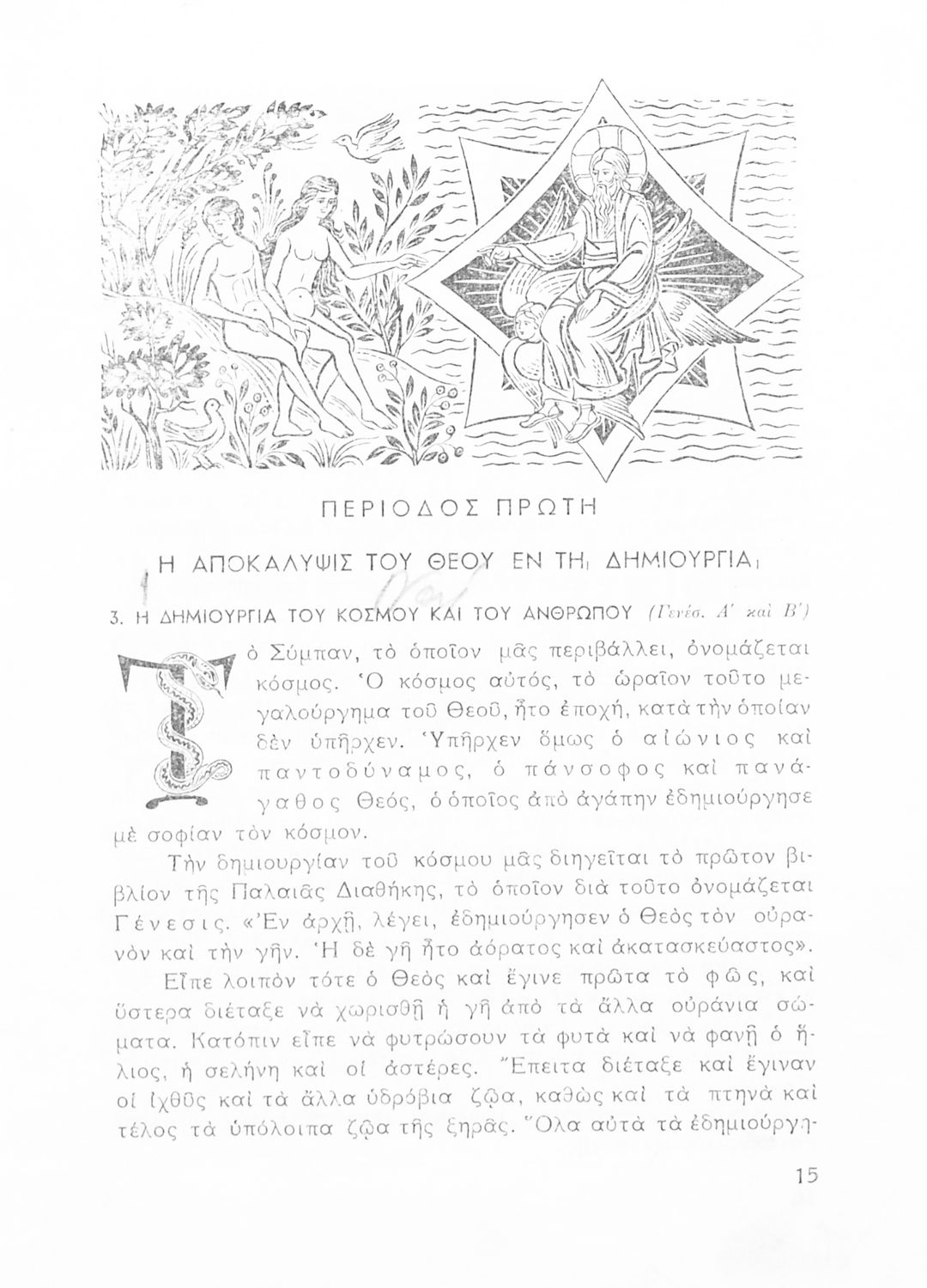Σχολικό εγχειρίδιο Θρησκευτικών που συνιστά μία εξιστόρηση της Παλαιάς Διαθήκης από τη δημιουργία του κόσμου ως τους Προφήτες. Φέρει το σύμβολο της δικτατορίας.