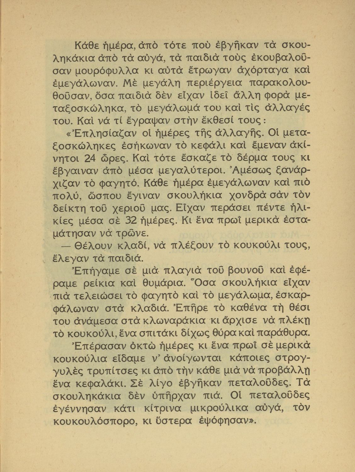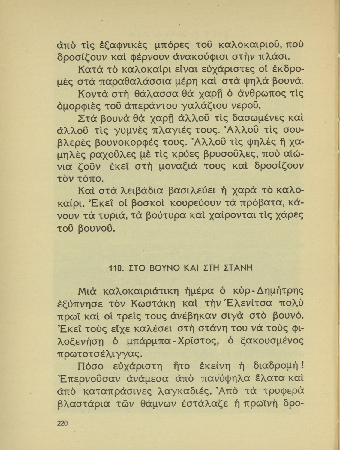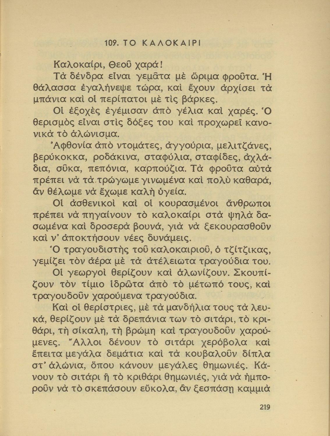 Αναγνωστικό Γ' Δημοτικού που είναι χωρισμένο σύμφωνα με τις εποχές του χρόνου και περιλαμβάνει ποιήματα και πεζά εμπνευσμένα από τη ζωή στην ύπαιθρο, την εθνική, οικογενειακή και κοινωνική ζωή, τη θρησκευτική παράδοση, τις ασχολίες των ανθρώπων, και την ελληνική φύση.