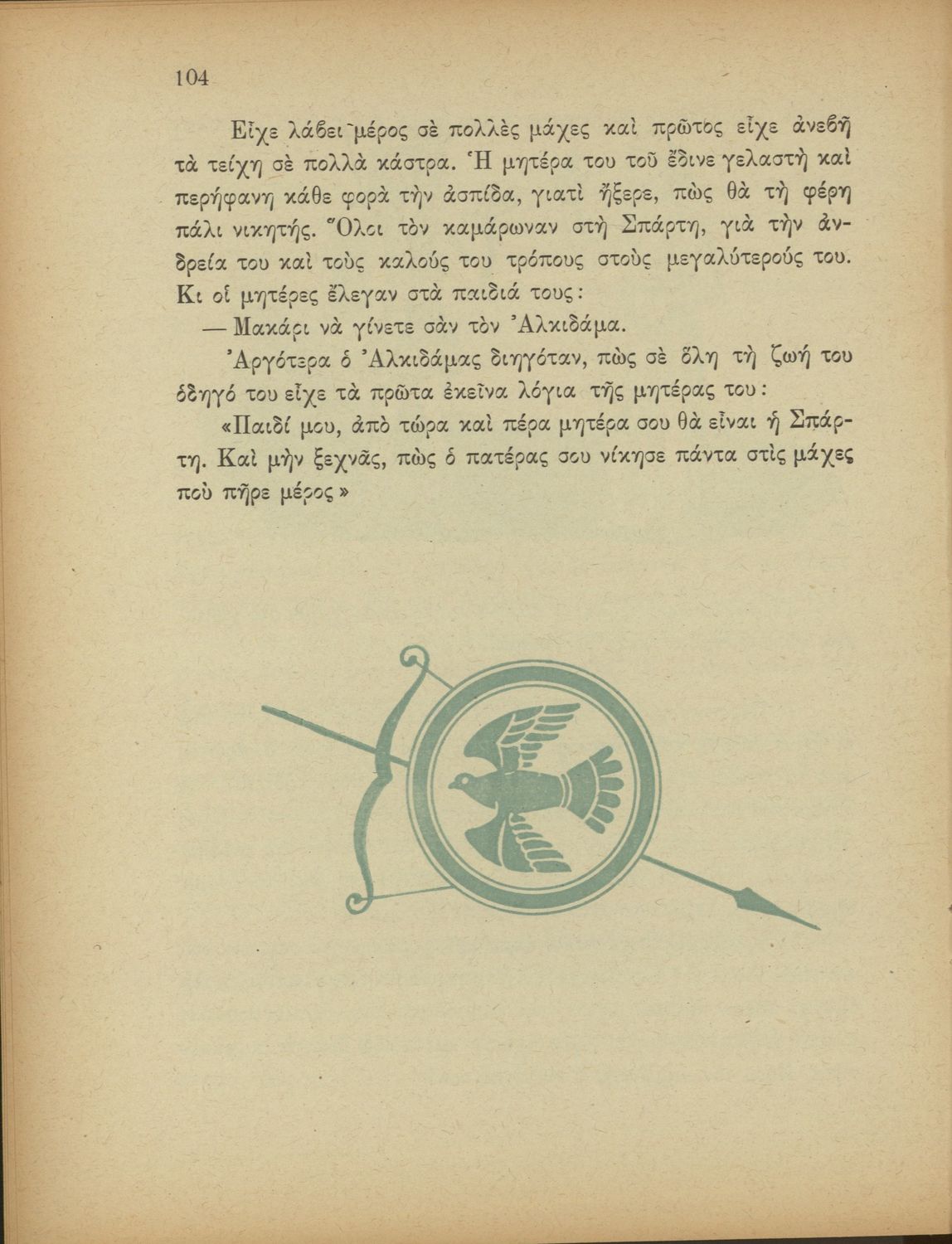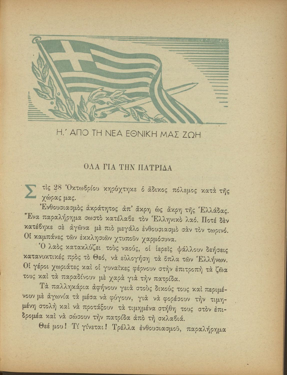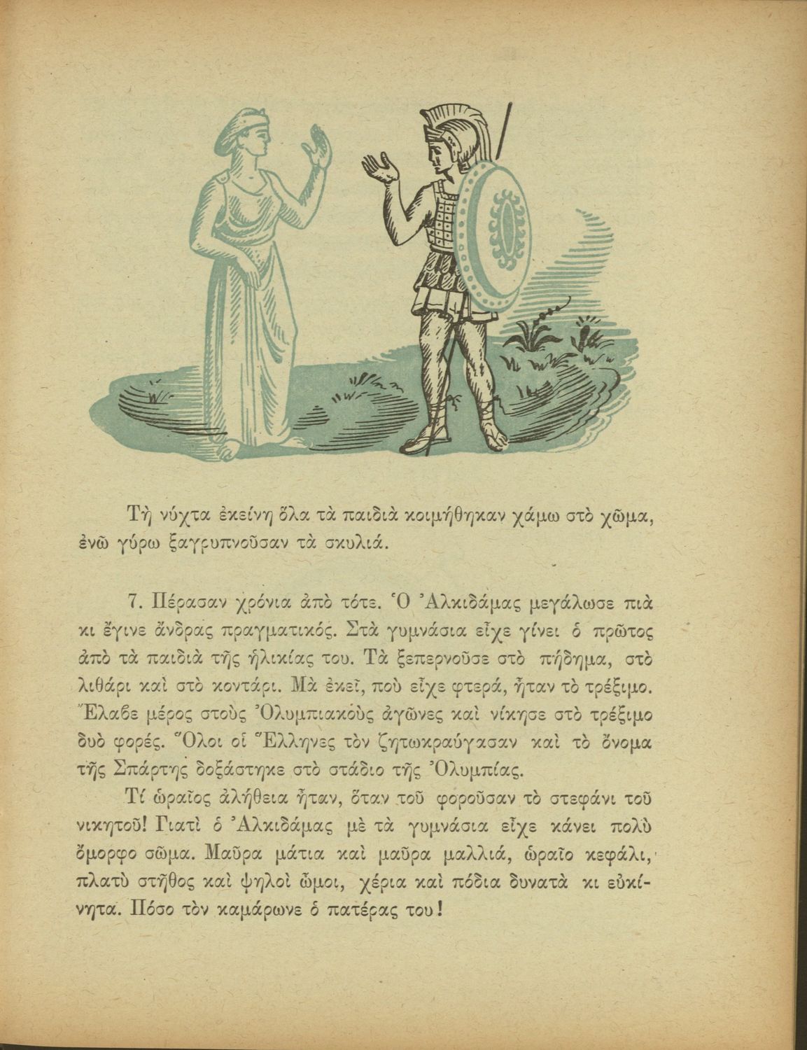 Αναγνωστικό Δ΄ Δημοτικού που περιέχει πεζά και ποιήματα εμπνευσμένα από την ελληνική ιστορία και μυθολογία, την κοινωνική ζωή και την ελληνική φύση.