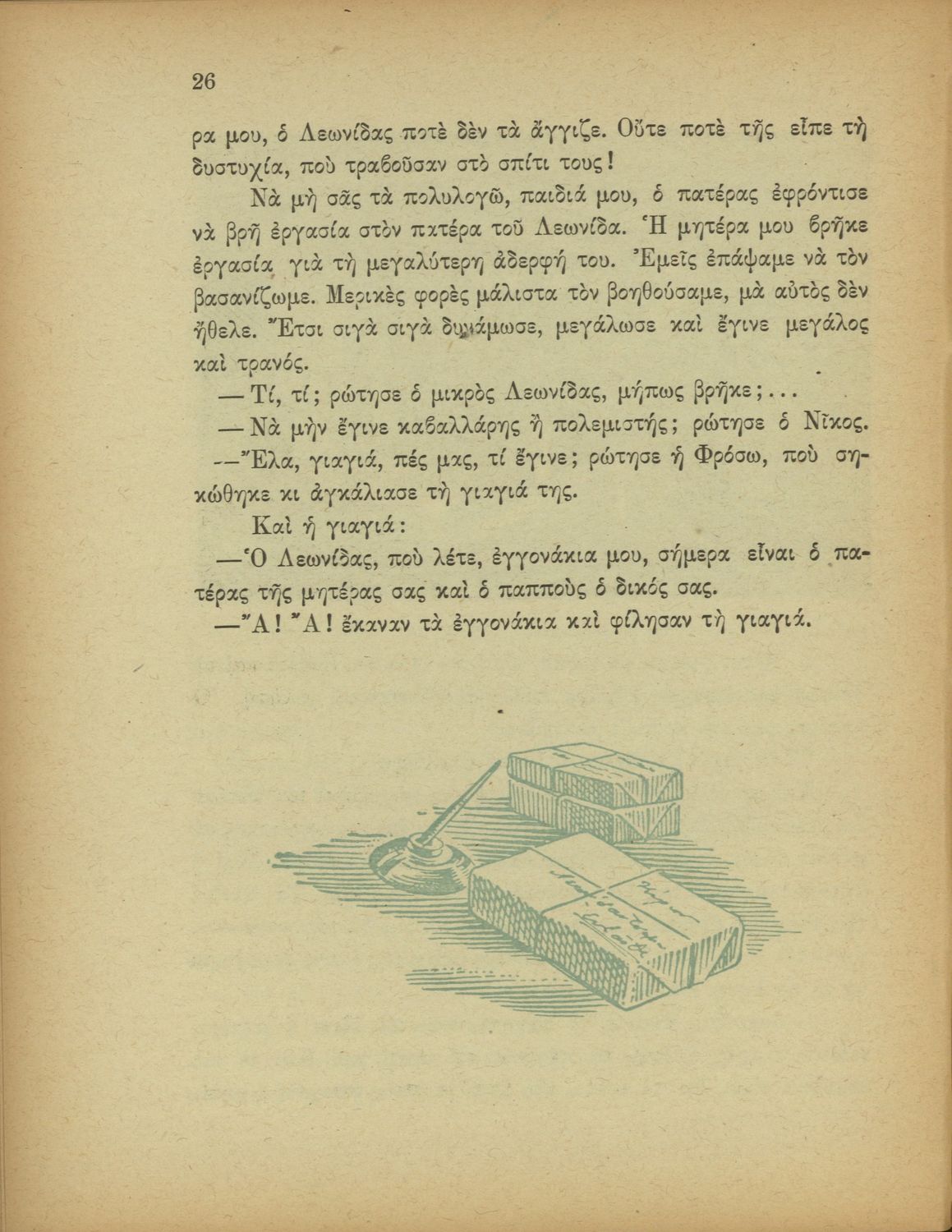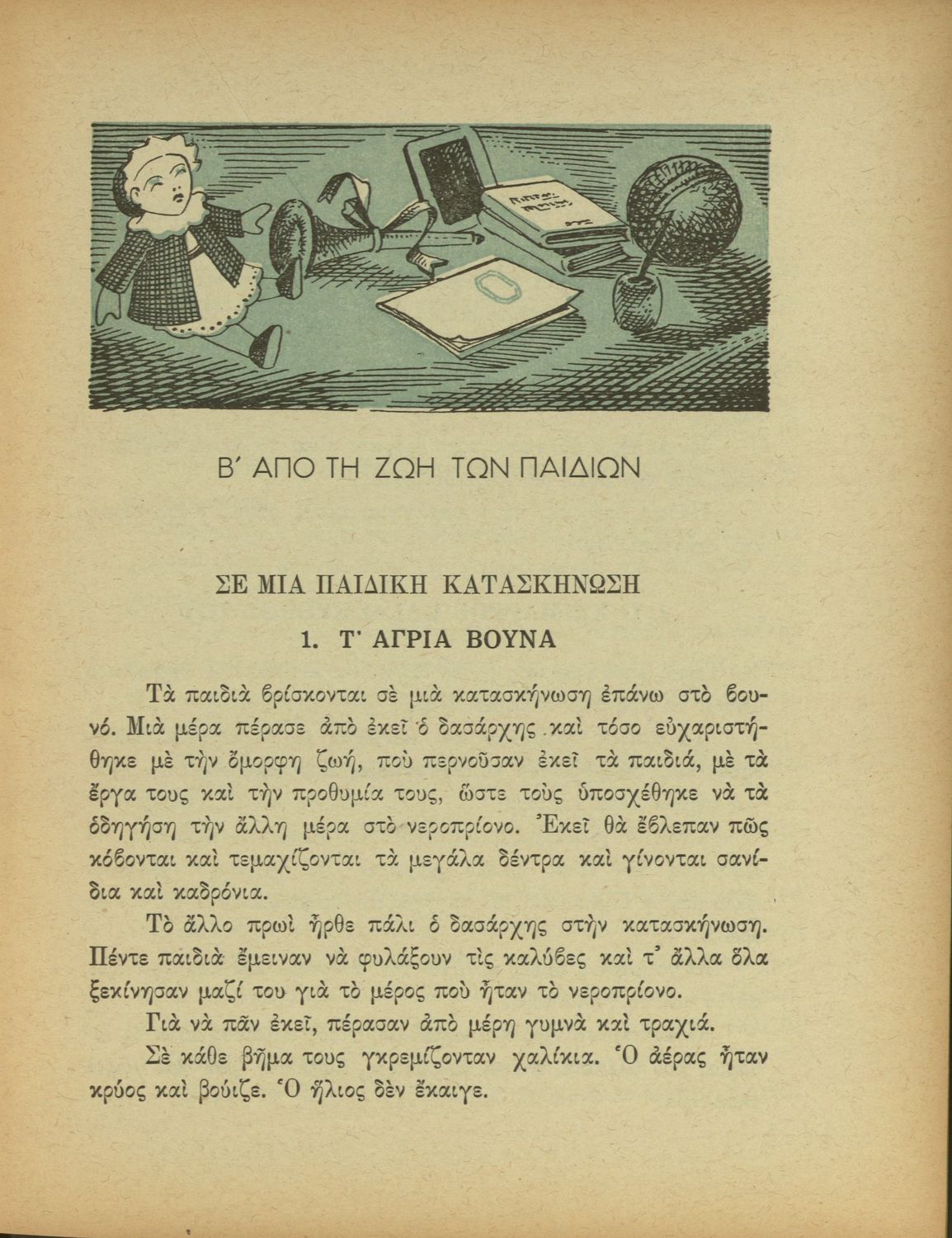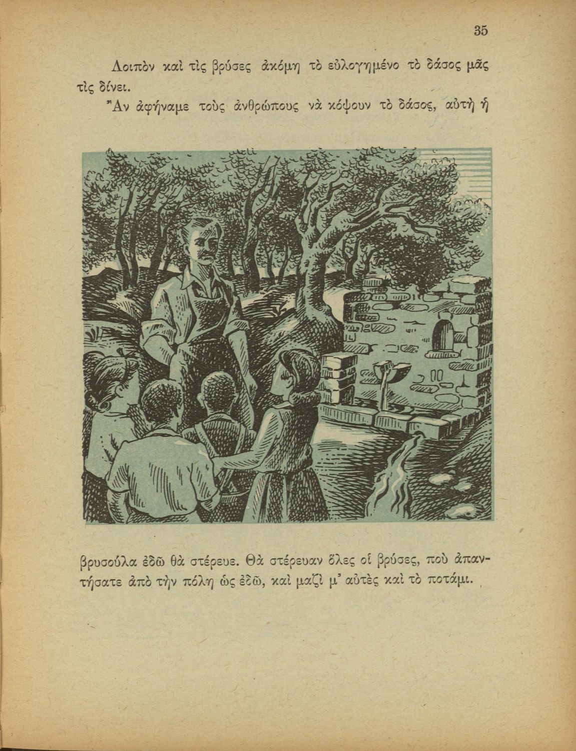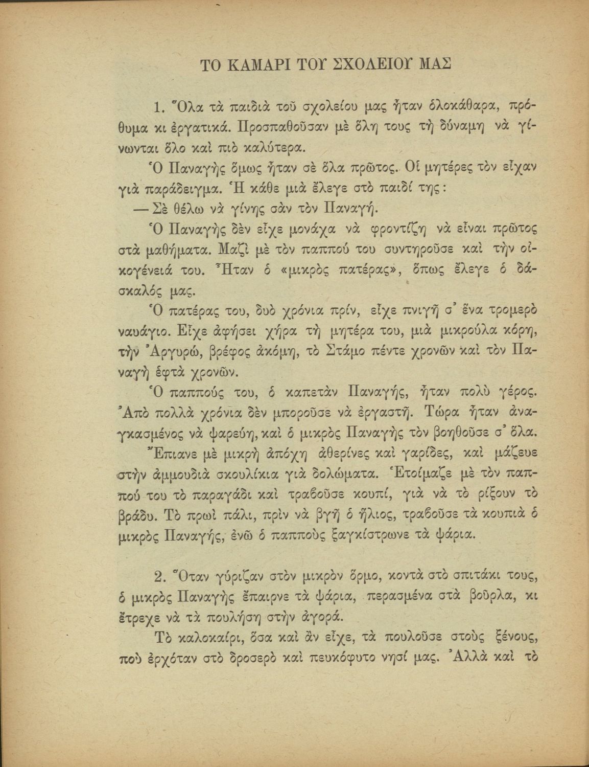 Αναγνωστικό Δ΄ Δημοτικού που περιέχει πεζά και ποιήματα με περιεχόμενο διδακτικό και ηθικοπλαστικό εμπνευσμένα από την ελληνική ιστορία και μυθολογία, και την αγροτική και κοινωνική ζωή.