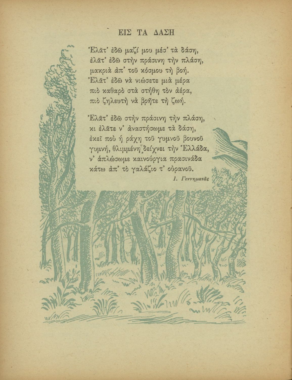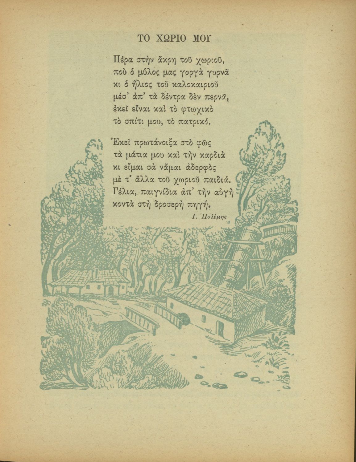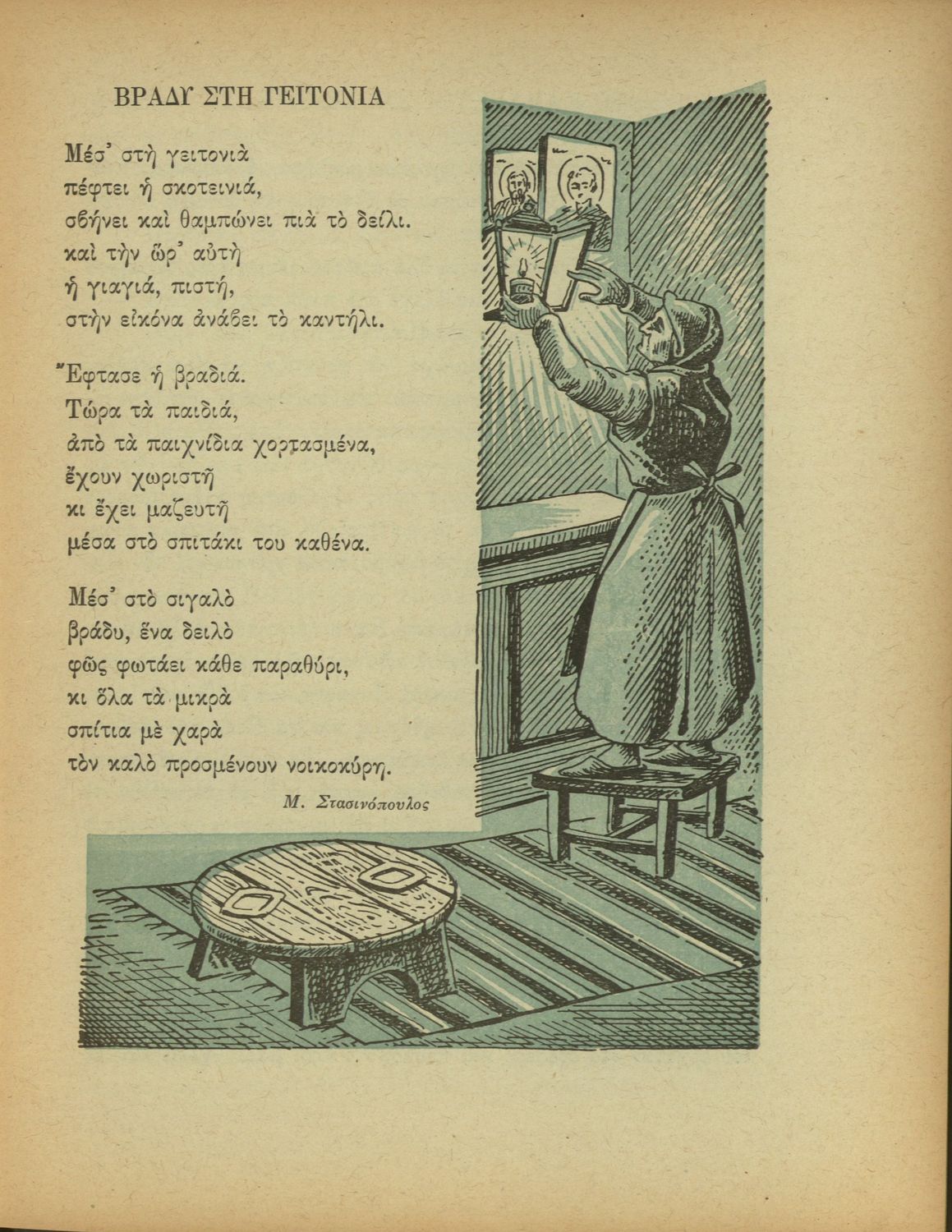 Αναγνωστικό για την Δ΄ τάξη του Δημοτικού. Περιλαμβάνει ένα κείμενο στο οποίο παρεμβάλλονται ποιήματα δημοτικά και Ελλήνων ποιητών.