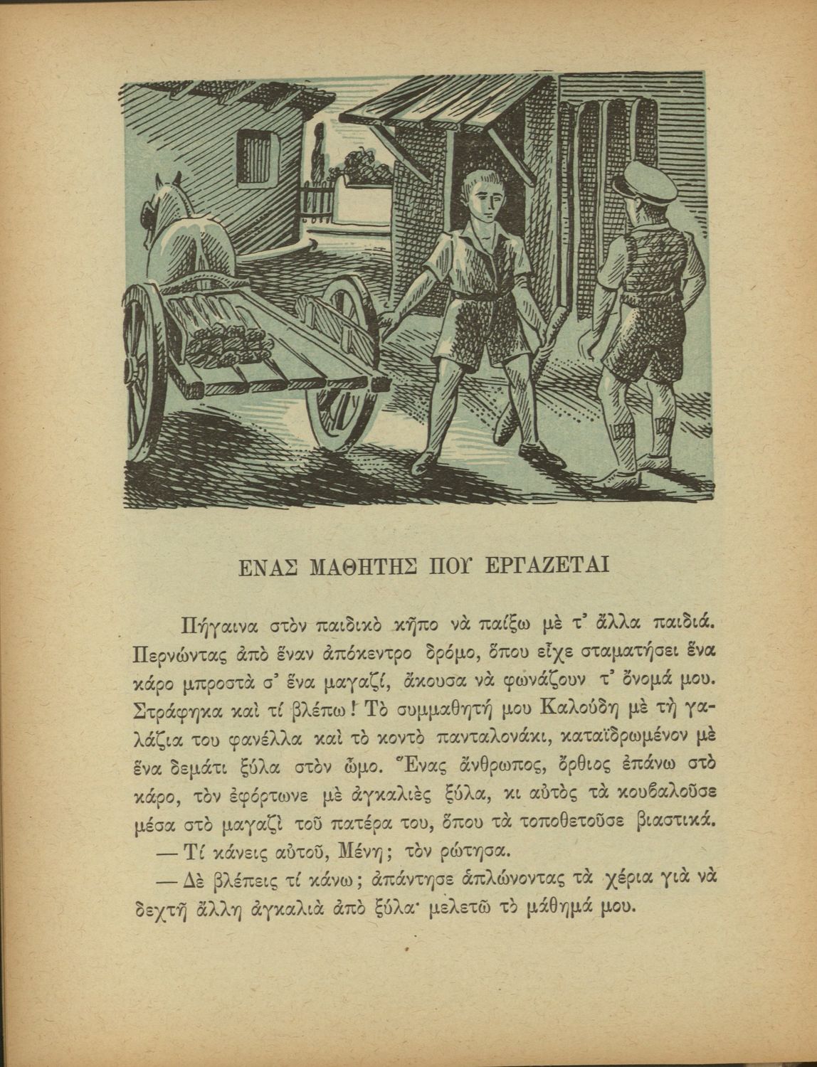 Αναγνωστικό Δ΄ Δημοτικού που περιέχει πεζά και ποιήματα εμπνευσμένα από την ελληνική ιστορία και μυθολογία, την κοινωνική ζωή και την ελληνική φύση.