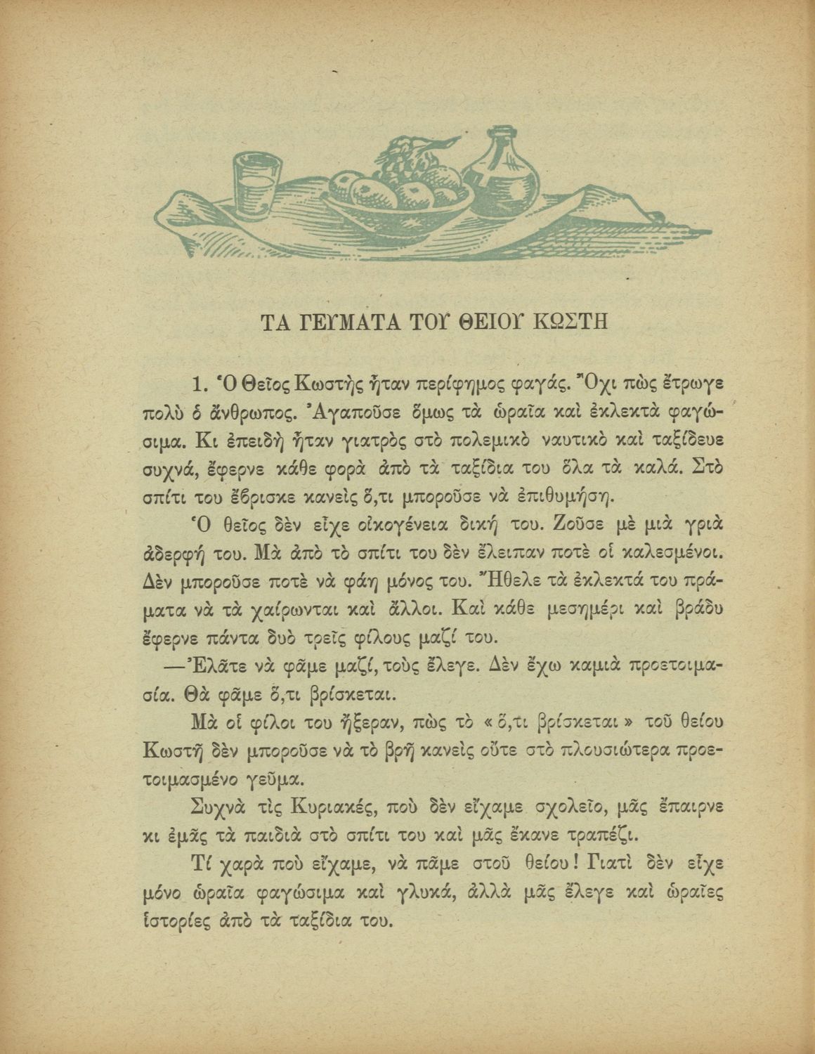 Αναγνωστικό Δ΄ Δημοτικού που περιέχει πεζά και ποιήματα εμπνευσμένα από την ελληνική ιστορία και μυθολογία, την κοινωνική ζωή και την ελληνική φύση.