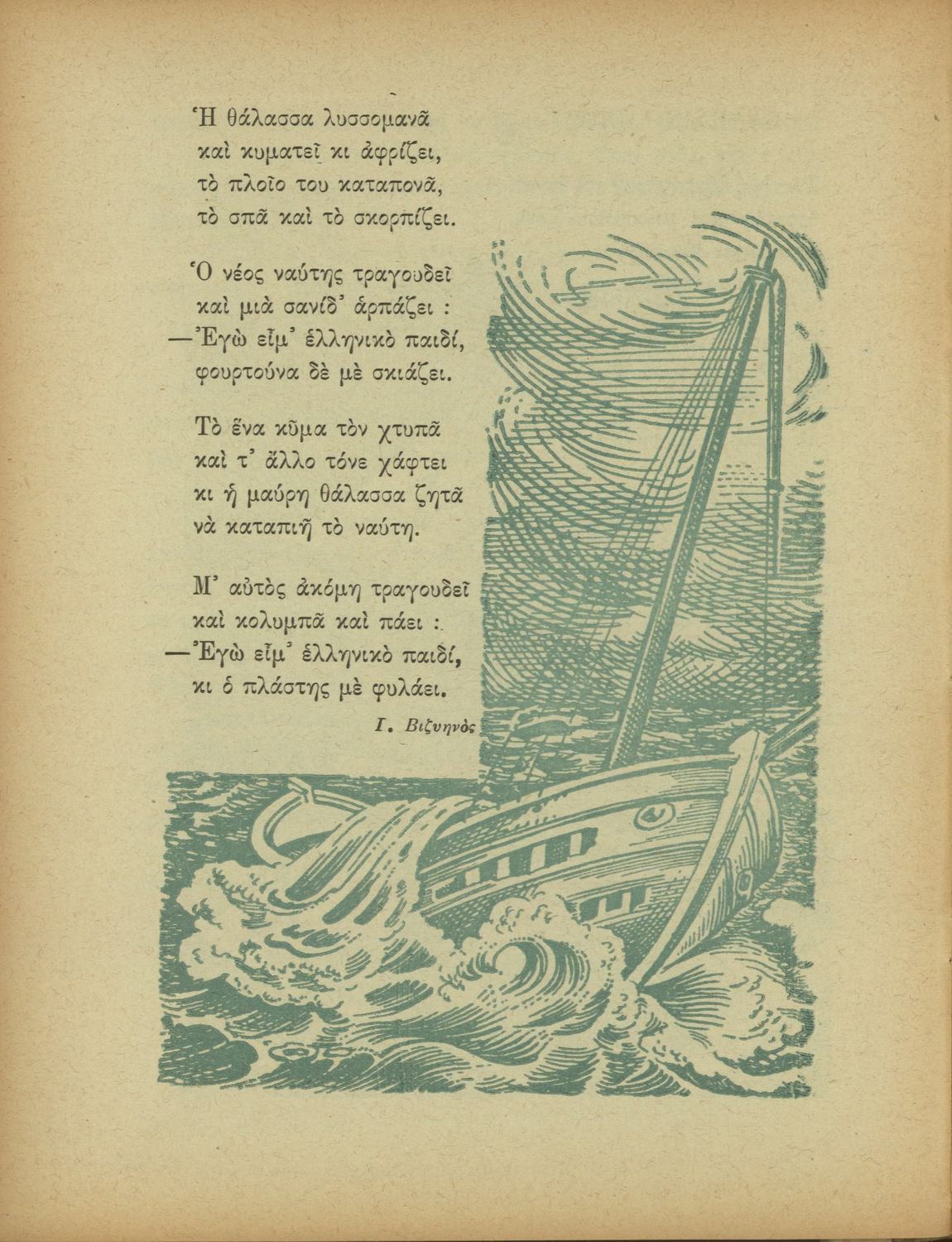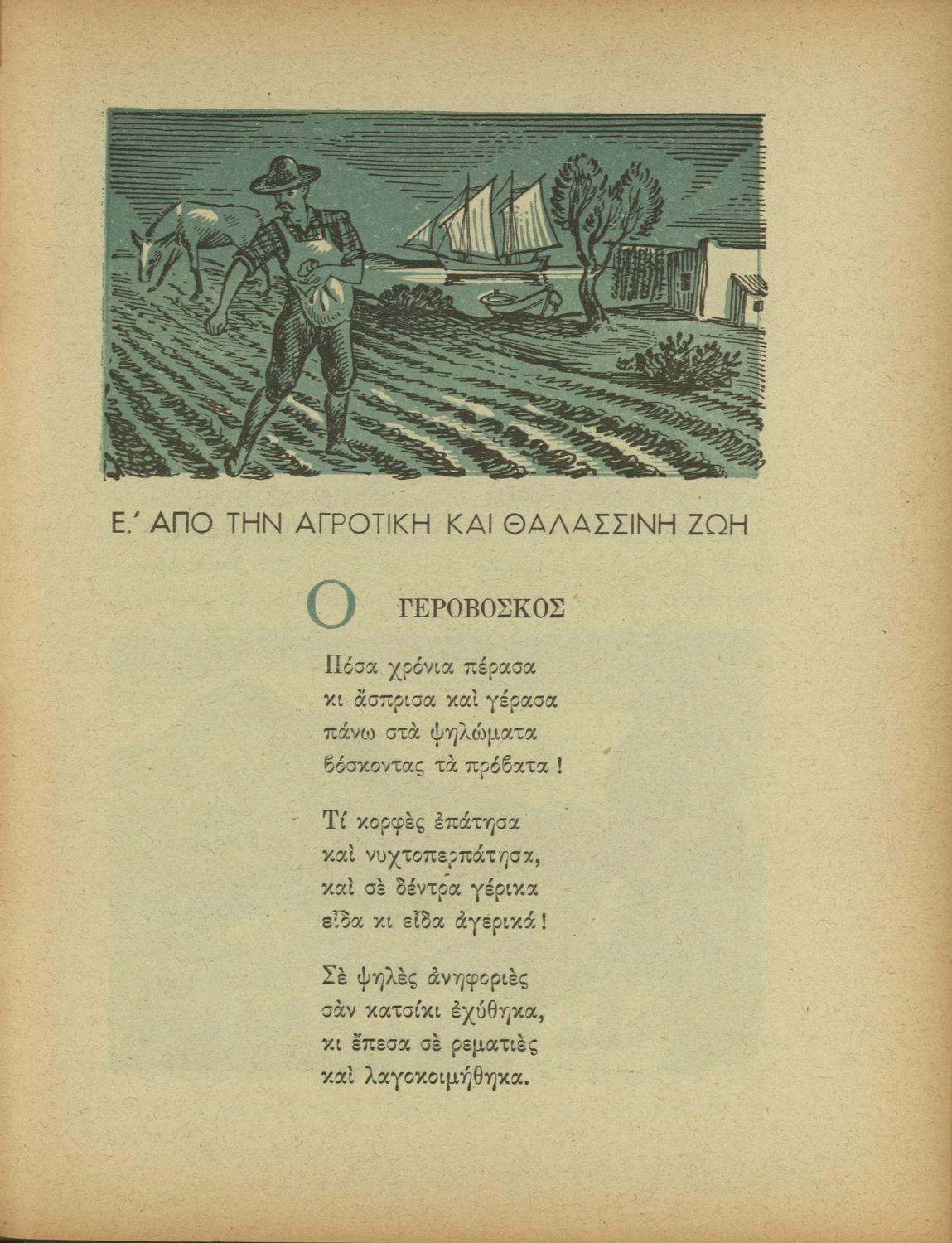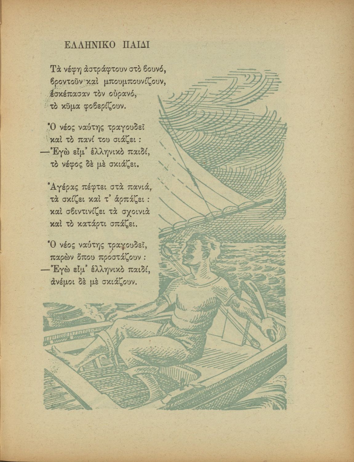 Αναγνωστικό για την Δ΄ τάξη του Δημοτικού. Περιλαμβάνει ένα κείμενο στο οποίο παρεμβάλλονται ποιήματα δημοτικά και Ελλήνων ποιητών.