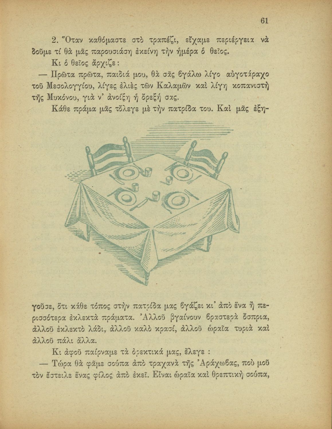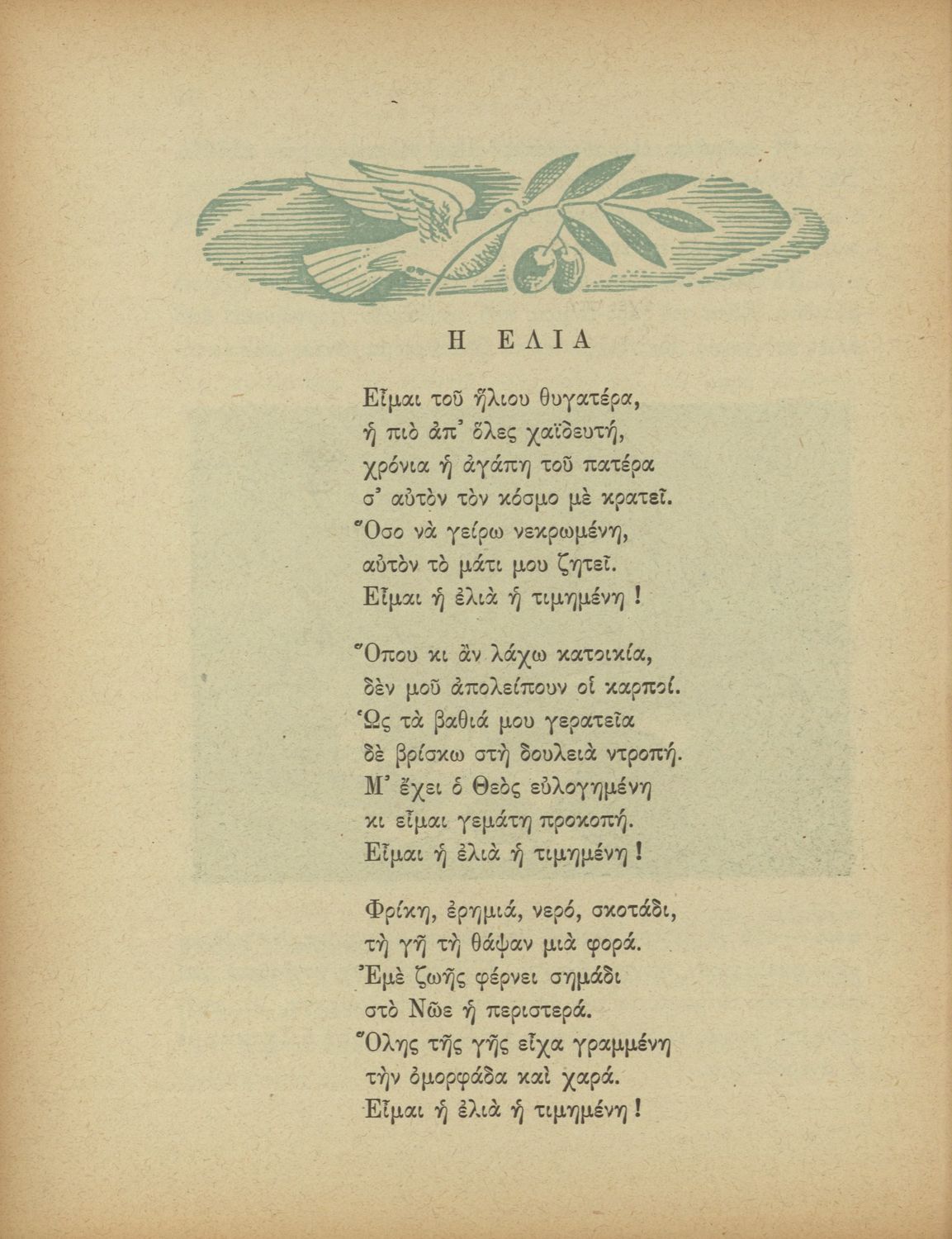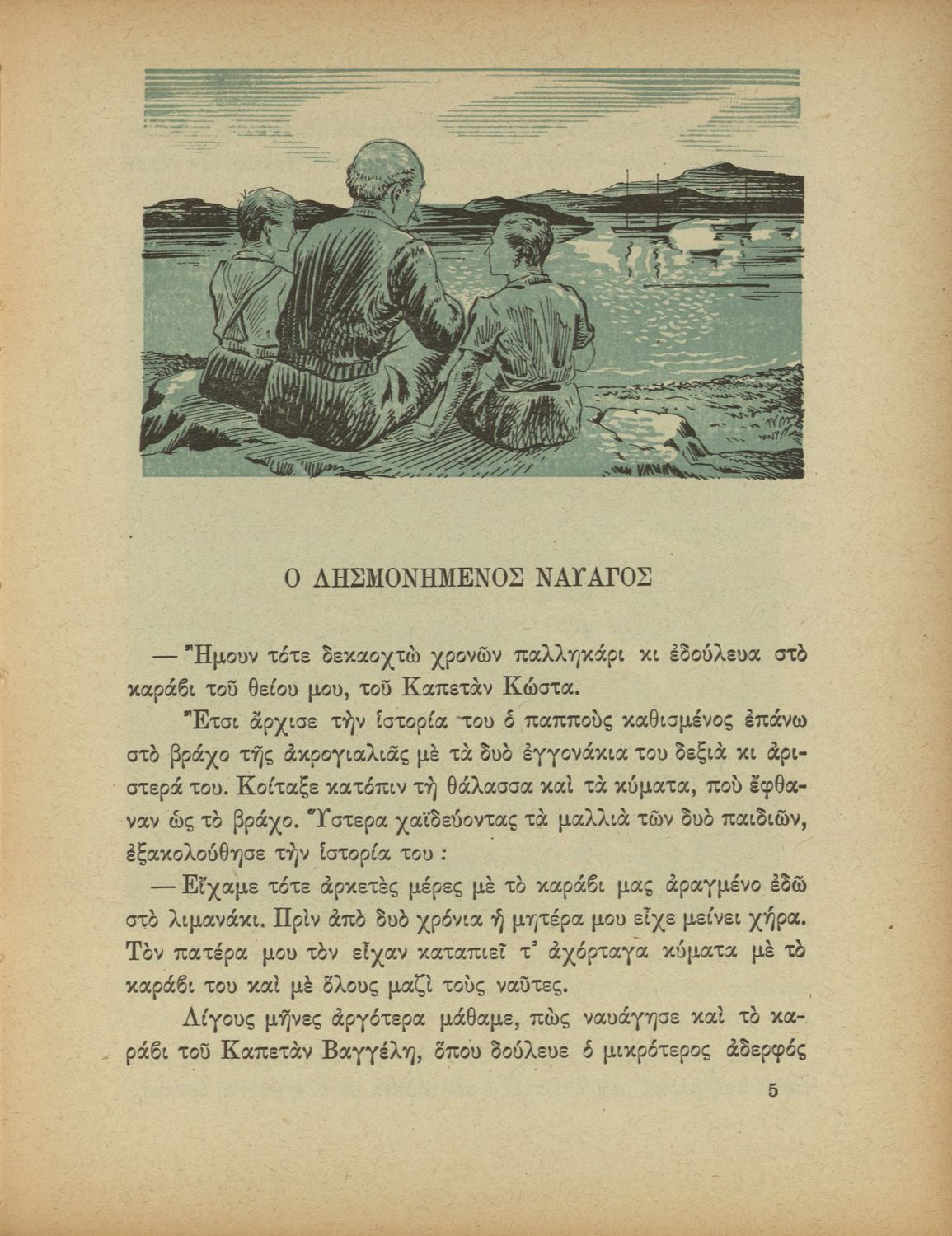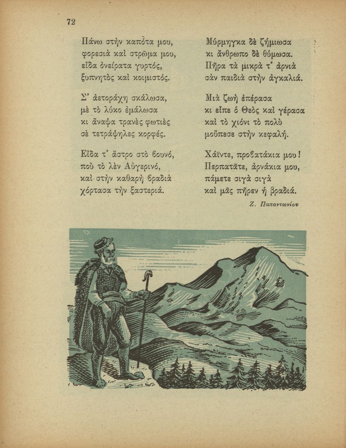 Αναγνωστικό για την Δ΄ τάξη του Δημοτικού. Περιλαμβάνει ένα κείμενο στο οποίο παρεμβάλλονται ποιήματα δημοτικά και Ελλήνων ποιητών.