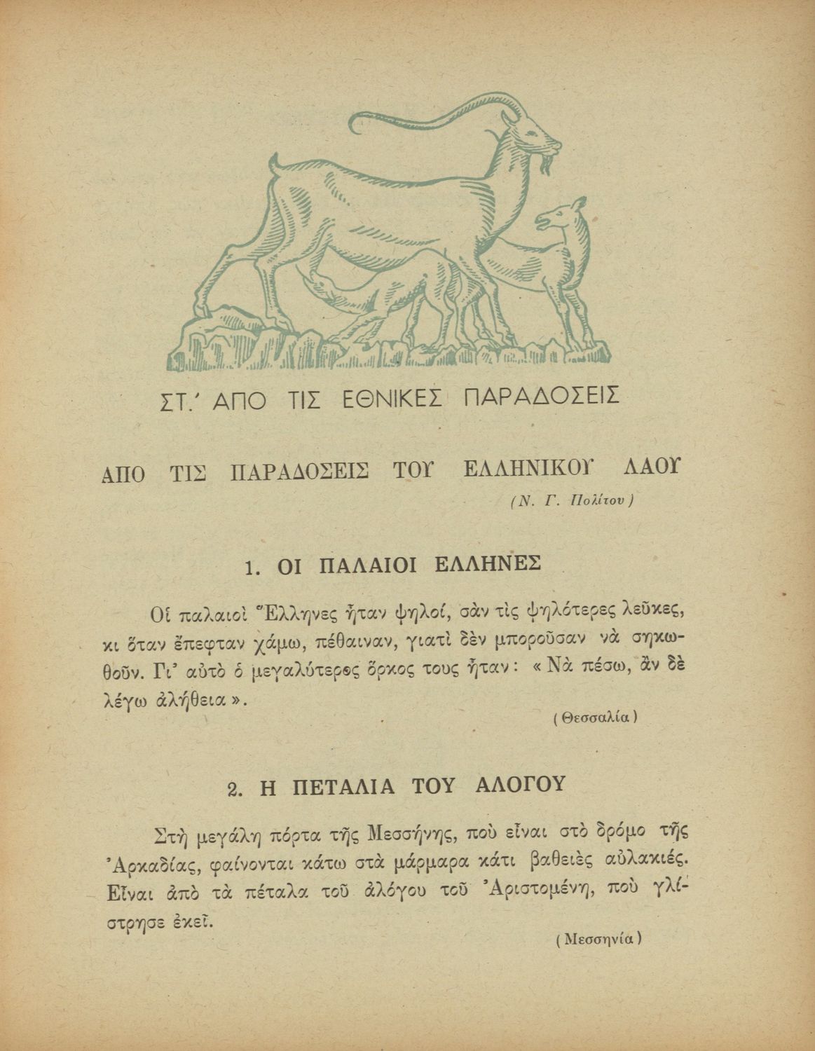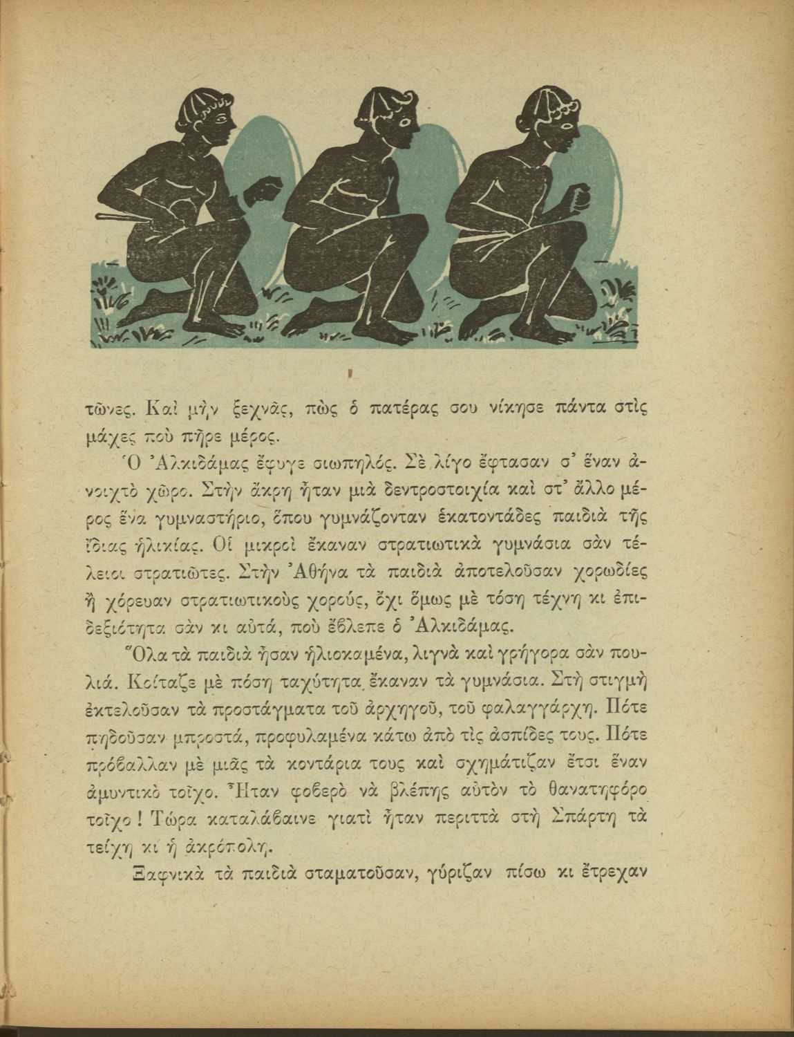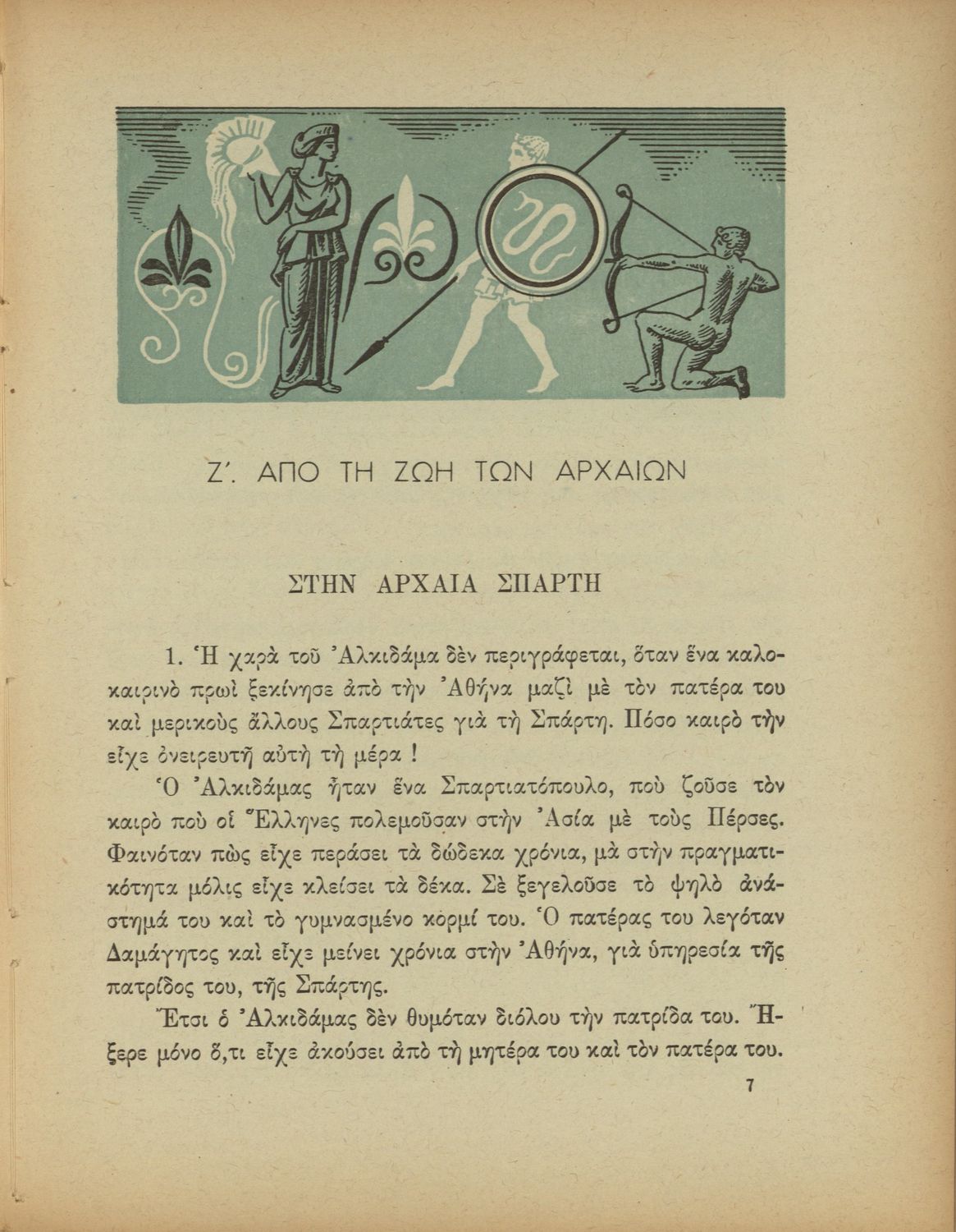 Αναγνωστικό Δ΄ Δημοτικού που περιέχει πεζά και ποιήματα εμπνευσμένα από την ελληνική ιστορία και μυθολογία, την κοινωνική ζωή και την ελληνική φύση.