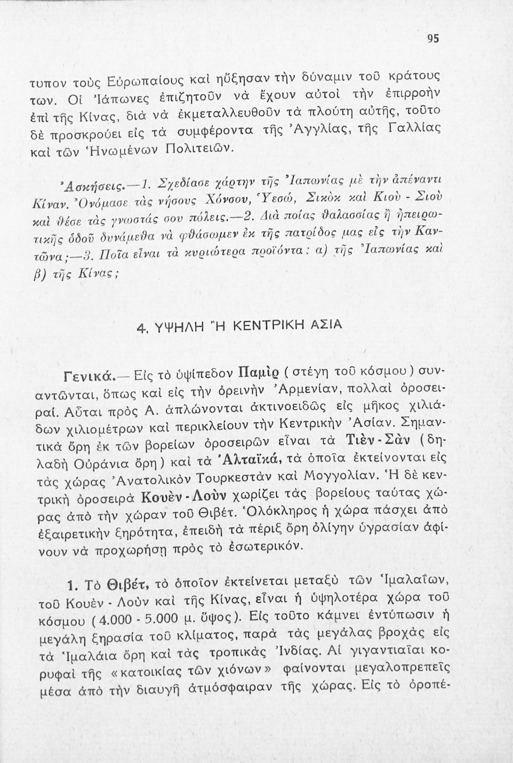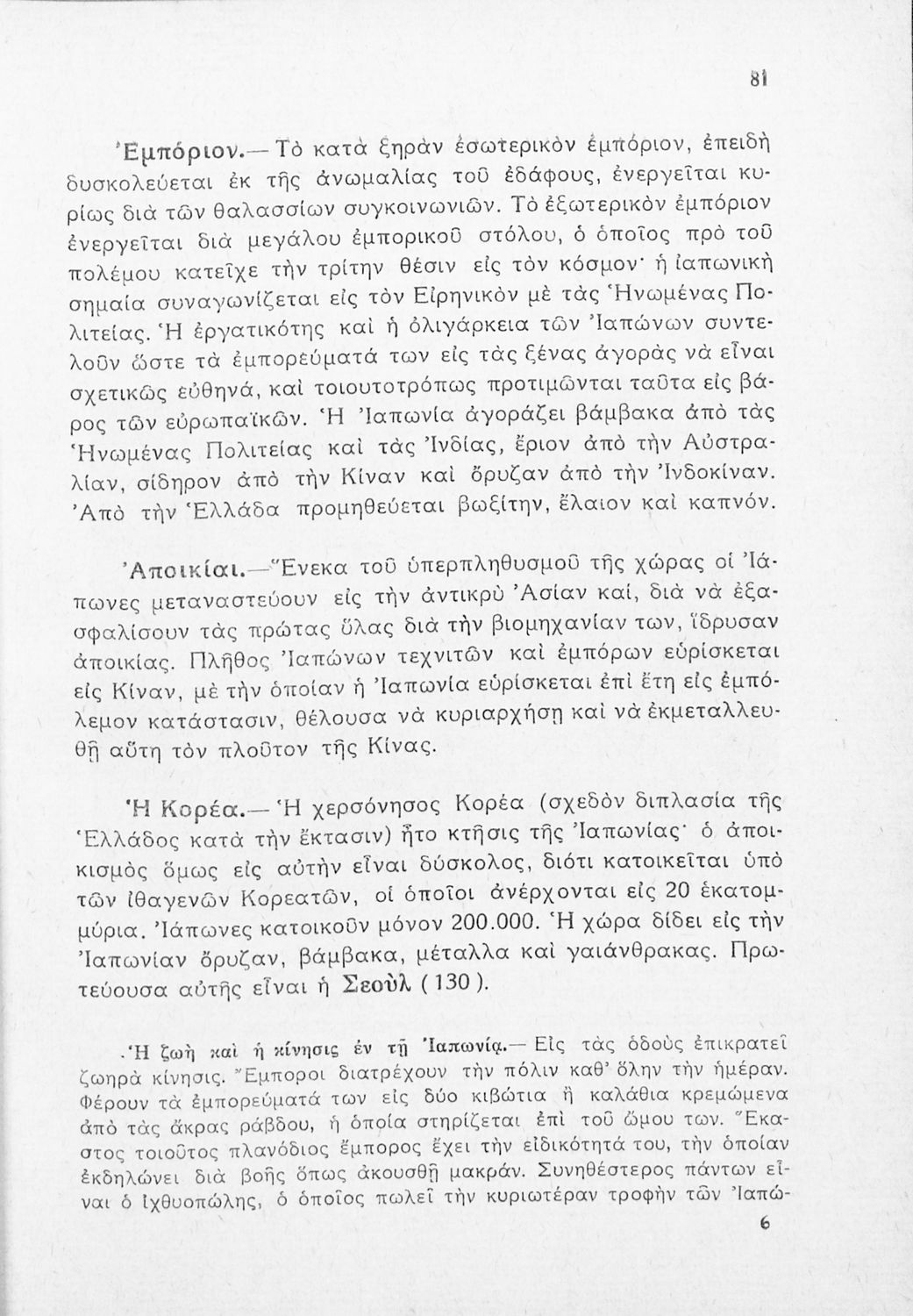 Βαθμίδα εκπαίδευσης: Δευτεροβάθμια Τάξη: Γ' Γυμνασίου Μάθημα: Γεωγραφία Γλώσσα: Απλή καθαρεύουσα Παρουσίαση περιεχομένου: Σχολικό εγχειρίδιο Γεωγραφίας Γ΄ Γυμνασίου που παρουσιάζει τις ηπείρους εκτός της Ευρώπης από γεωφυσική, πολιτική, πολιτισμική και οικονομική σκοπιά. Γίνεται ειδική αναφορά στις παγκόσμιες συγκοινωνίες. |