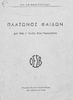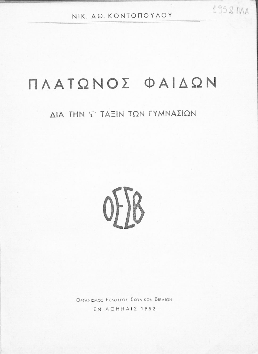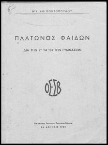 Κωδικός αναγνώρισης: 02-00901 Τίτλος: Πλάτωνος Φαίδων : διά την ΣΤ΄ τάξιν των Γυμνασίων Συγγραφέας: Πλάτων, Νικόλαος Αθ. Κοντόπουλος (σχόλια) Μέγεθος και υπόστρωμα: Σχολικό εγχειρίδιο, μαλακό εξώφυλλο, 104 σελίδες. |