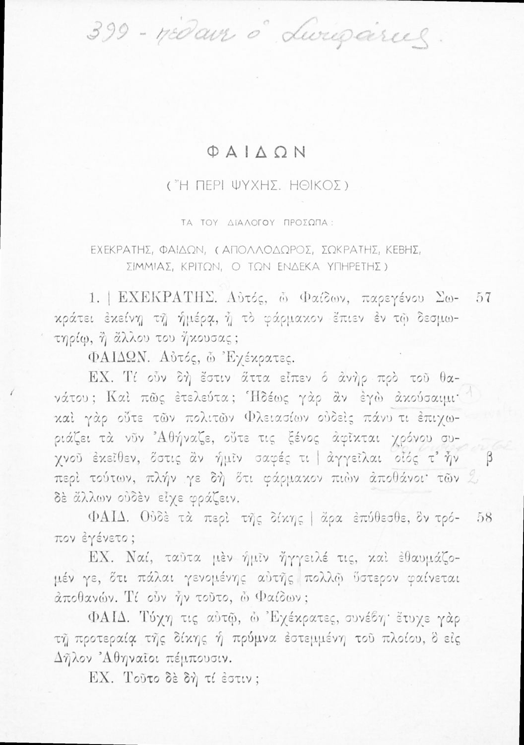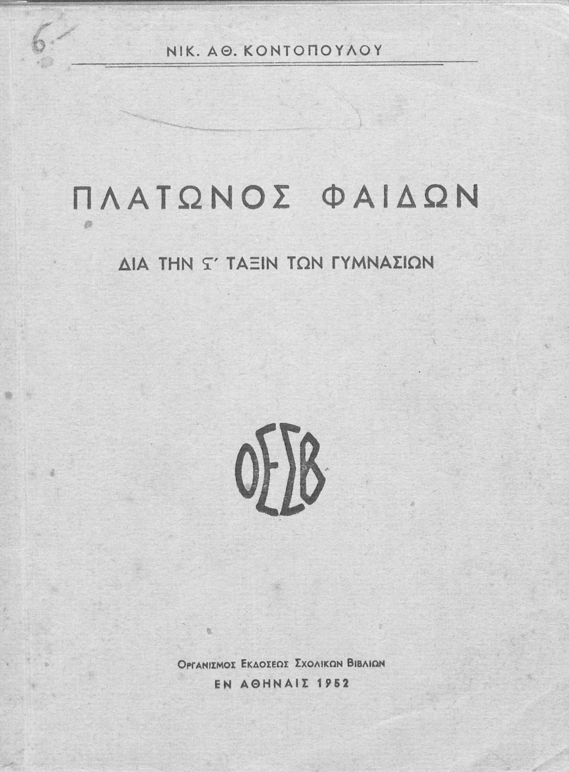 Σχολικό εγχειρίδιο Αρχαίων Ελληνικών της ΣΤ΄ Γυμνασίου το οποίο περιλαμβάνει το έργο του Πλάτωνα Φαίδων και ερμηνευτικές σημειώσεις.