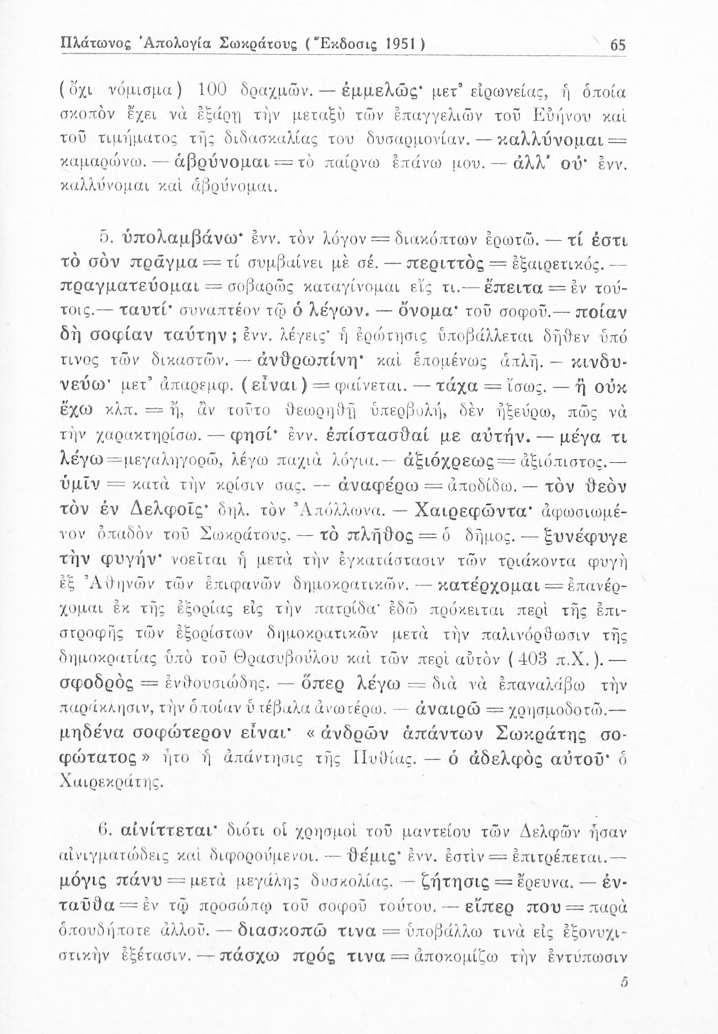 Σχολικό εγχειρίδιο Αρχαίων Ελληνικών της Ε΄ Γυμνασίου το οποίο περιλαμβάνει τα έργα του Πλάτωνα, Απολογία Σωκράτους και Κρίτων και ερμηνευτικές παρατηρήσεις.