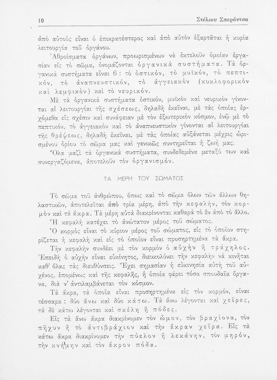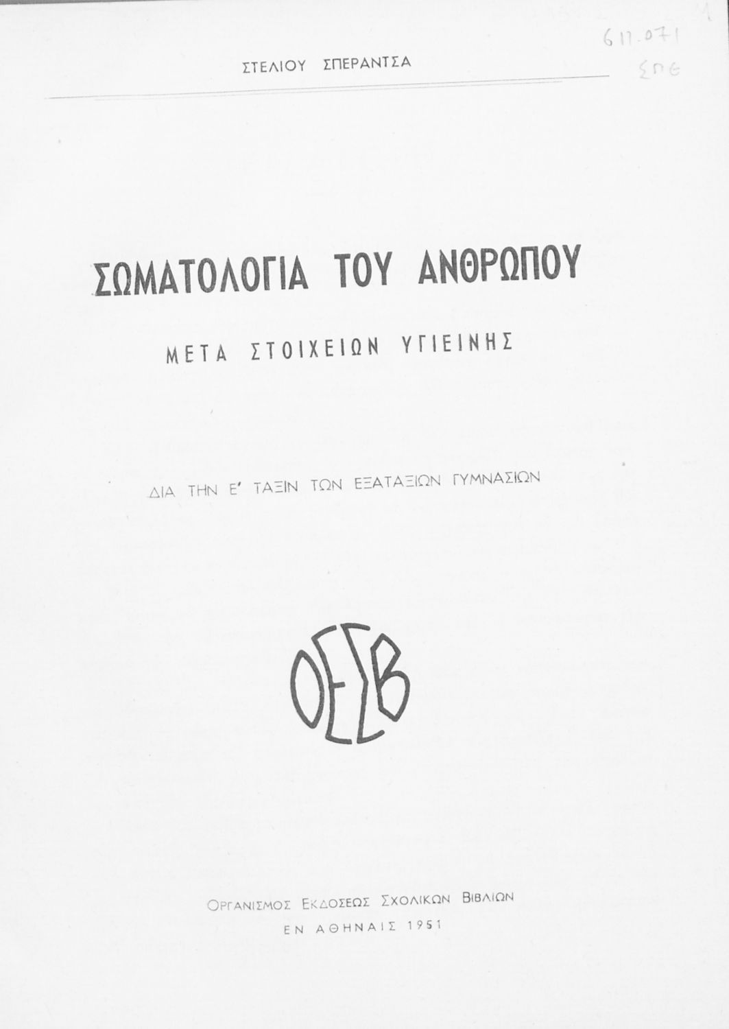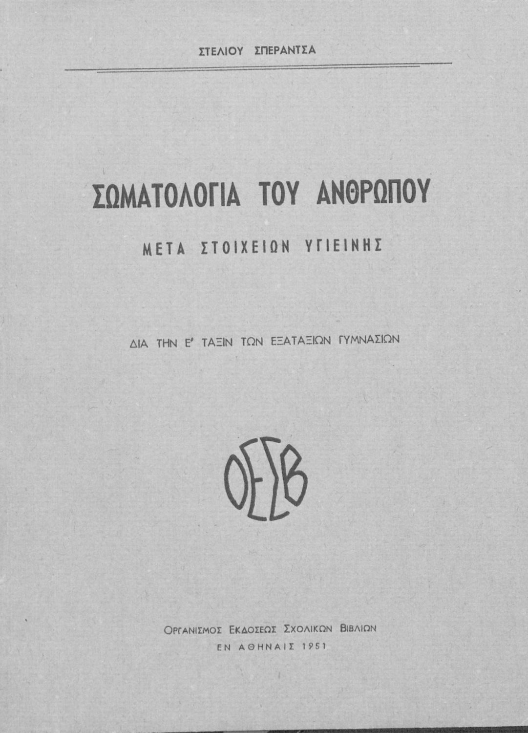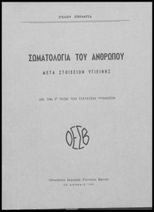 Κωδικός αναγνώρισης: 02-00918 Τίτλος: Σωματολογία του ανθρώπου μετά στοιχείων υγιεινής για την Ε΄ τάξιν των Εξαταξίων Γυμνασίων Συγγραφέας: Στέλιος Σπεράντσας Μέγεθος και υπόστρωμα: Σχολικό εγχειρίδιο, 168 σελίδες. Σκίτσα (ασπρόμαυρα). |