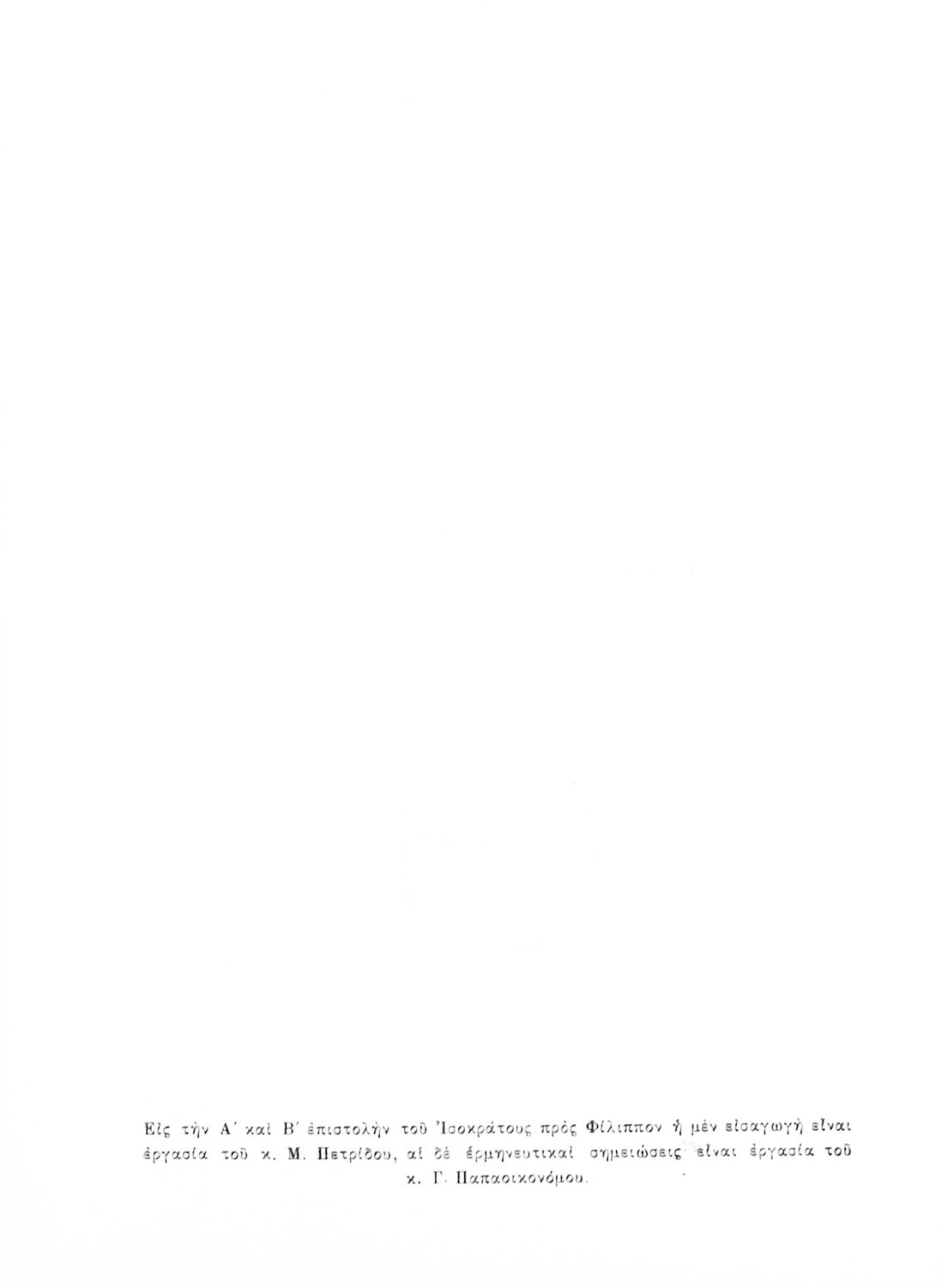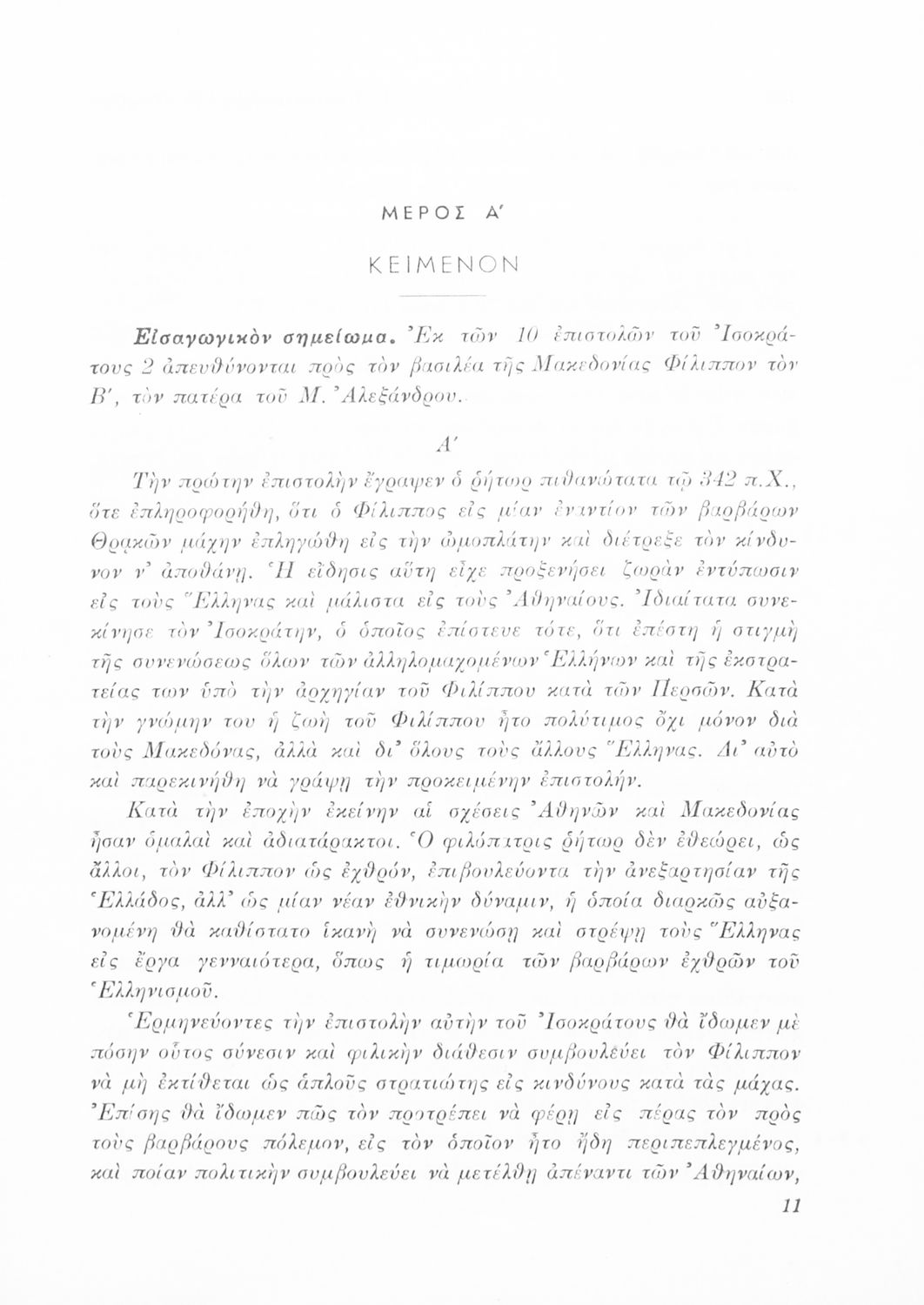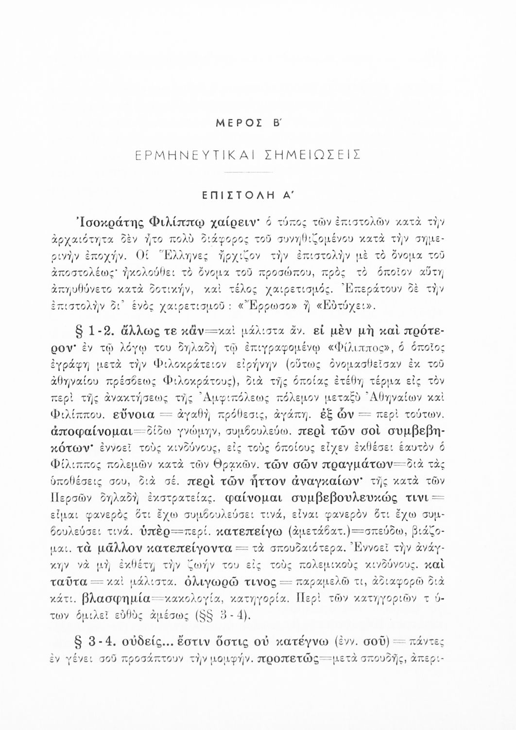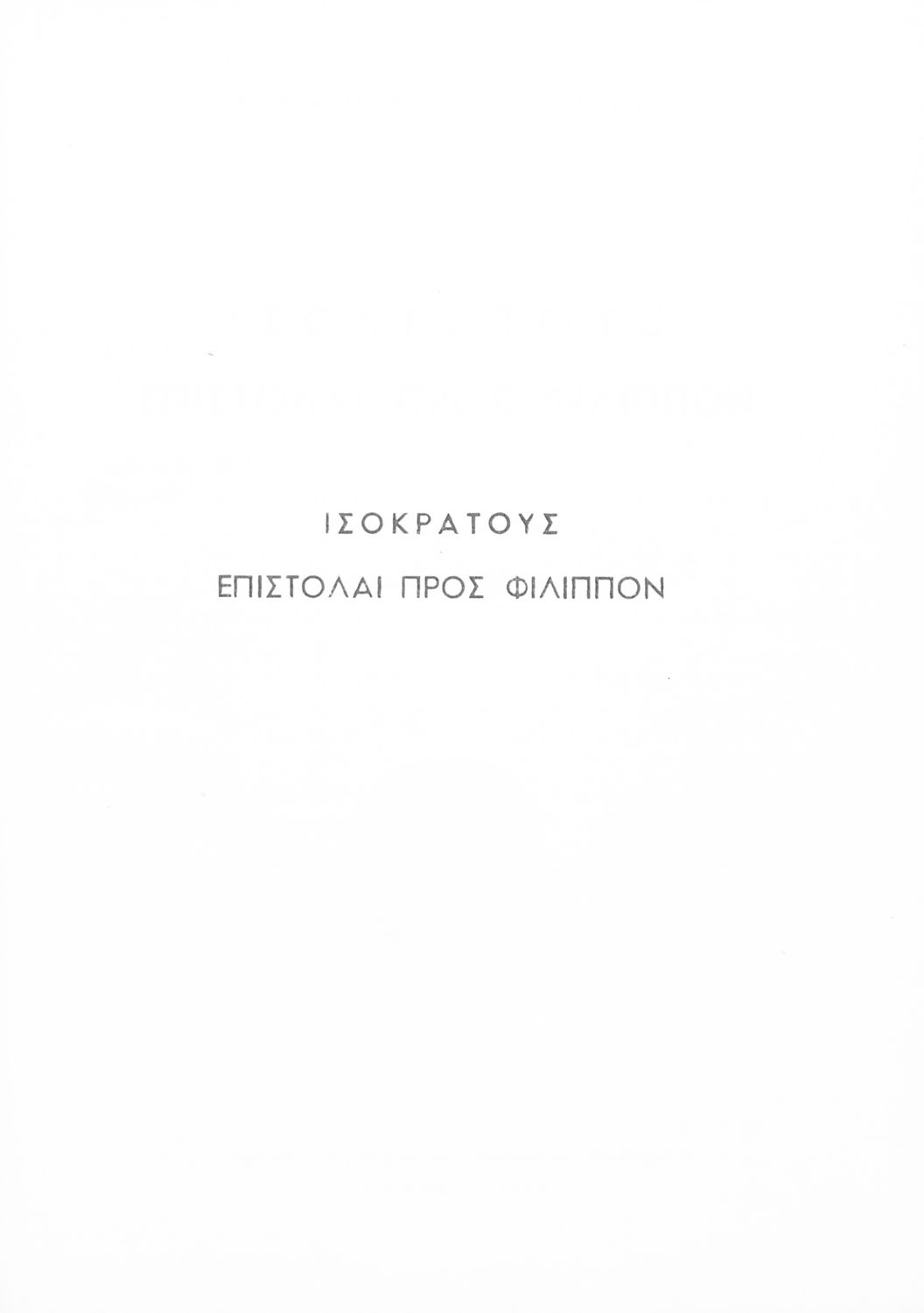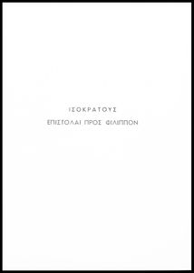 Σχολικό εγχειρίδιο Αρχαίων Ελληνικών Δ΄ Γυμνασίου που περιλαμβάνει εισαγωγή στη ζωή και το έργο του Ισοκράτη, τις επιστολές Α΄ και Β΄ προς Φίλιππο και ερμηνευτικές παρατηρήσεις.
