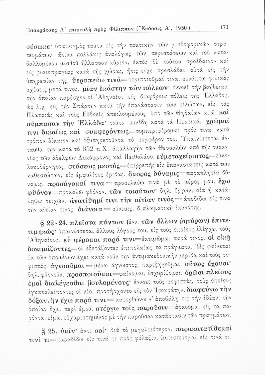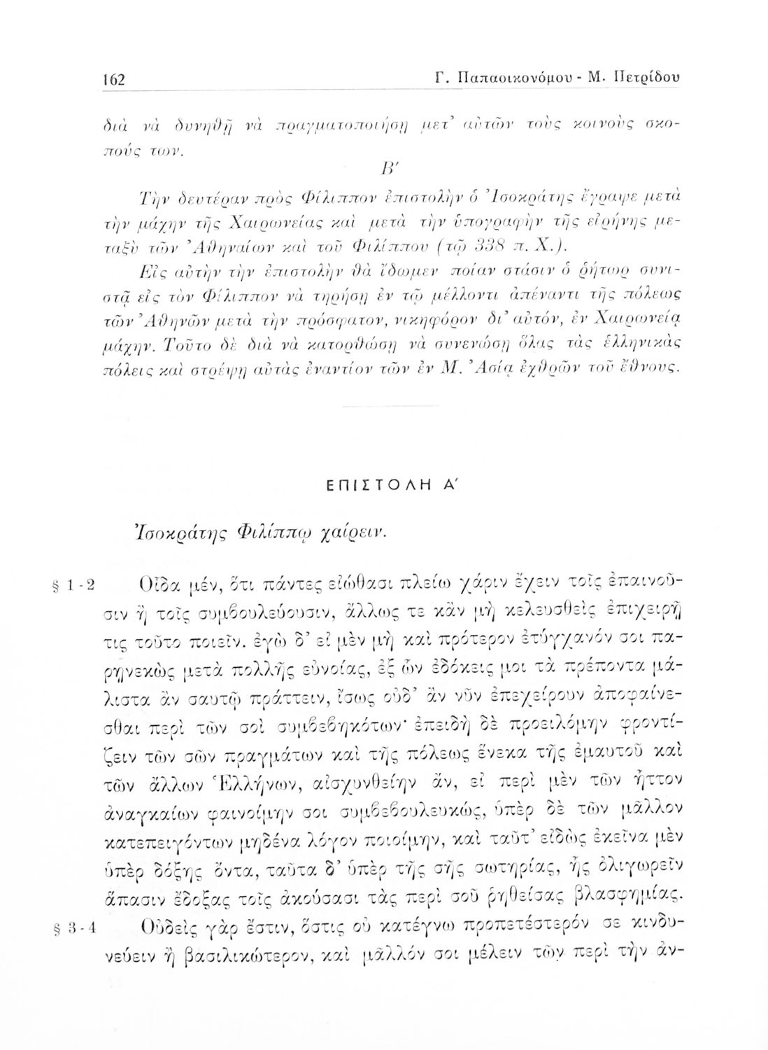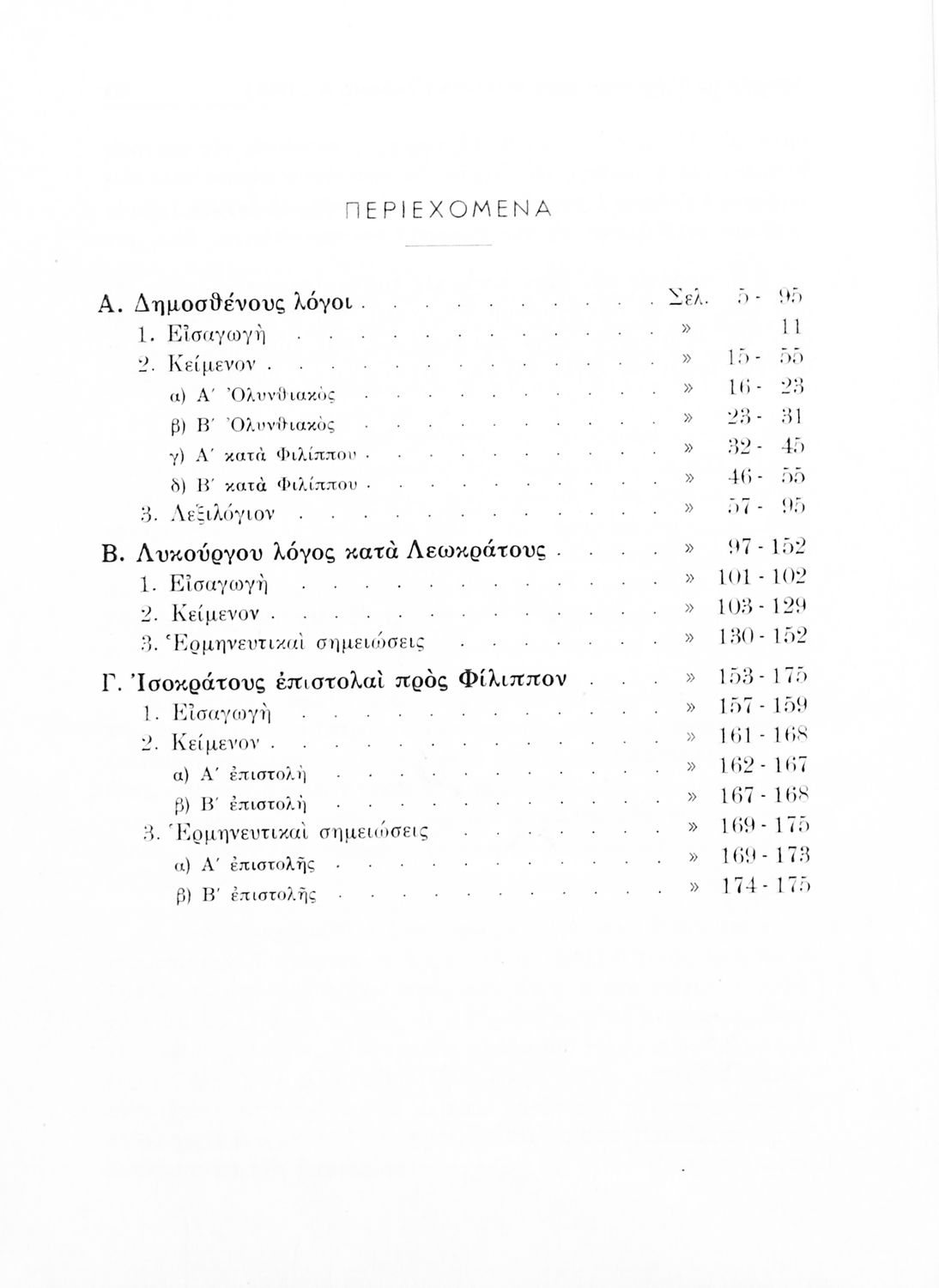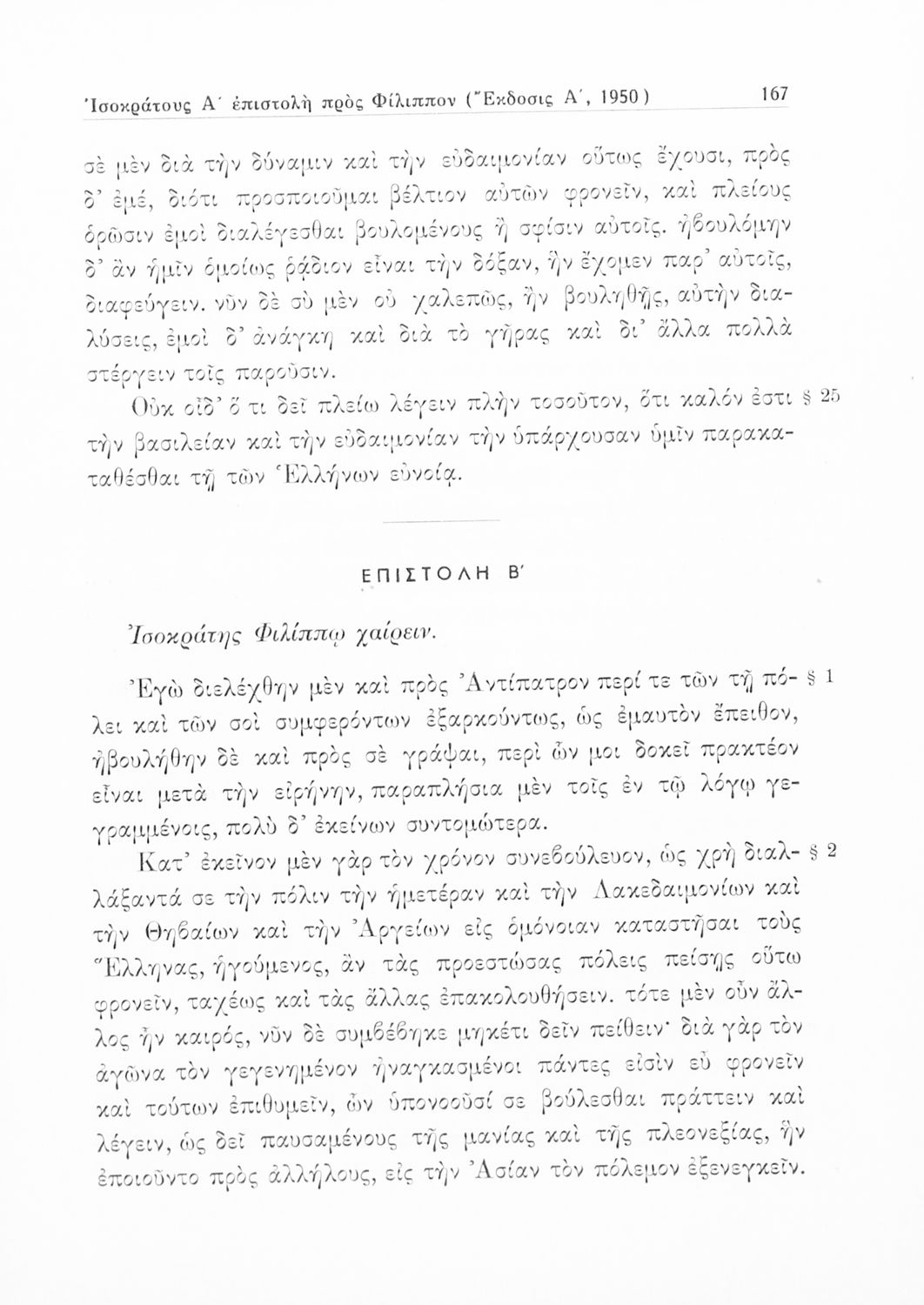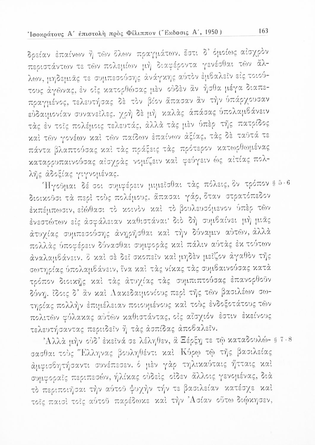 Σχολικό εγχειρίδιο Αρχαίων Ελληνικών Δ΄ Γυμνασίου που περιλαμβάνει εισαγωγή στη ζωή και το έργο του Ισοκράτη, τις επιστολές Α΄ και Β΄ προς Φίλιππο και ερμηνευτικές παρατηρήσεις.