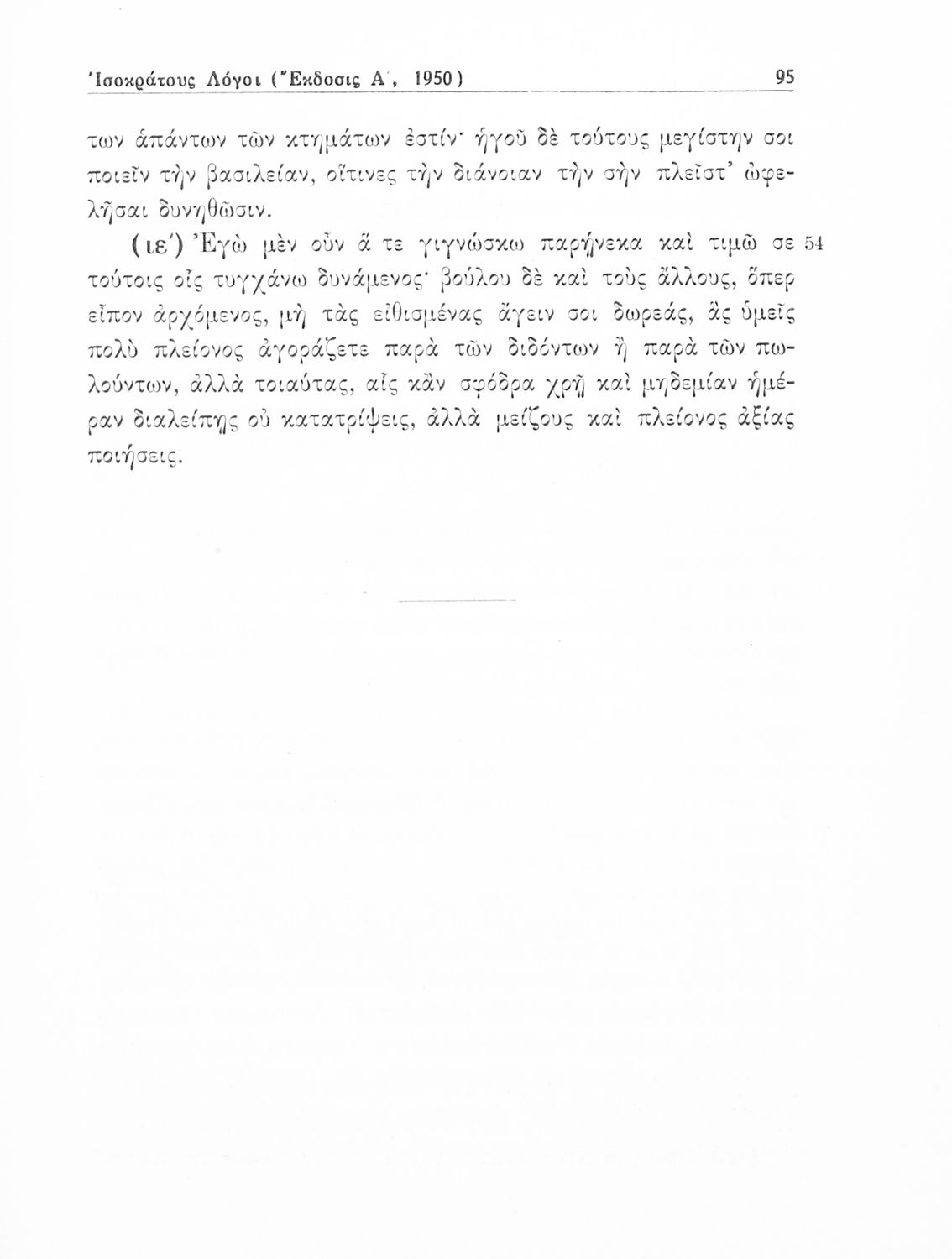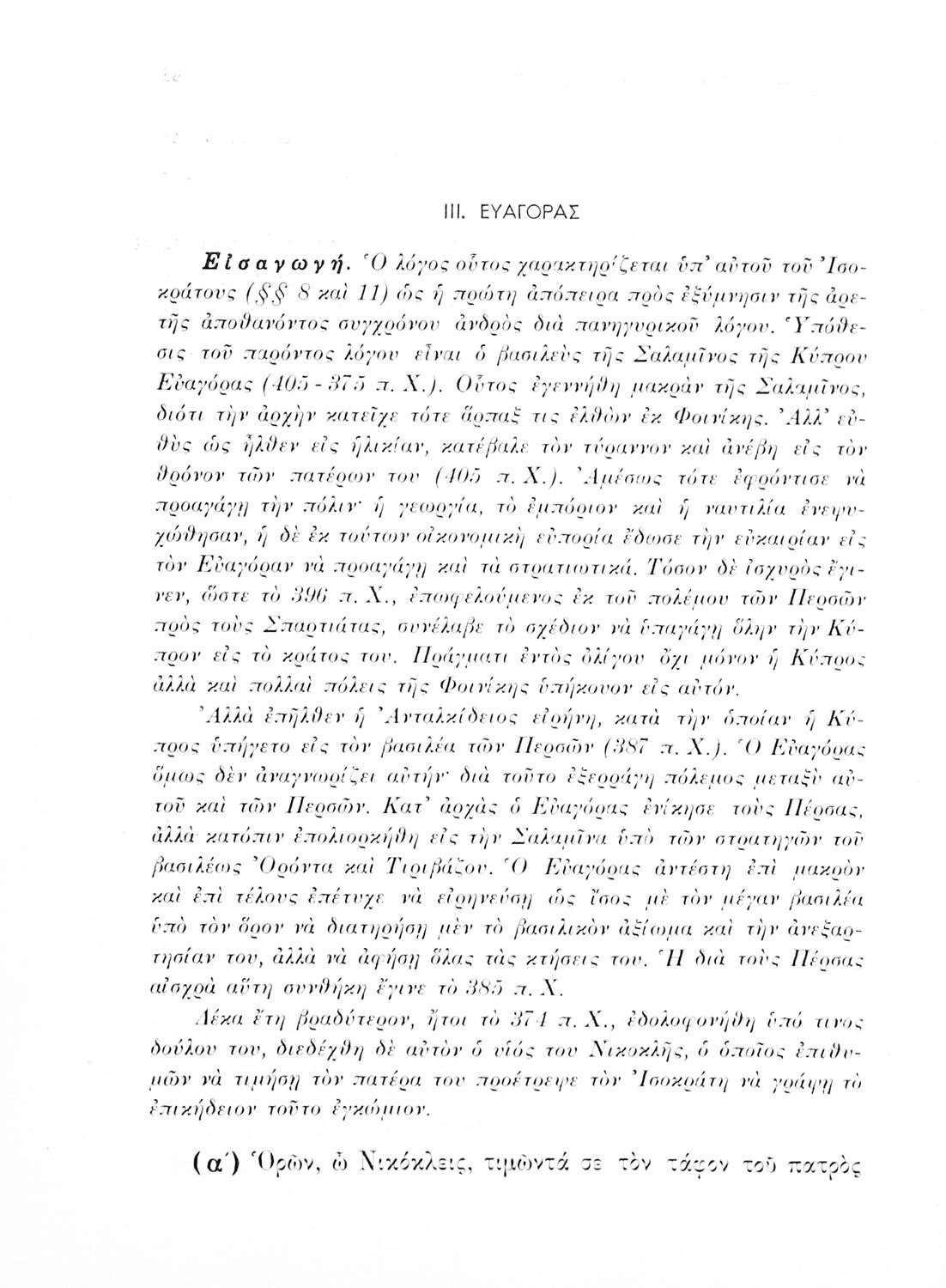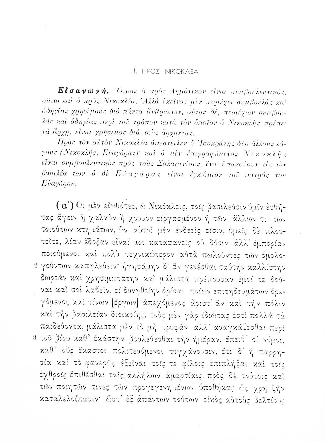 Σχολικό εγχειρίδιο Αρχαίων Ελληνικών που περιλαμβάνει εισαγωγή στη ζωή και το έργο του Ισοκράτη,τους Λόγους του Προς Δημόνικον, Προς Νικοκλέα και Ευαγόρας, και ερμηνευτικές σημειώσεις.
