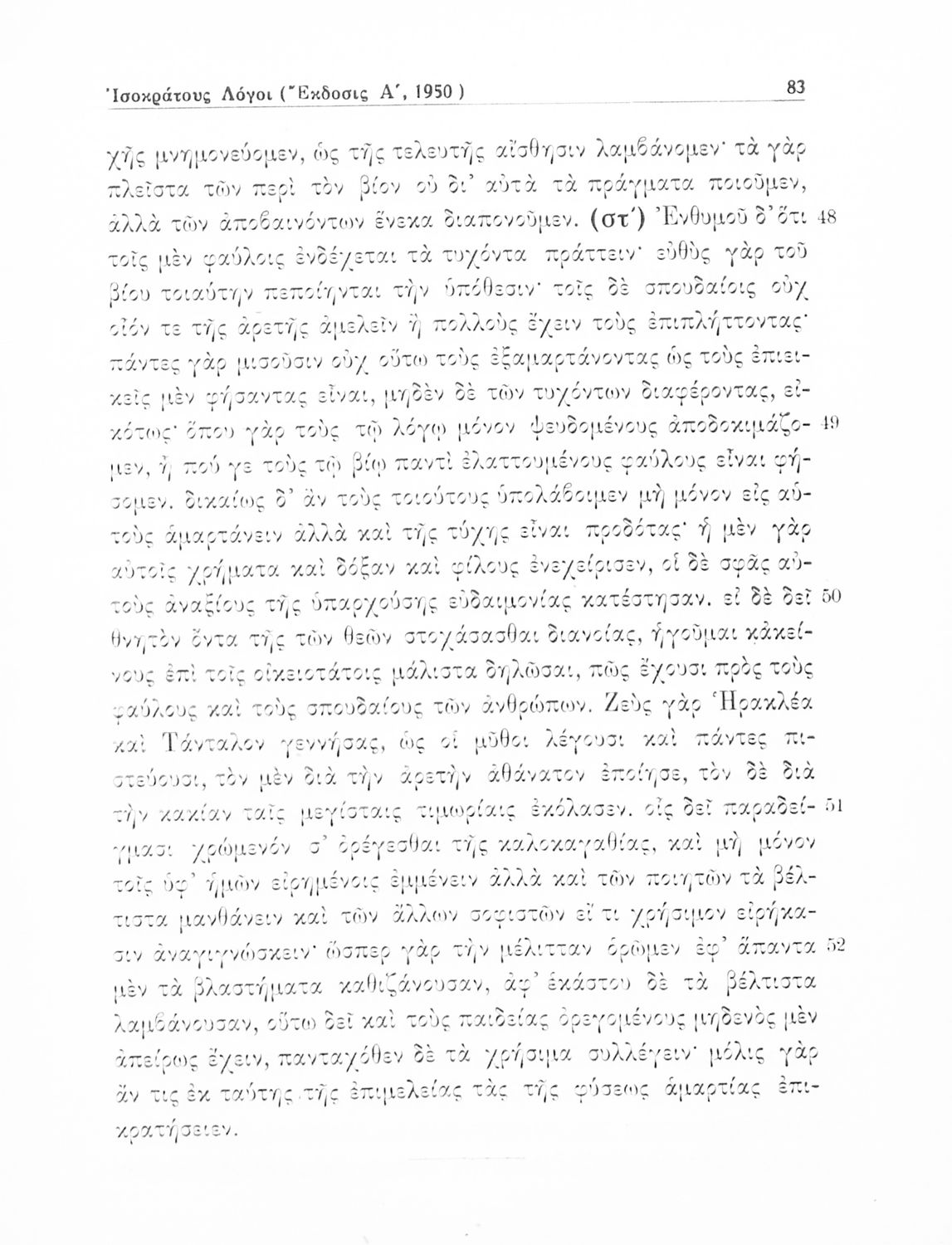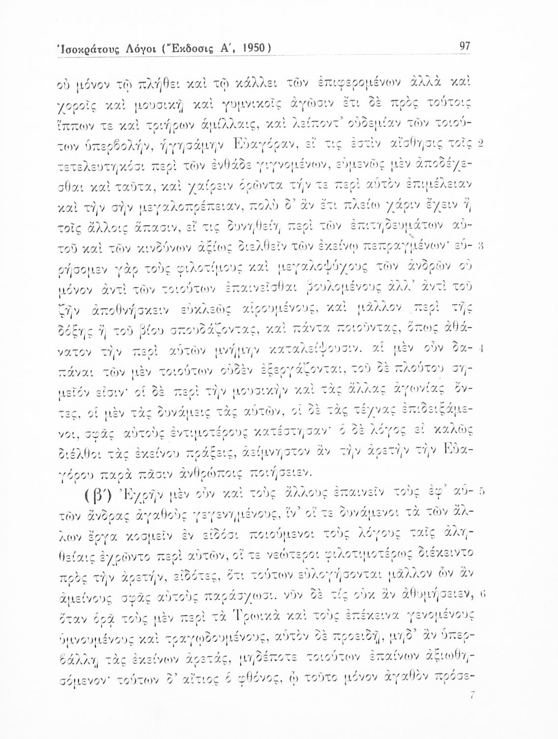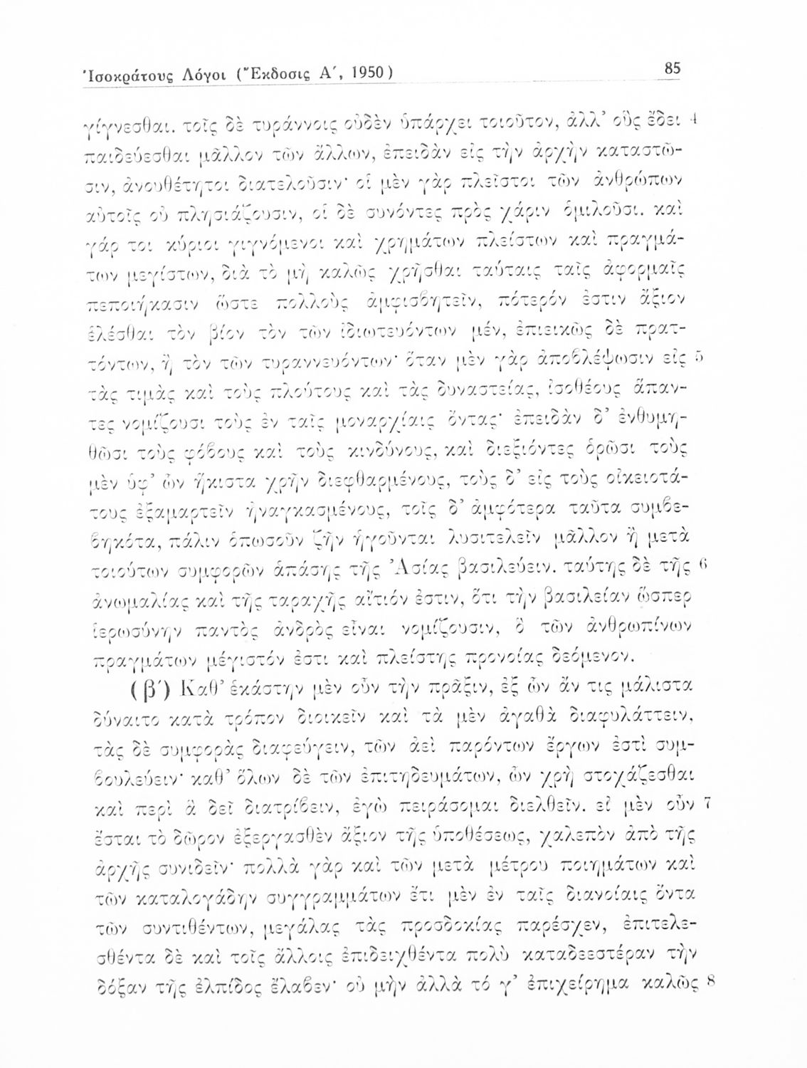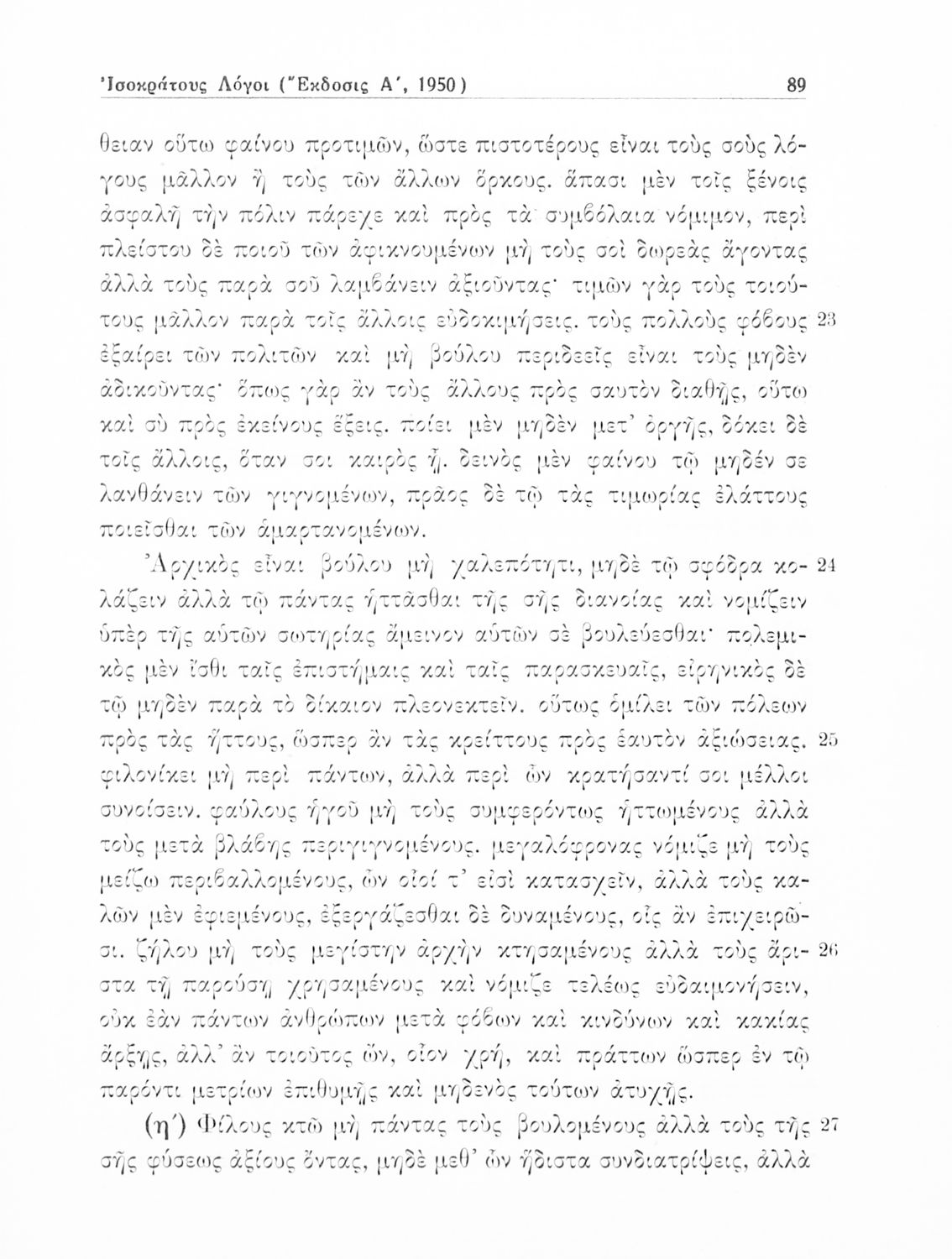 Σχολικό εγχειρίδιο Αρχαίων Ελληνικών που περιλαμβάνει εισαγωγή στη ζωή και το έργο του Ισοκράτη,τους Λόγους του Προς Δημόνικον, Προς Νικοκλέα και Ευαγόρας, και ερμηνευτικές σημειώσεις.