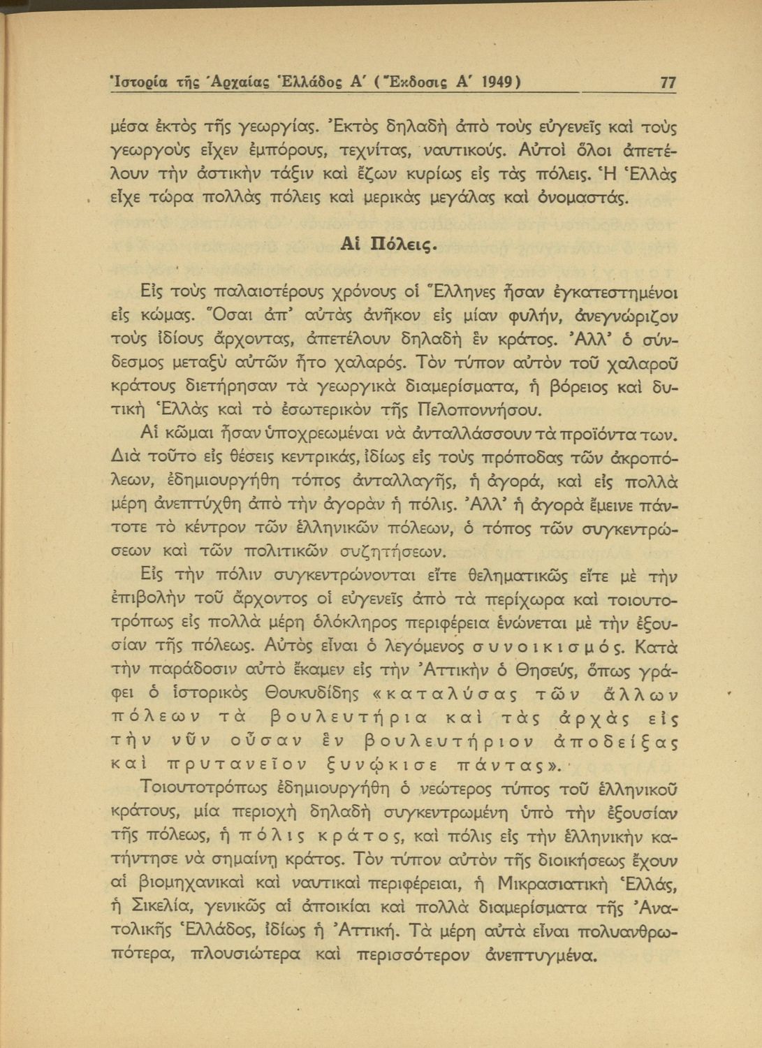 Σχολικό εγχειρίδιο Ιστορίας Α΄ Γυμνασίου που καλύπτει την περίοδο από τους προϊστορικούς χρόνους ως τις μεταρρυθμίσεις του Κλεισθένη. Περιέχει και εκτενή αναφορά στην ανάπτυξη των γραμμάτων, των τεχνών και του εμπορίου.
