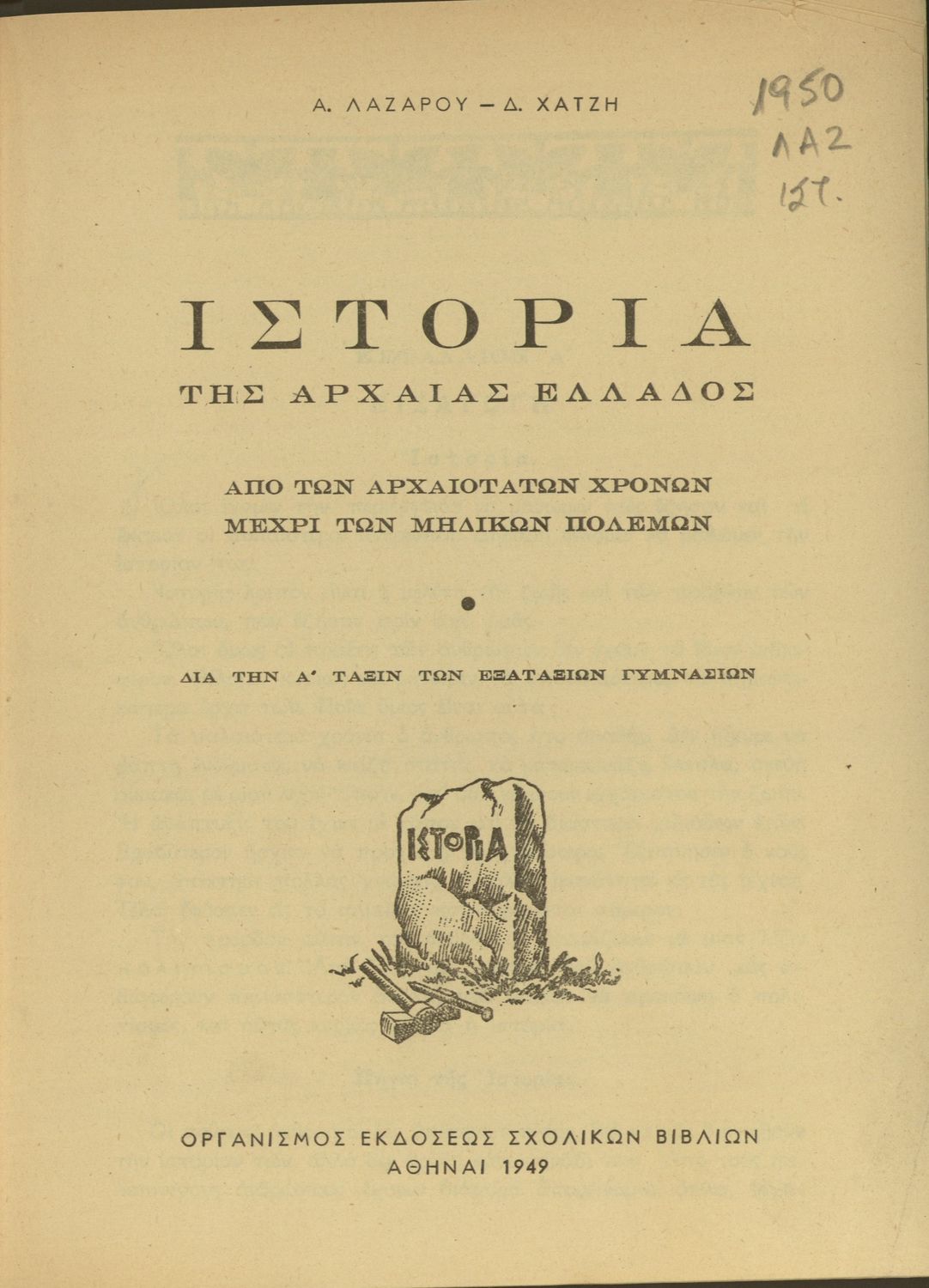 LDR 01459 2200205 4500 035 ## _a02-00950 040 ## _aΕλληνικό Λογοτεχνικό και Ιστορικό Αρχείο 041 ## _ael 100 ## _aΑ. Λαζάρου _aΔ. Χατζής 110 ## _a2-950 245 0# _aΙστορία της αρχαίας Ελλάδος από των αρχαιοτάτων χρόνων μέχρι των μηδικών πολέμων. Δια την Α΄ Τάξιν των Εξατάξιων Γυμνασίων 250 ## _a1η Έκδοση 260 ## _aΑθήνα _bΟργανισμός Εκδόσεως Διδακτικών Βιβλίων _c1949 300 ## _a252 _bΣκίτσα, εικόνες (ασπρόμαυρα) 520 ## _aΣχολικό εγχειρίδιο Ιστορίας Α΄ Γυμνασίου που καλύπτει την περίοδο από τους προϊστορικούς χρόνους ως τις μεταρρυθμίσεις του Κλεισθένη. Περιέχει και εκτενή αναφορά στην ανάπτυξη των γραμμάτων, των τεχνών και του εμπορίου. 521 ## _aΑ' Γυμνασίου 522 ## _aΕλλάδα 546 ## _aΑπλή καθαρεύουσα 563 ## _aΣκληρό Εξώφυλλο 650 #4 _aΑχαιοί _aΔημοκρατία _aΔωριείς _aΕλληνικές αποικίες _aΙωνία _aΛυκούργος _aΠεισίστρατος _aΣόλων