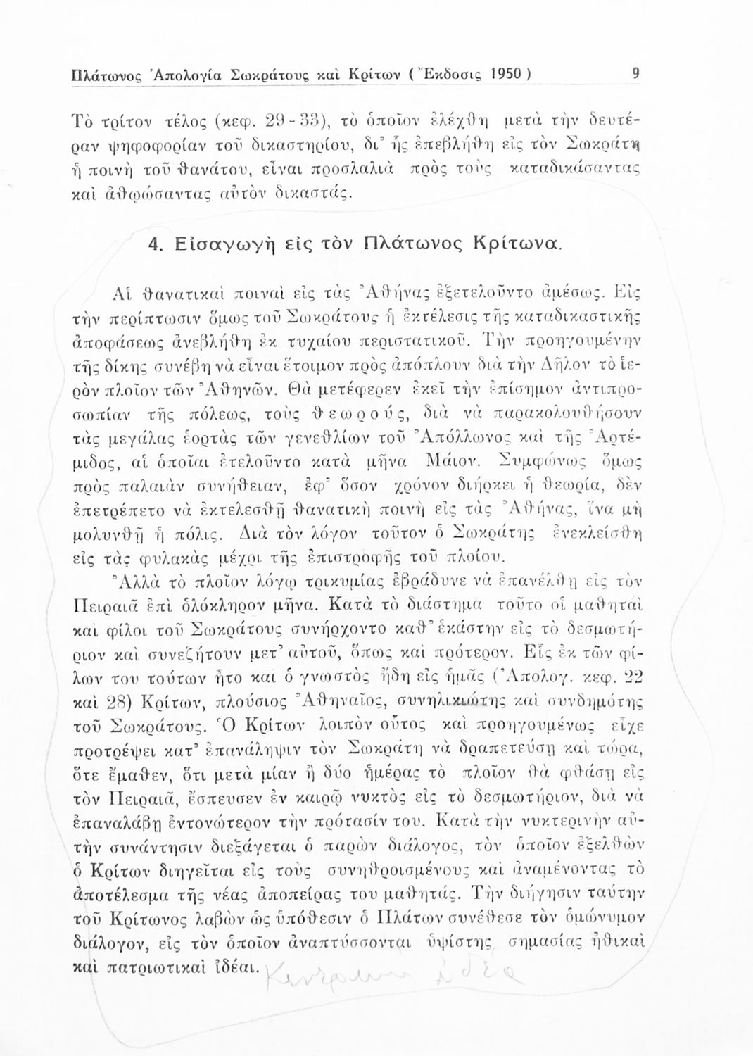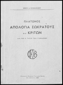 Σχολικό εγχειρίδιο Αρχαίων Ελληνικών της Ε΄ Γυμνασίου το οποίο περιλαμβάνει τα έργα του Πλάτωνα, Απολογία Σωκράτους και Κρίτων και ερμηνευτικές παρατηρήσεις.