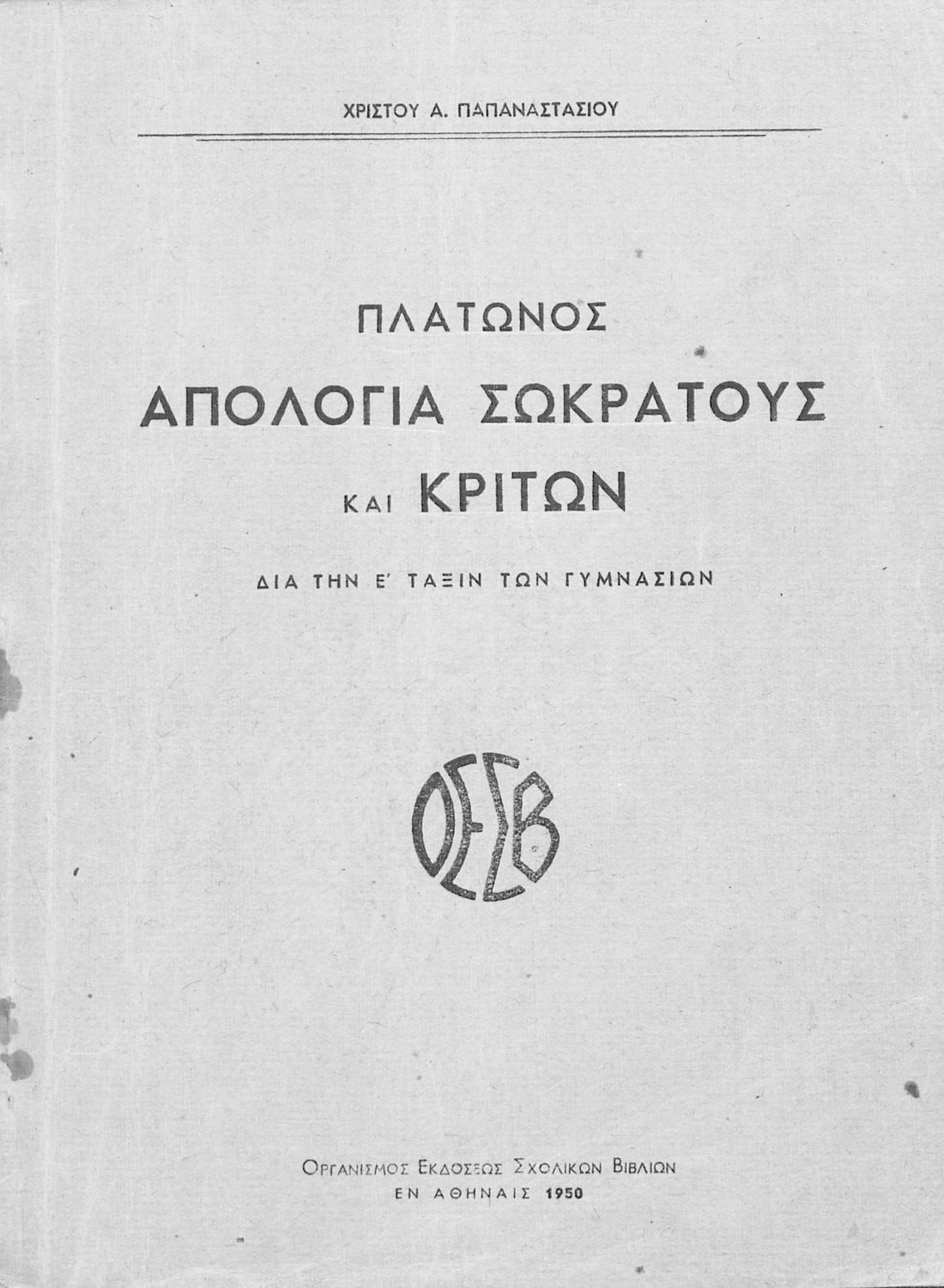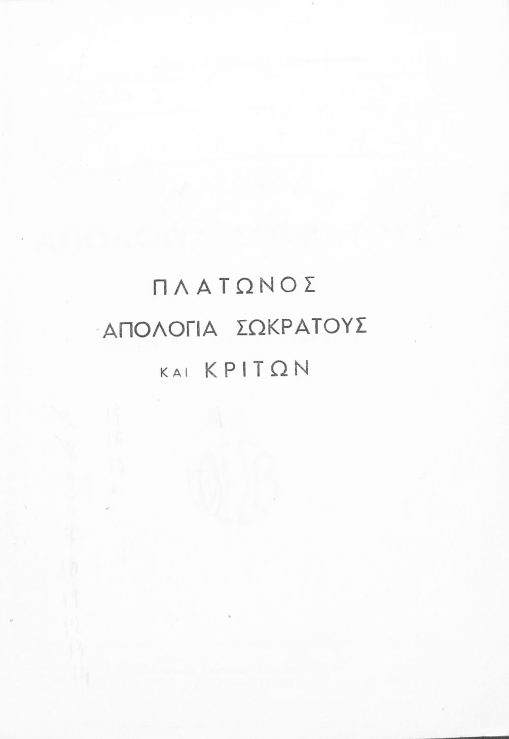 Σχολικό εγχειρίδιο Αρχαίων Ελληνικών Ε΄ Γυμνασίου που περιέχει τα έργα του Πλάτωνα Απολογία Σωκράτους και Κρίτων, εισαγωγή στη ζωή και το έργο του, και γλωσσικές και ερμηνευτικές σημειώσεις.