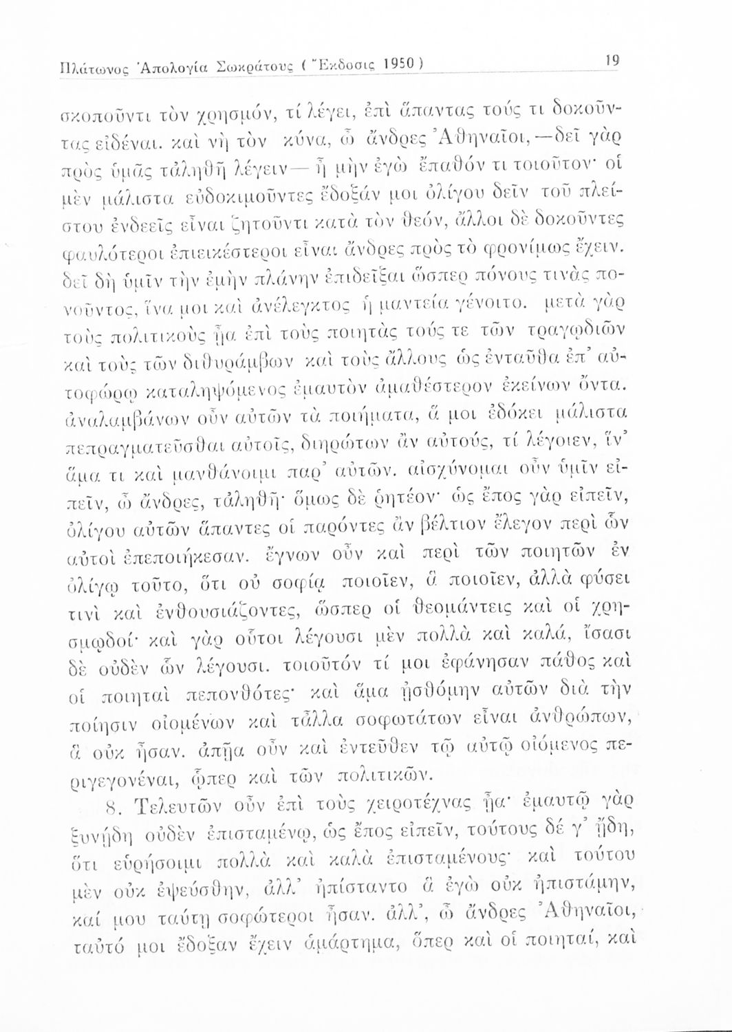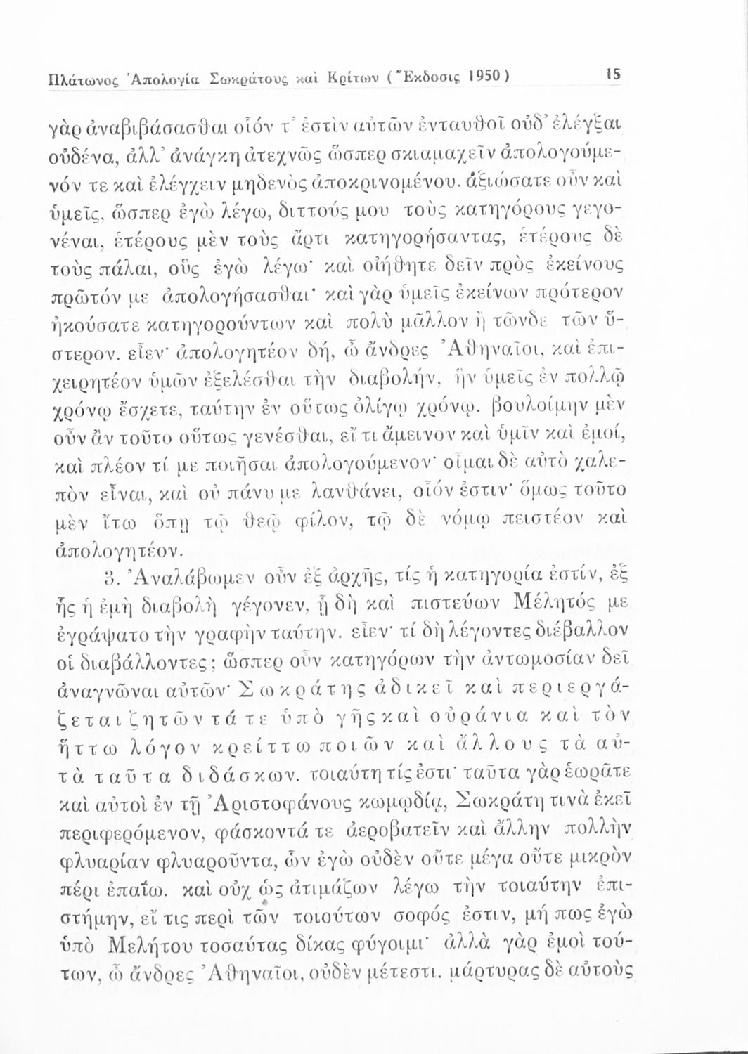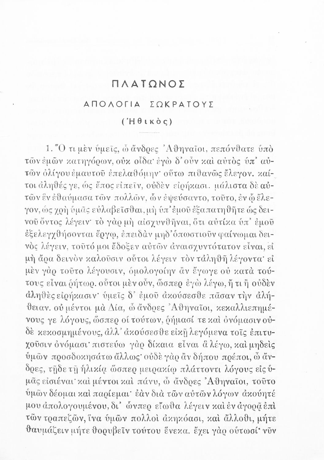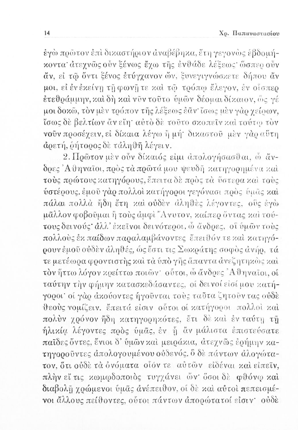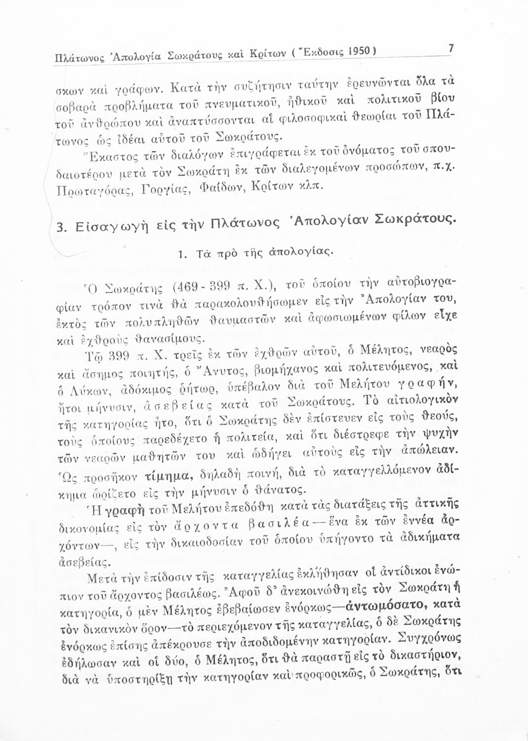 Σχολικό εγχειρίδιο της Γ΄ Γυμνασίου για το μάθημα των Αρχαίων. Περιέχει το πρωτότυπο κείμενο από το έργο του Πλάτωνα, Απολογία του Σωκράτη, με ερμηνευτικές και πραγματολογικές παρατηρήσεις του συγγραφέα.
