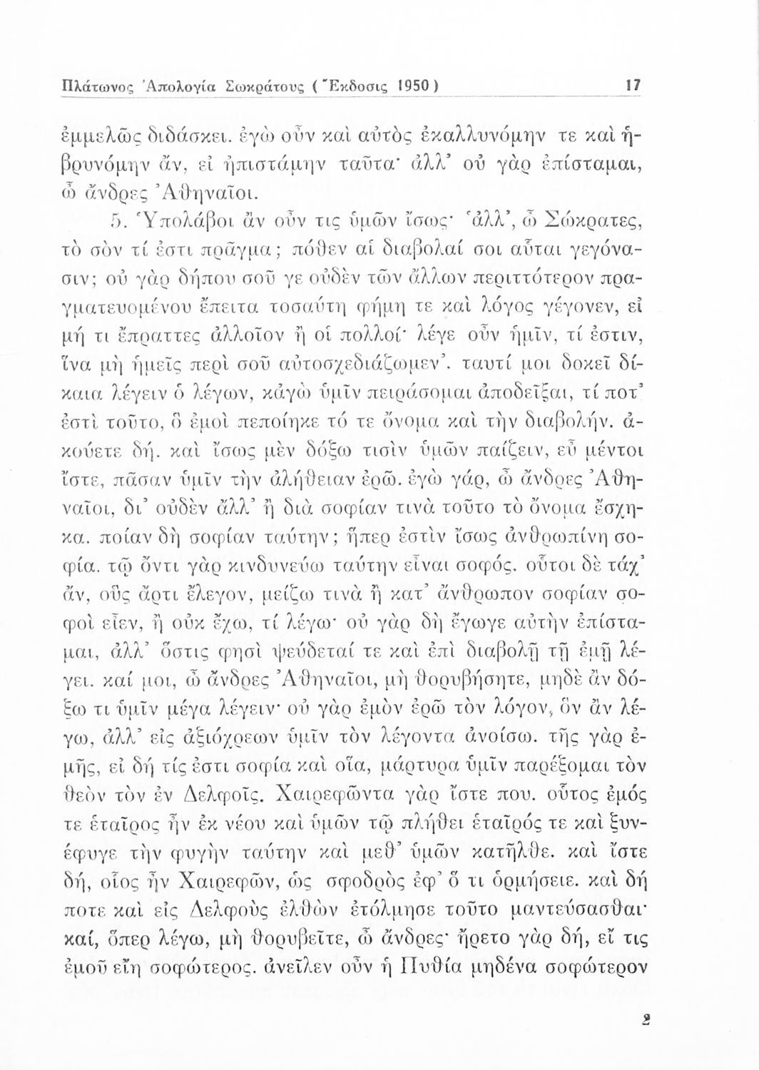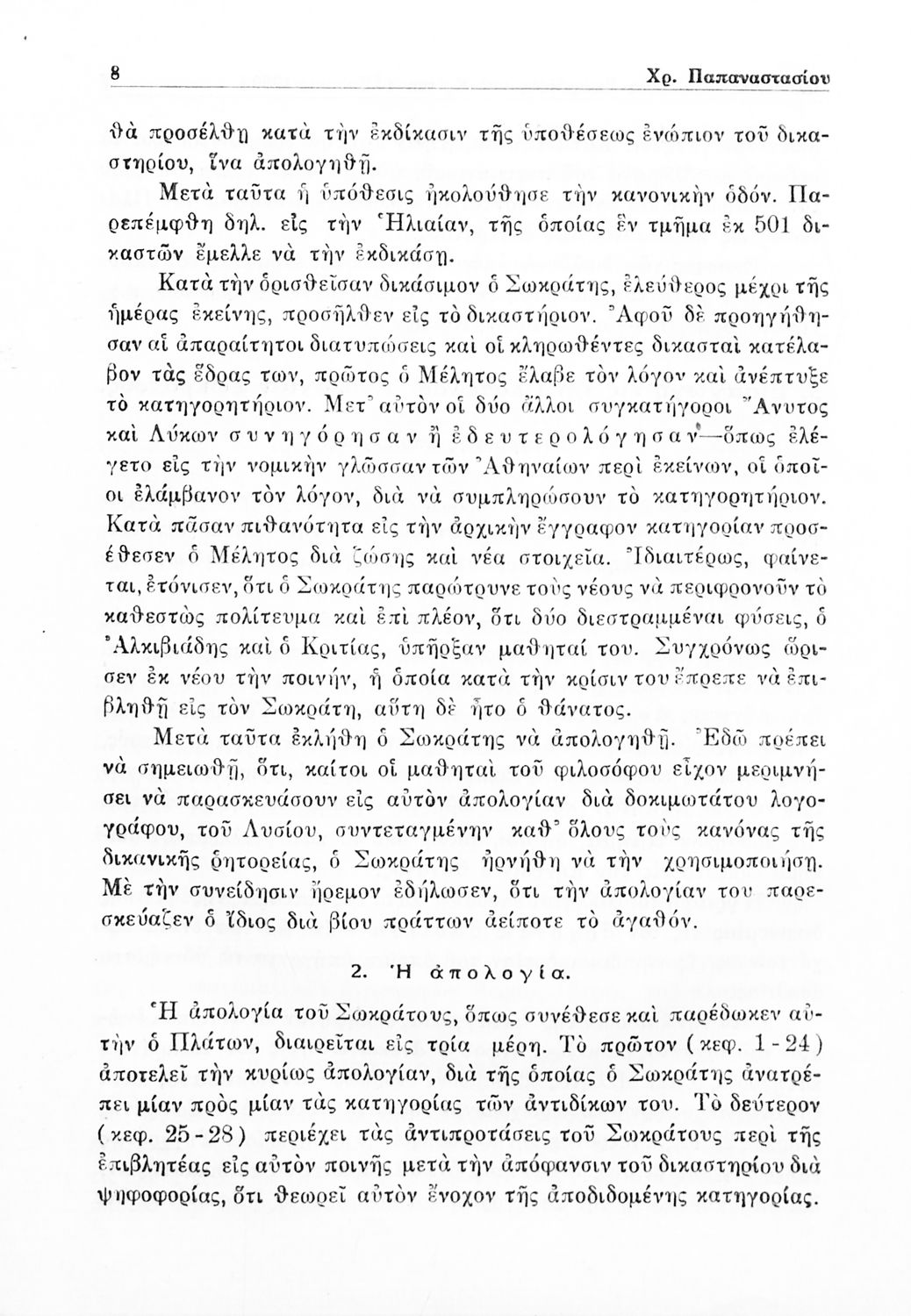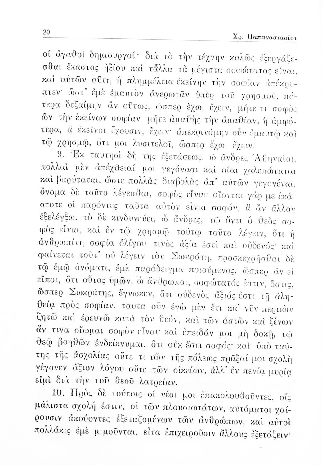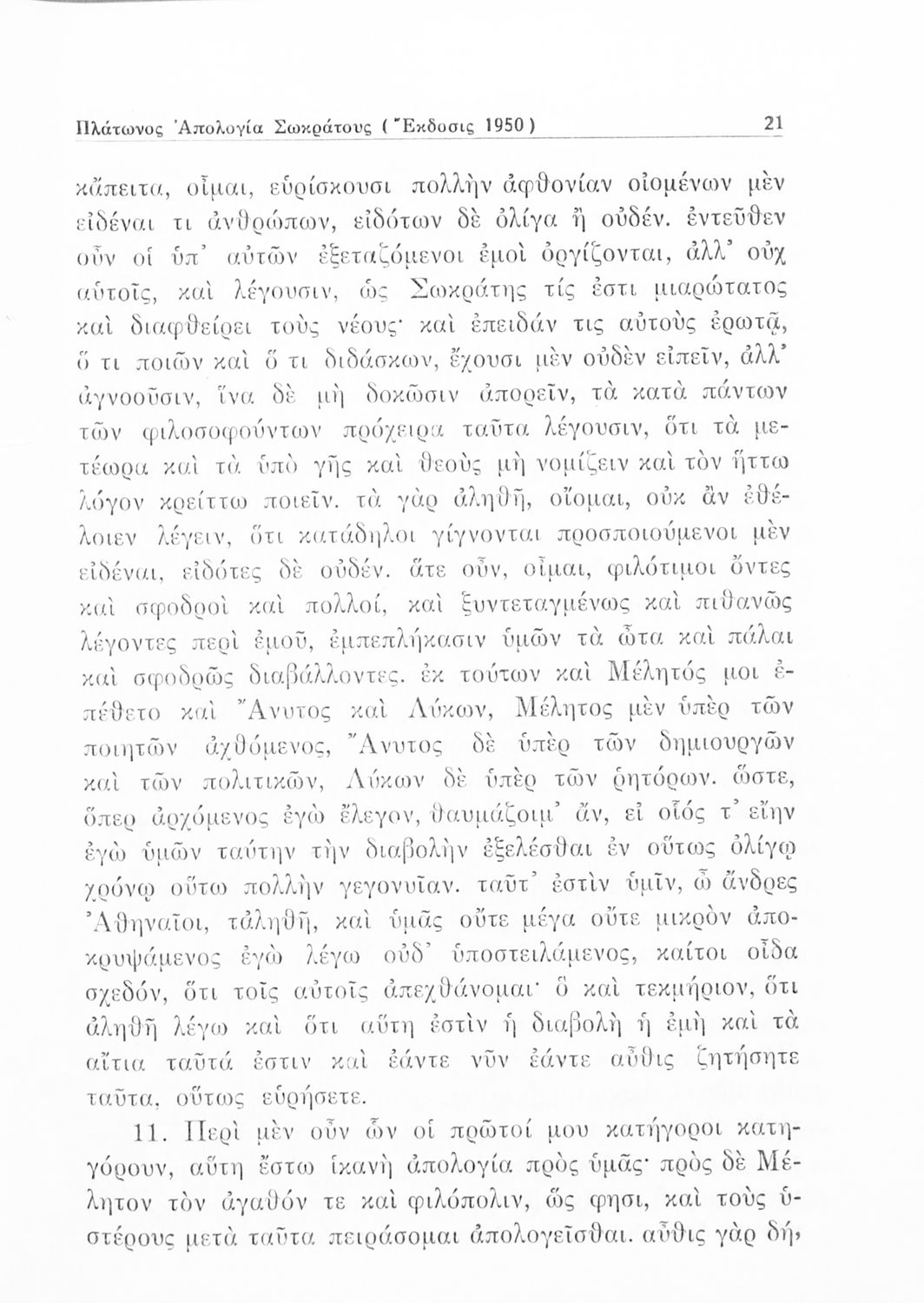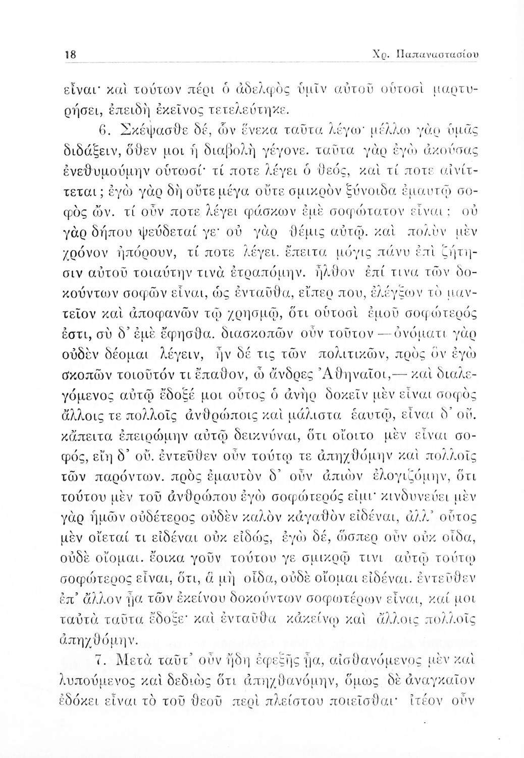 Σχολικό εγχειρίδιο της Γ΄ Γυμνασίου για το μάθημα των Αρχαίων. Περιέχει το πρωτότυπο κείμενο από το έργο του Πλάτωνα, Απολογία του Σωκράτη, με ερμηνευτικές και πραγματολογικές παρατηρήσεις του συγγραφέα.