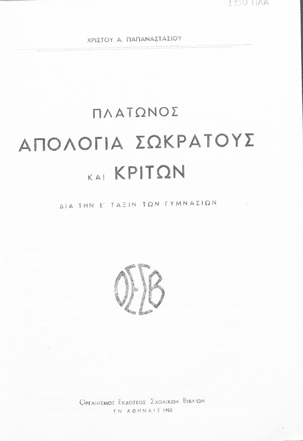 Τίτλος: Απολογία Σωκράτους και Κρίτων, δια την Ε΄ τάξιν των Γυμνασίων