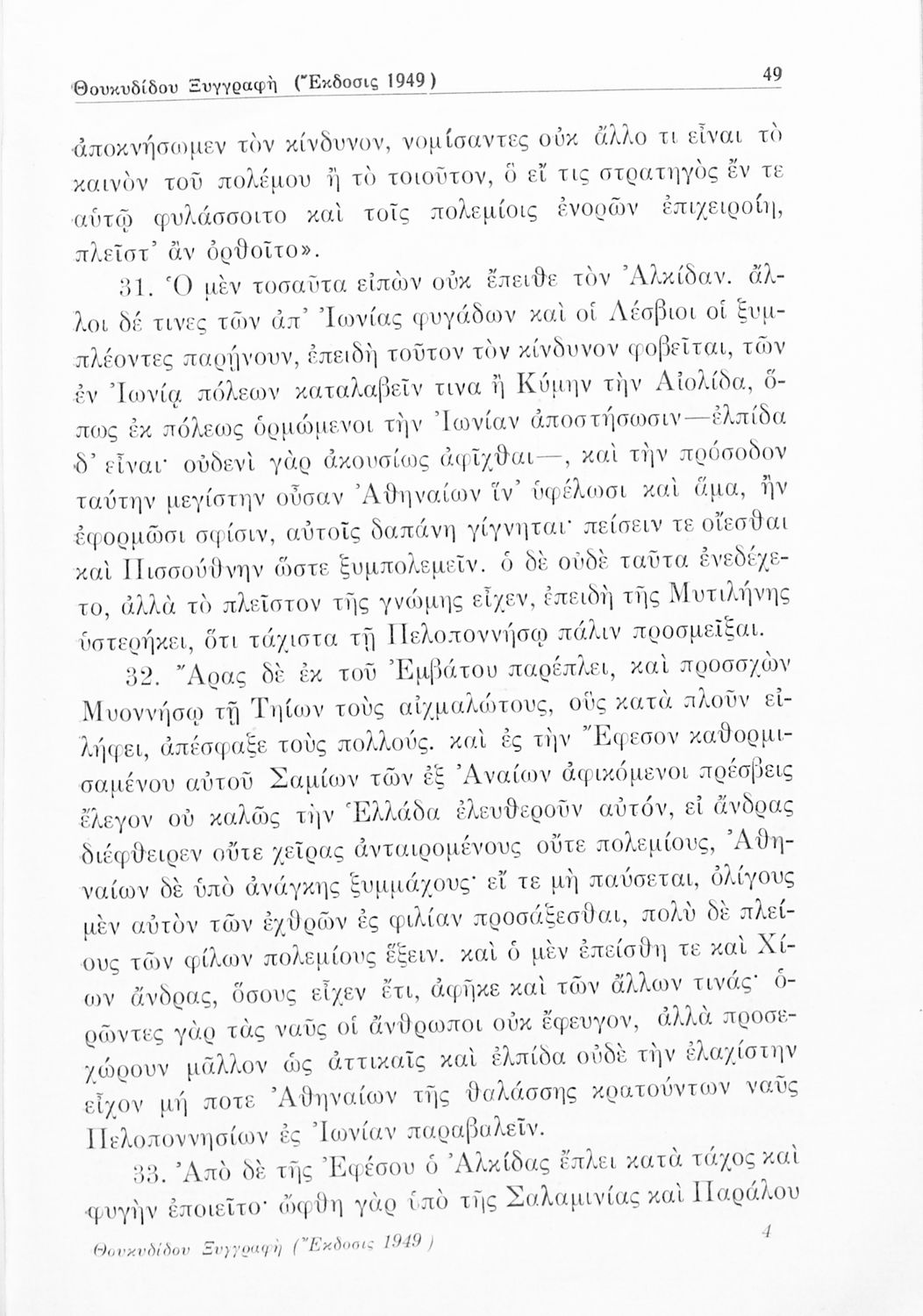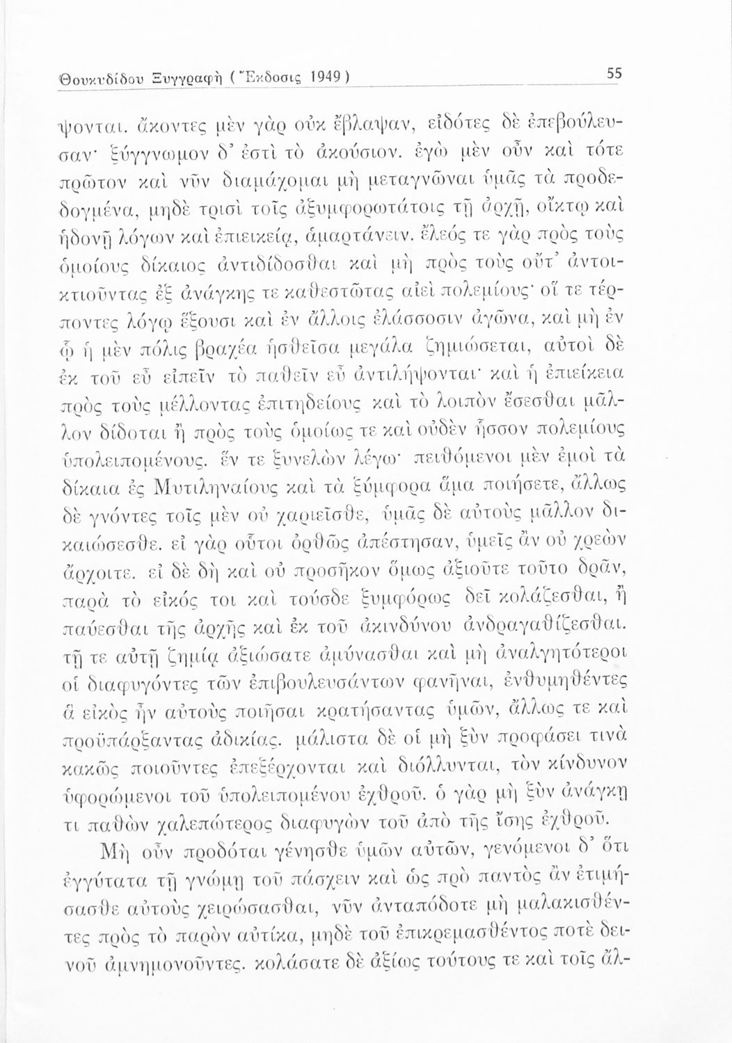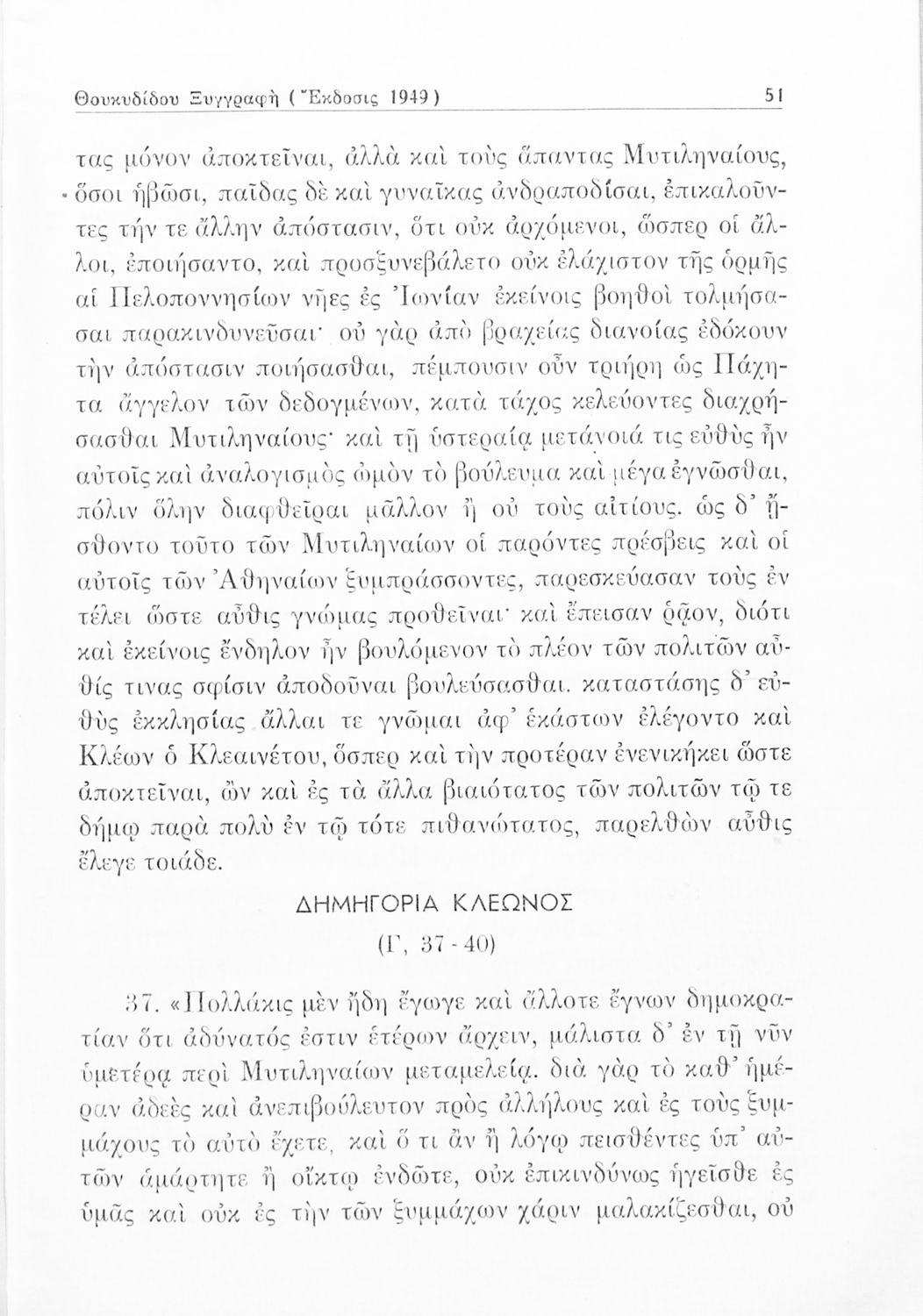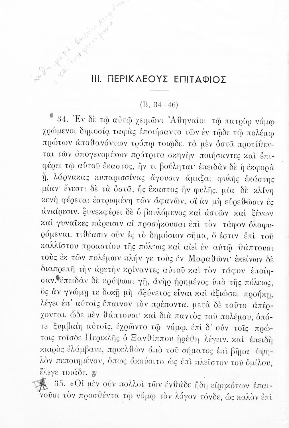 Σχολικό εγχειρίδιο Αρχαίων Ελληνικών για τις τάξεις του Γυμνασίου το οποίο περιέχει αποσπάσματα από το έργο του Θουκυδίδη, εισαγωγή στη ζωή και το έργο του και ερμηνευτικές σημειώσεις.