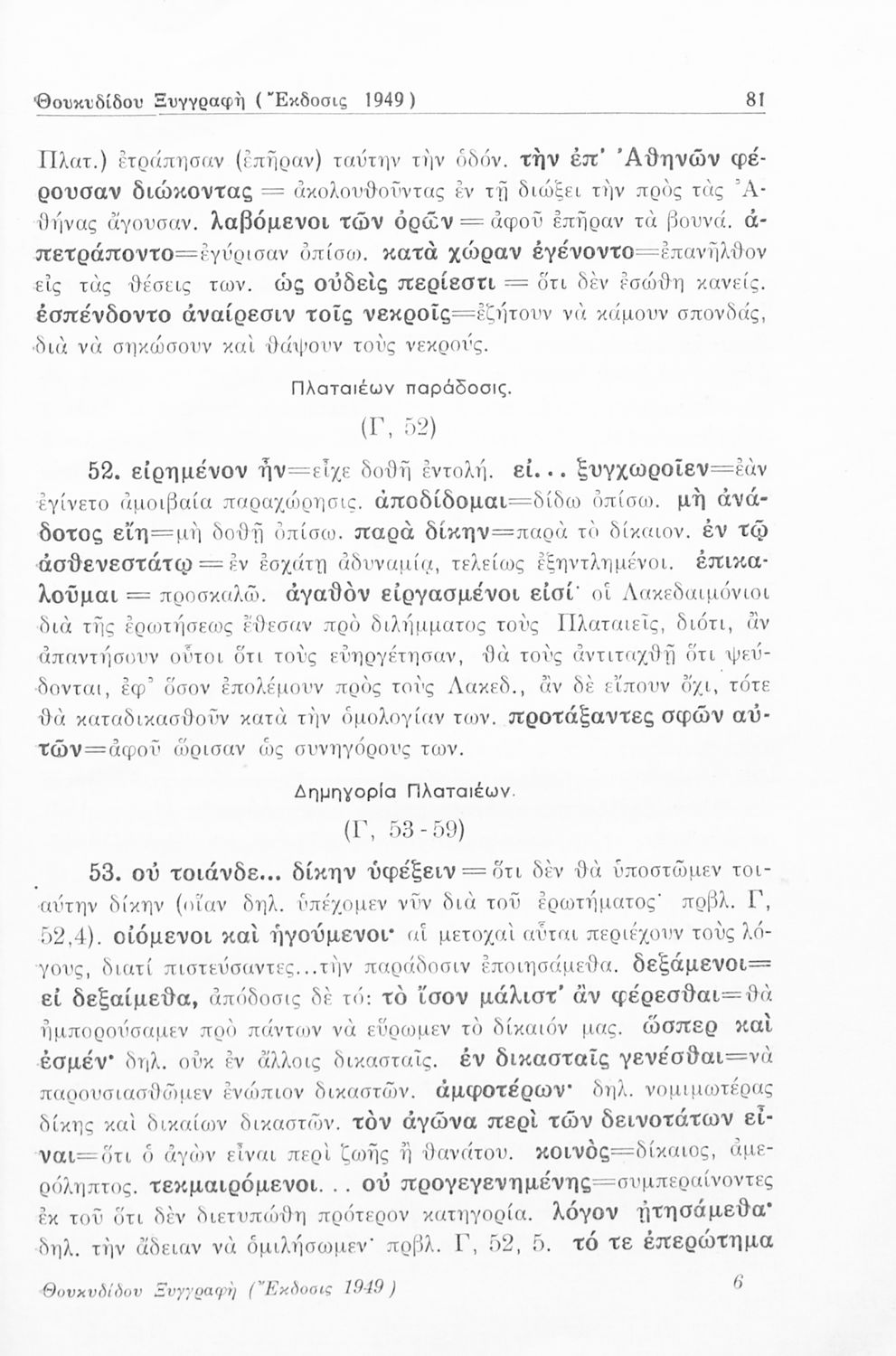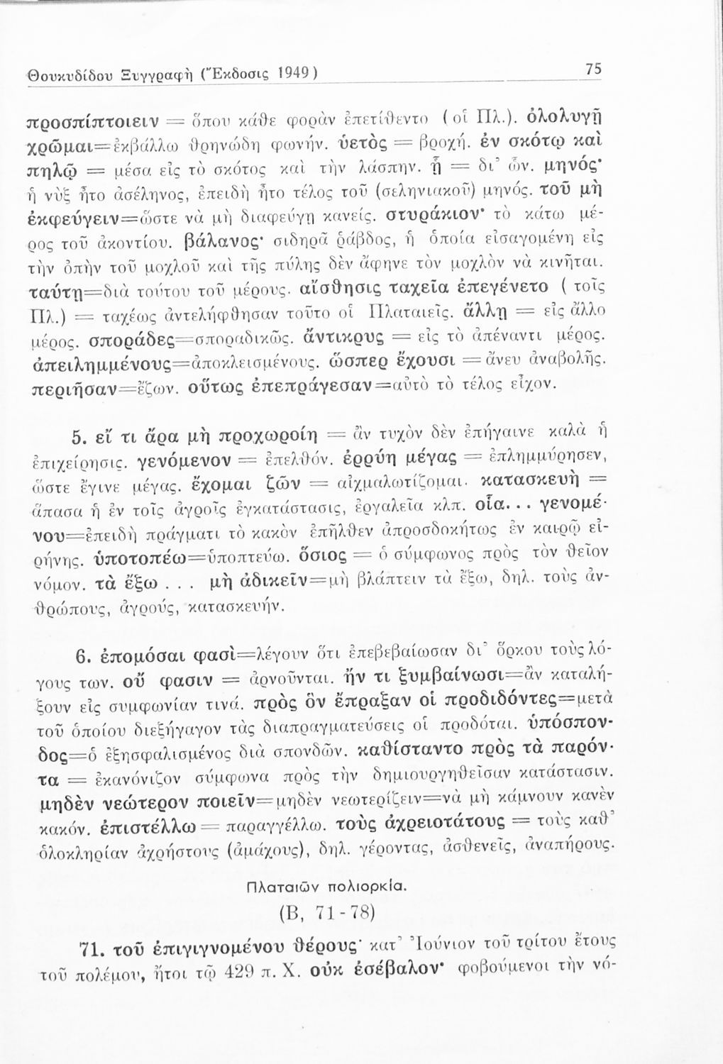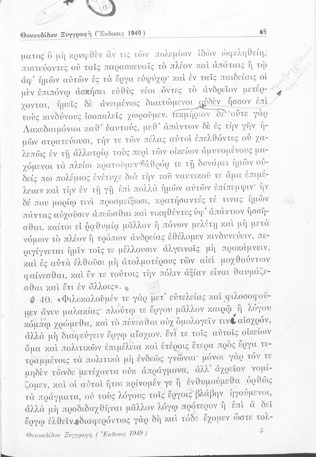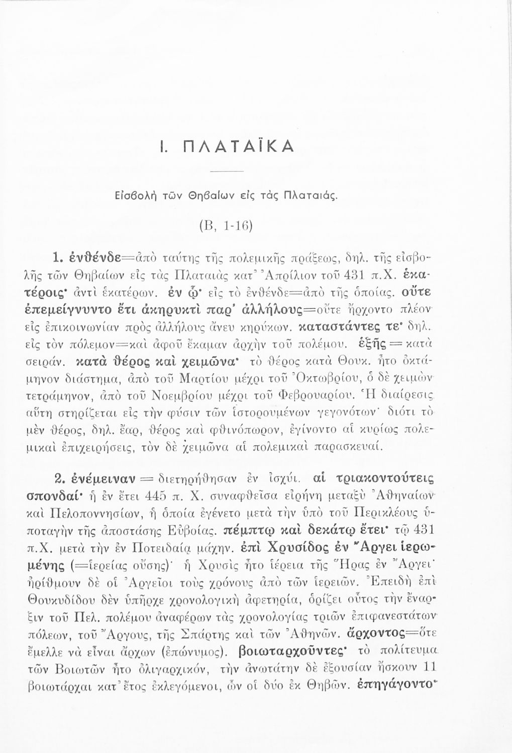 Σχολικό εγχειρίδιο Αρχαίων Ελληνικών Γυμνασίου που περιέχει εισαγωγή στη ζωή και το έργο του Θουκυδίδη, αποσπάσματα από τα Πλαταιϊκά, τα Λεσβιακά και τον Επιτάφιο του Περικλή και ερμηνευτικές σημειώσεις.