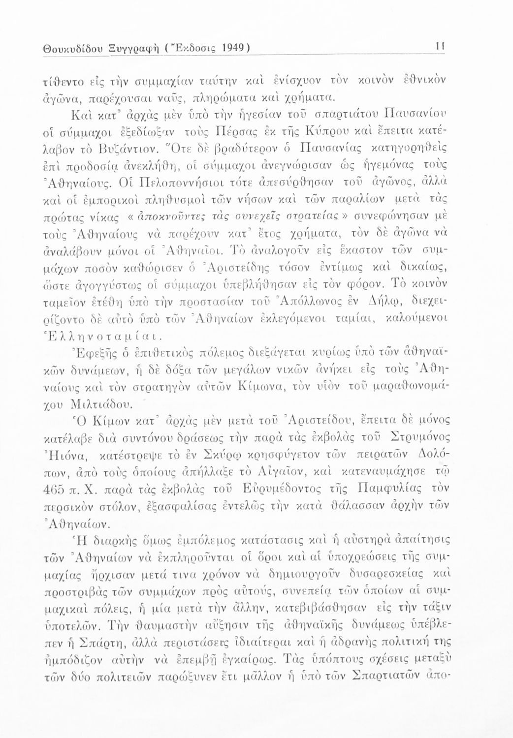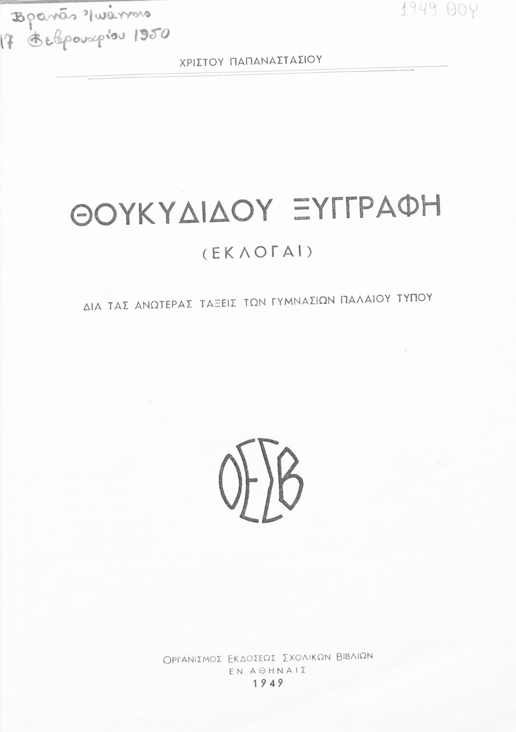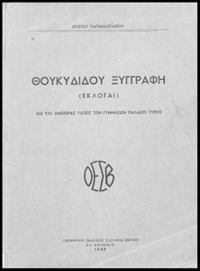 Σχολικό εγχειρίδιο Αρχαίων Ελληνικών για τις τάξεις του Γυμνασίου το οποίο περιέχει αποσπάσματα από το έργο του Θουκυδίδη, εισαγωγή στη ζωή και το έργο του και ερμηνευτικές σημειώσεις.