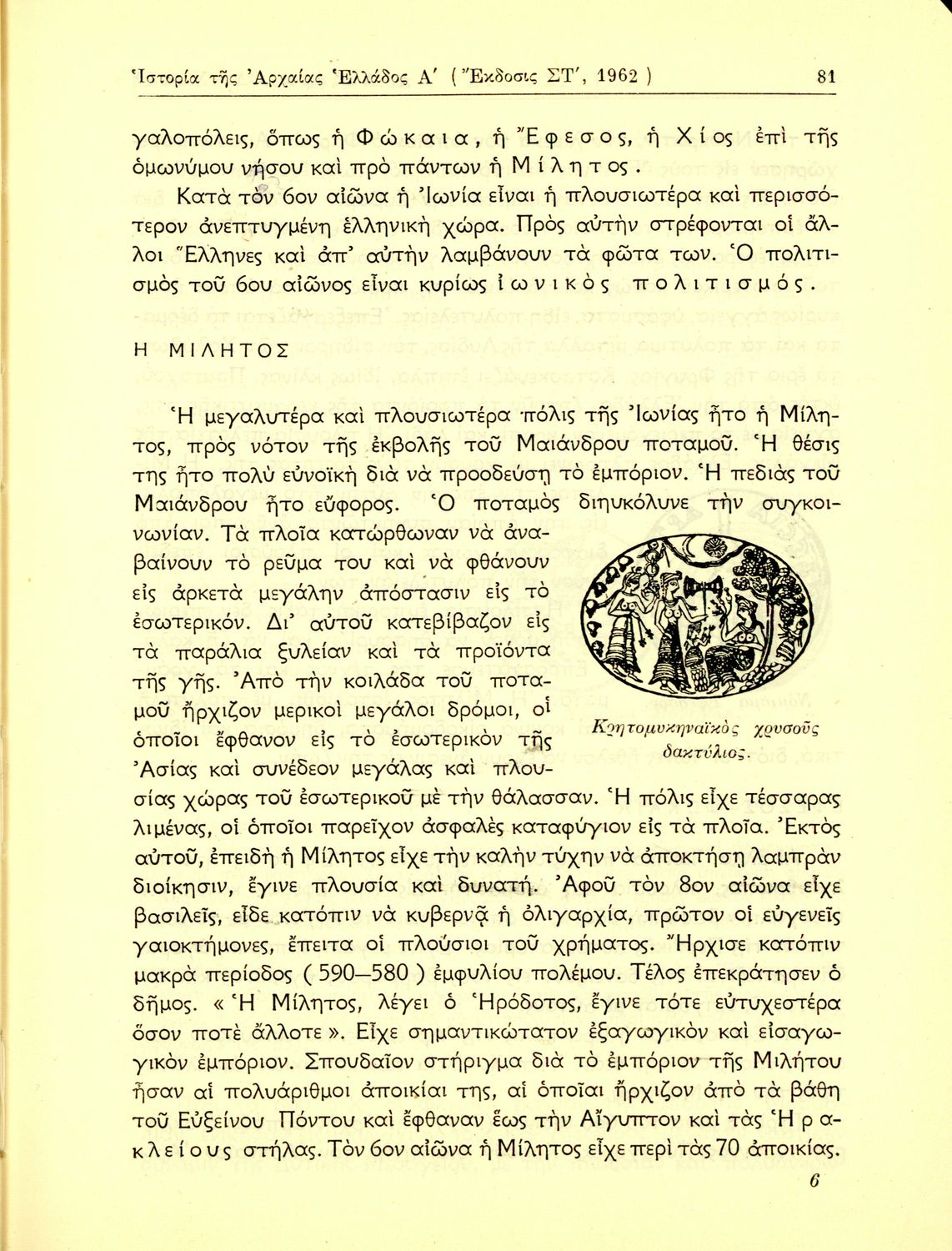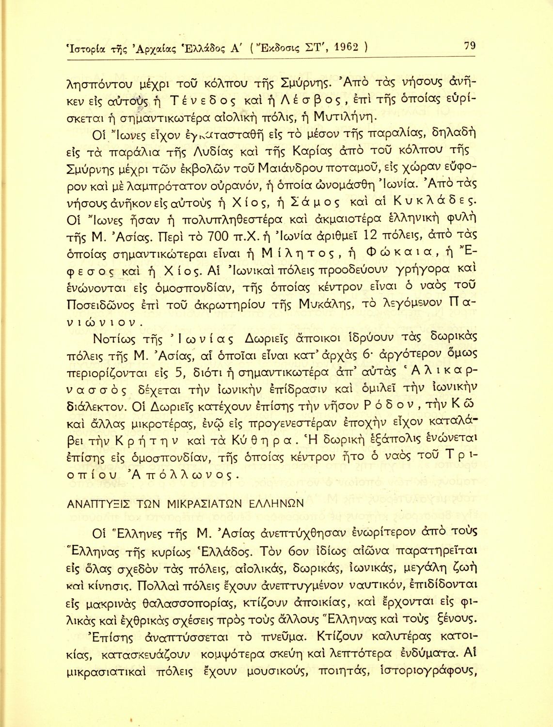 Σχολικό εγχειρίδιο Ιστορίας Α΄ Γυμνασίου που καλύπτει την περίοδο από τους προϊστορικούς χρόνους ως τις μεταρρυθμίσεις του Κλεισθένη. Περιέχει και εκτενή αναφορά στην ανάπτυξη των γραμμάτων, των τεχνών και του