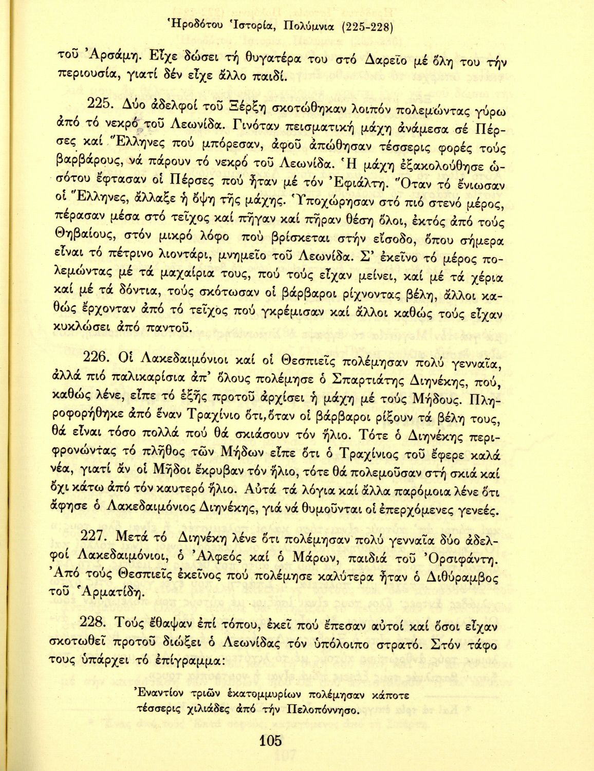 Σχολικό εγχειρίδιο Αρχαίων Ελληνικών Α΄ Γυμνασίου που περιλαμβάνει εισαγωγή στη ζωή και το έργο του Ηρόδοτου, και αποσπάσματα από τα 9 βιβλία της Ιστορίας του σε μετάφραση. Φέρει το σύμβολο της δικτατορίας.