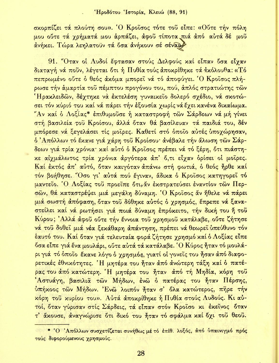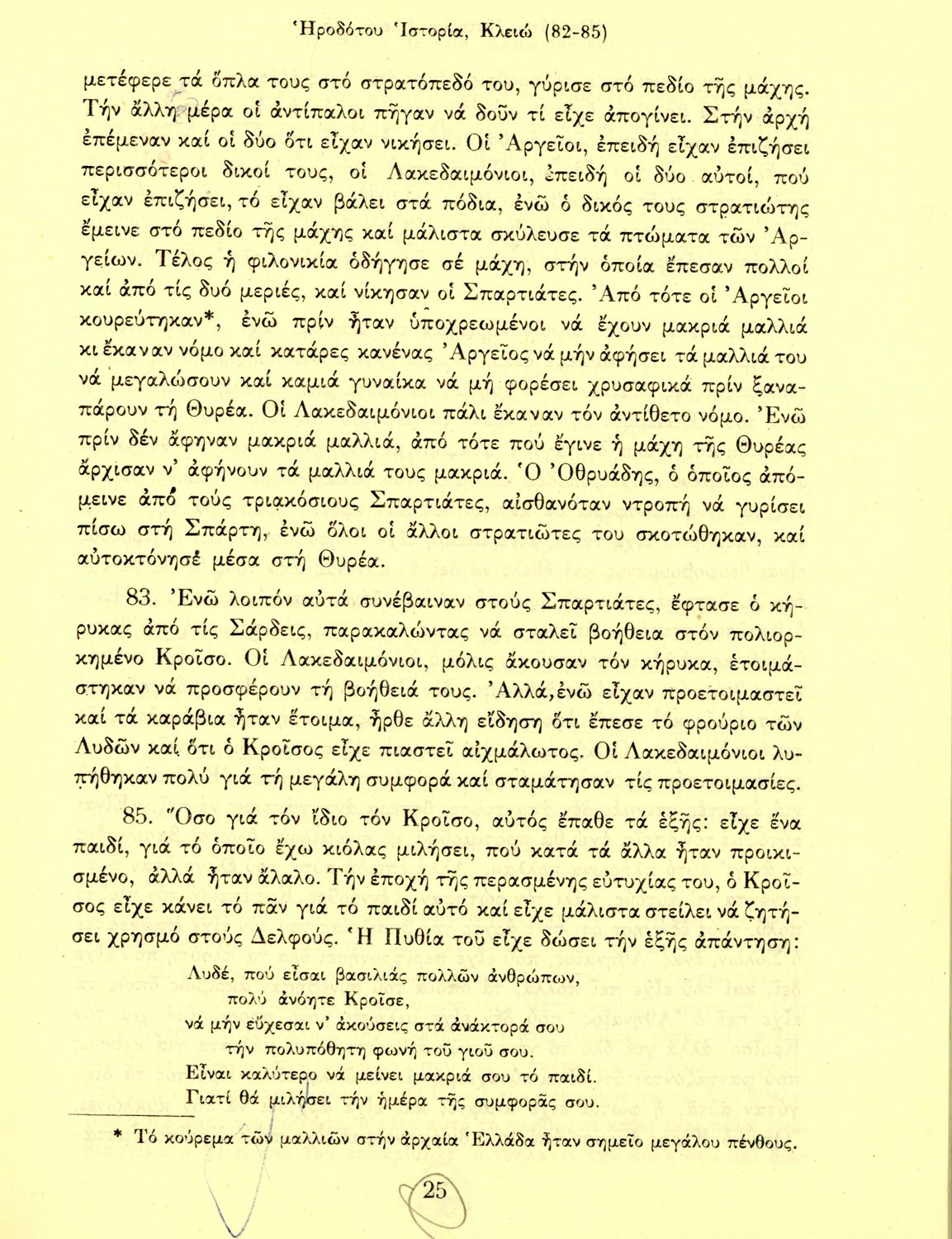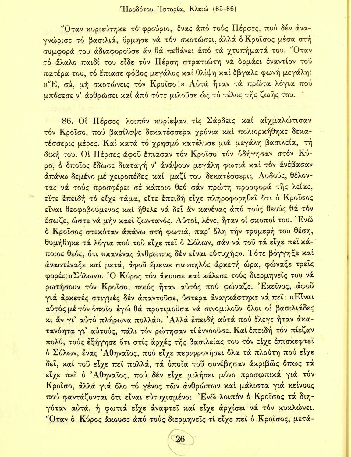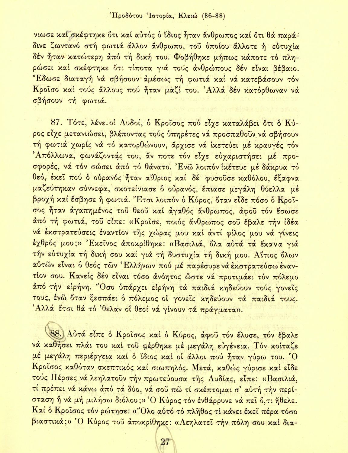 Σχολικό εγχειρίδιο Αρχαίων Ελληνικών Α΄ Γυμνασίου που περιλαμβάνει αποσπάσματα από την Ιστορία του Ηρόδοτου σε μετάφραση, εισαγωγή στη ζωή, το έργο και τη διάλεκτό του και ερμηνευτικά και πραγματολογικά σχόλια.
