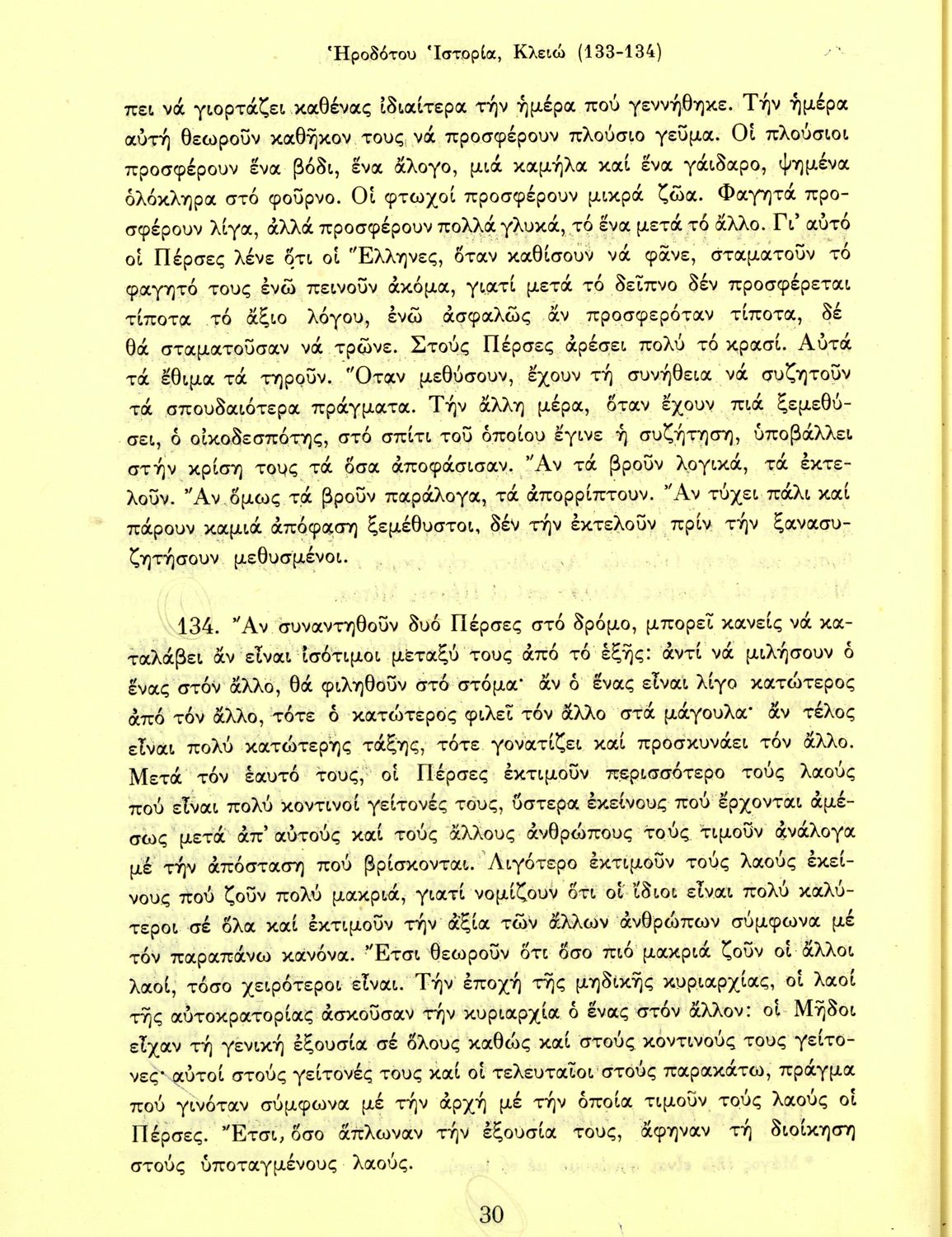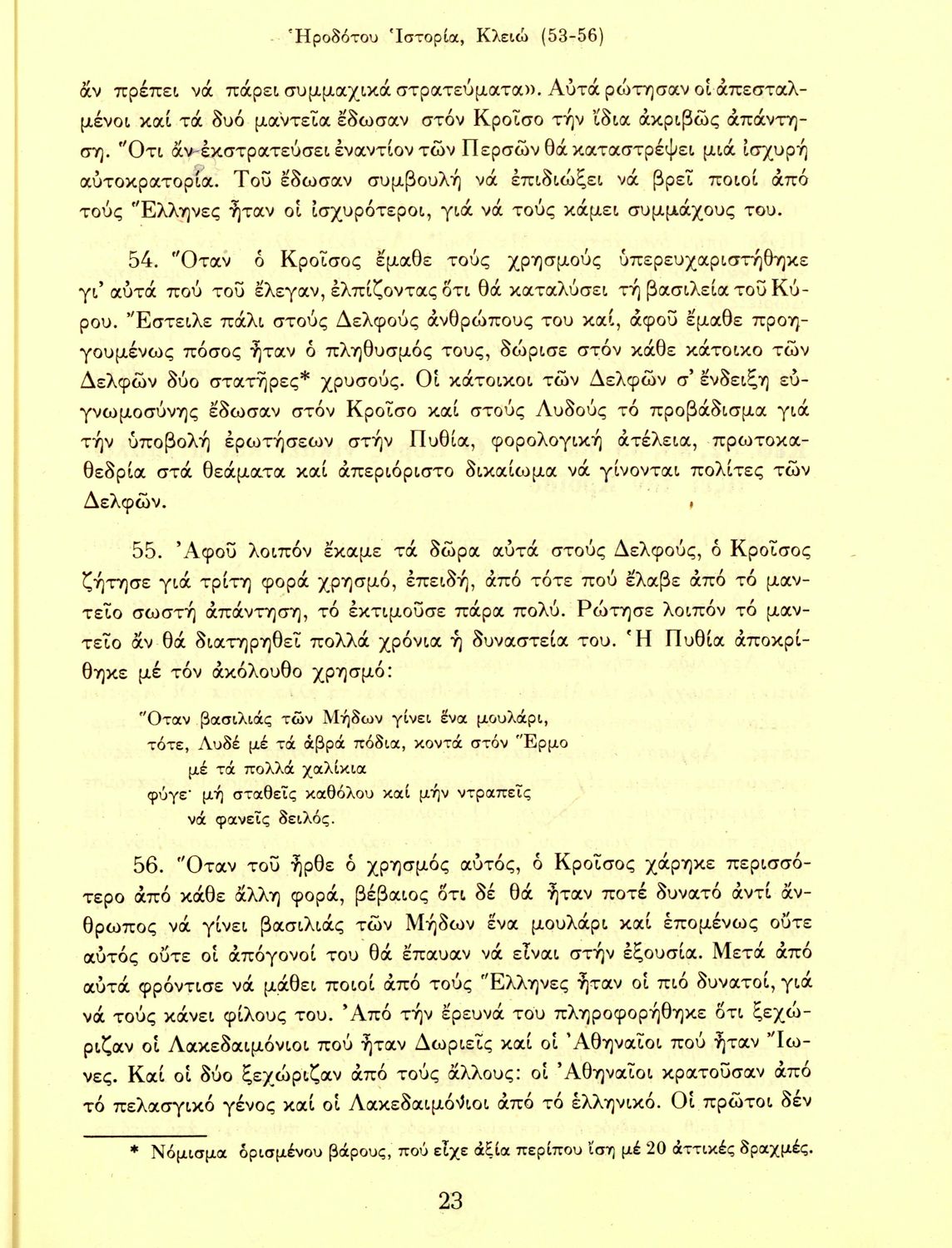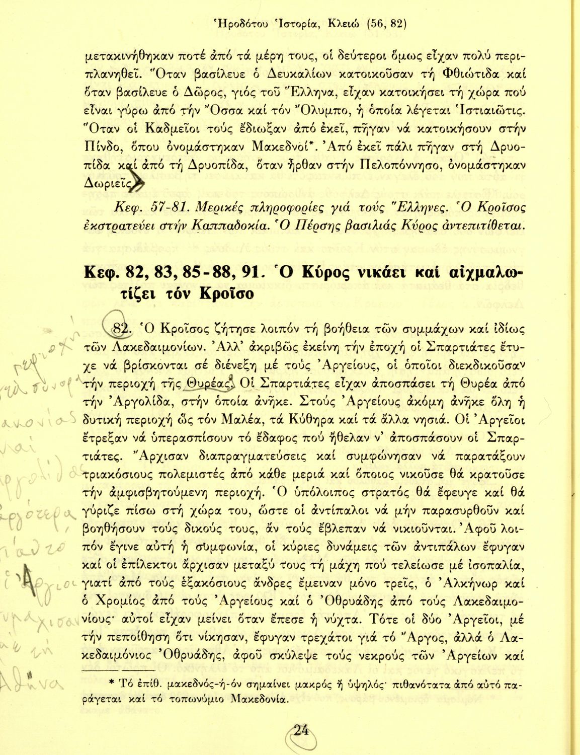 Σχολικό εγχειρίδιο Αρχαίων Ελληνικών Α΄ Γυμνασίου που περιλαμβάνει αποσπάσματα από την Ιστορία του Ηρόδοτου σε μετάφραση, εισαγωγή στη ζωή, το έργο και τη διάλεκτό του και ερμηνευτικά και πραγματολογικά σχόλια.