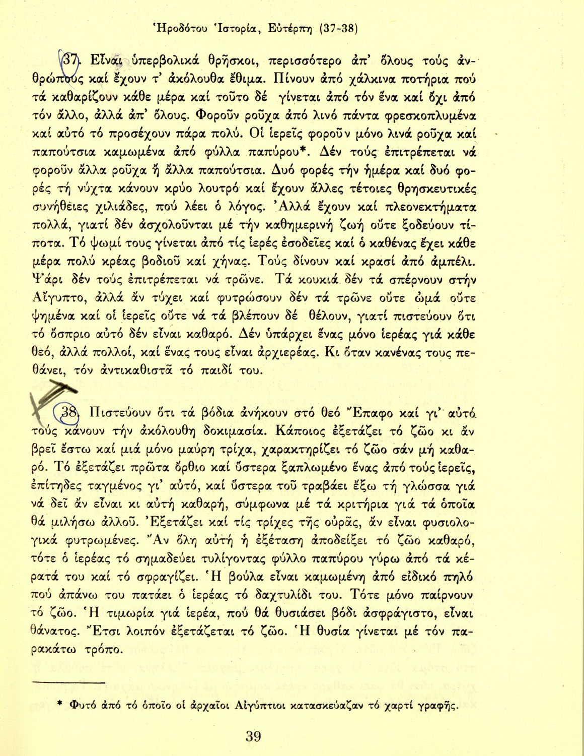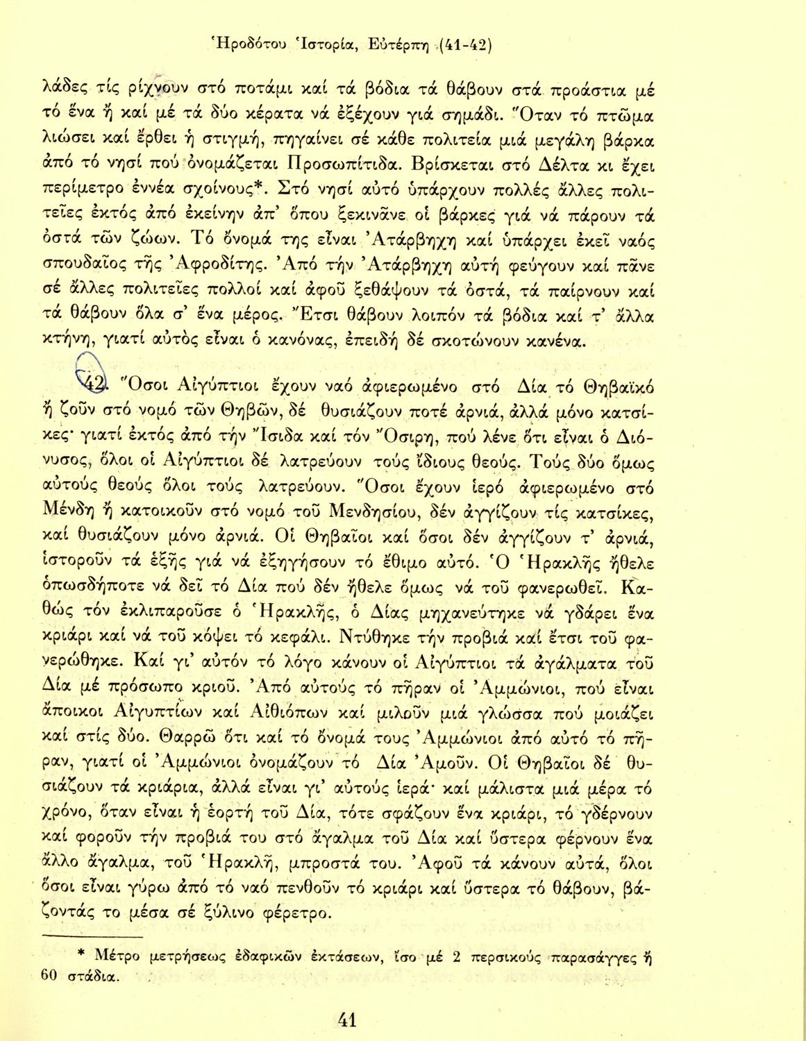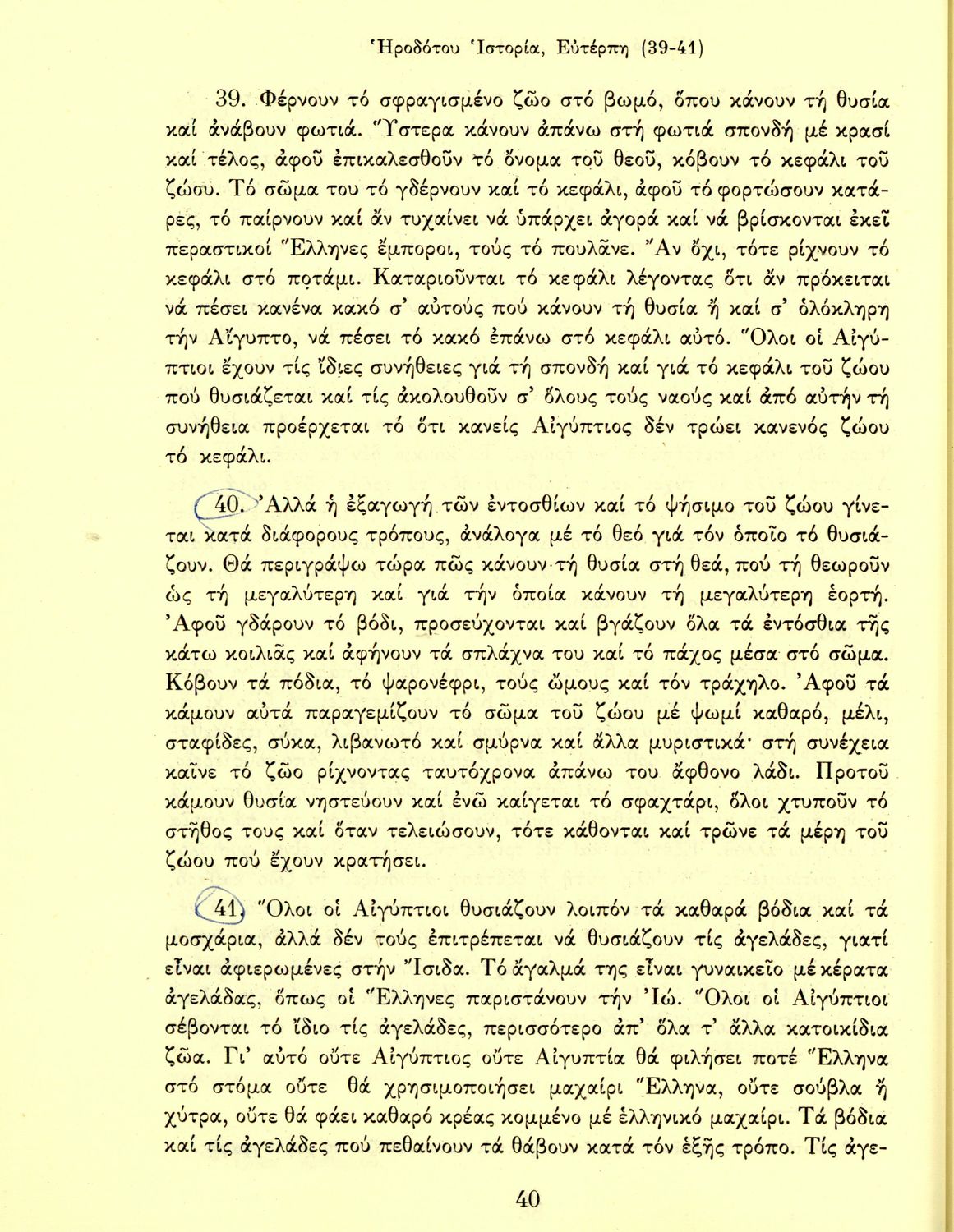 Σχολικό εγχειρίδιο Αρχαίων Ελληνικών Α΄ Γυμνασίου που περιλαμβάνει εισαγωγή στη ζωή και το έργο του Ηρόδοτου, και αποσπάσματα από τα 9 βιβλία της Ιστορίας του σε μετάφραση. Φέρει το σύμβολο της δικτατορίας.