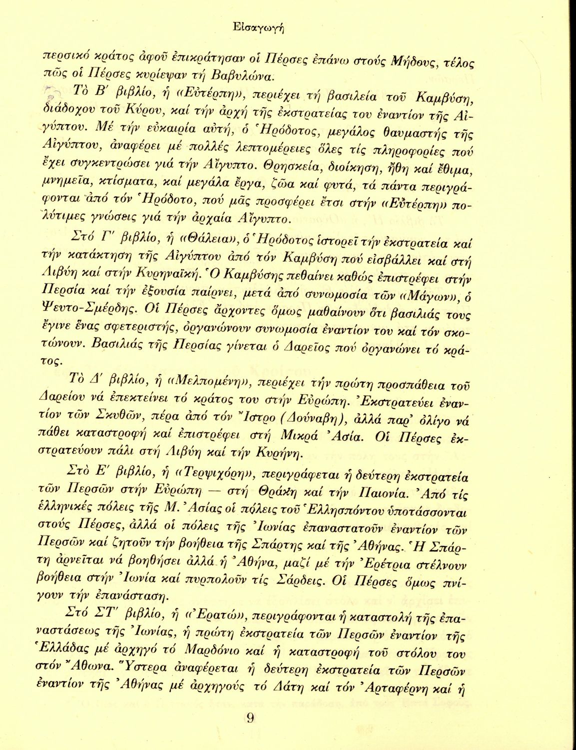 Σχολικό εγχειρίδιο Αρχαίων Ελληνικών Α΄ Γυμνασίου που περιλαμβάνει εισαγωγή στη ζωή και το έργο του Ηρόδοτου, και αποσπάσματα από τα 9 βιβλία της Ιστορίας του σε μετάφραση.