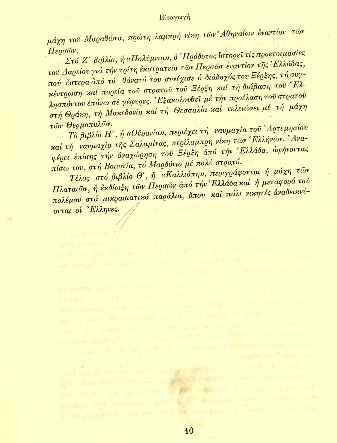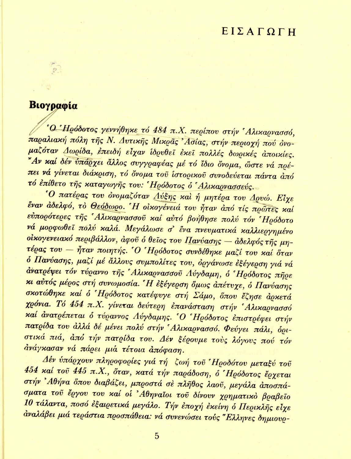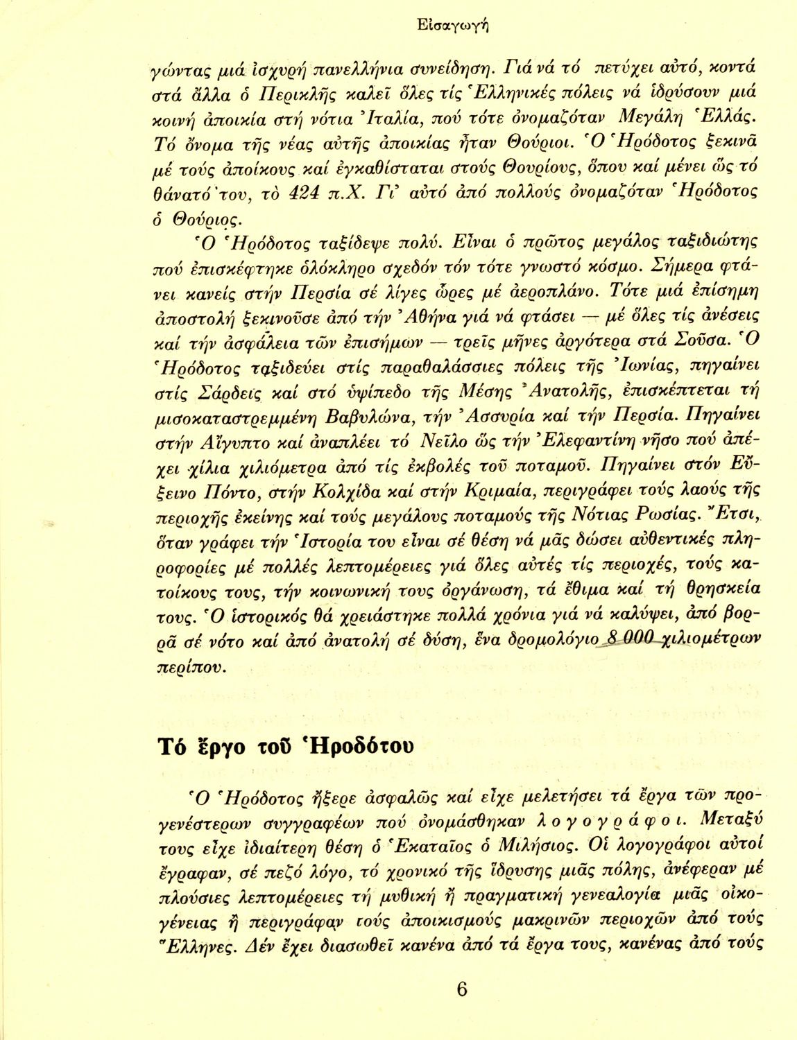 Σχολικό εγχειρίδιο Αρχαίων Ελληνικών Α΄ Γυμνασίου που περιλαμβάνει εισαγωγή στη ζωή και το έργο του Ηρόδοτου, και αποσπάσματα από τα 9 βιβλία της Ιστορίας του σε μετάφραση. Φέρει το σύμβολο της δικτατορίας.