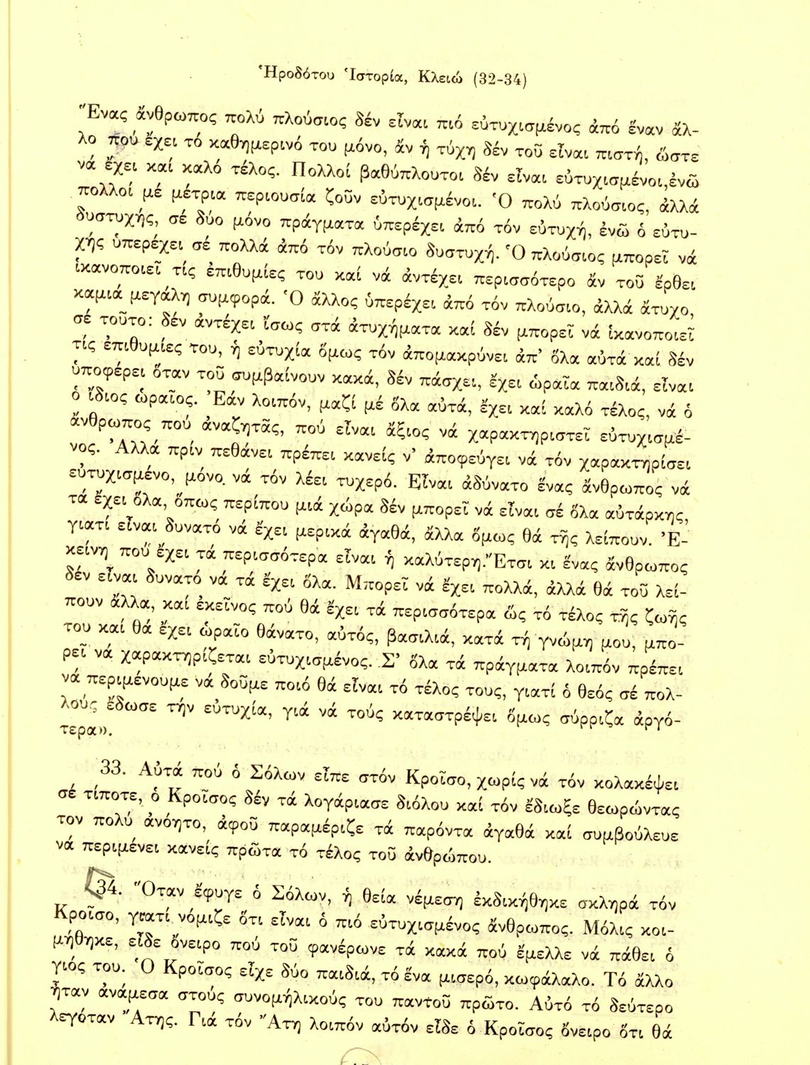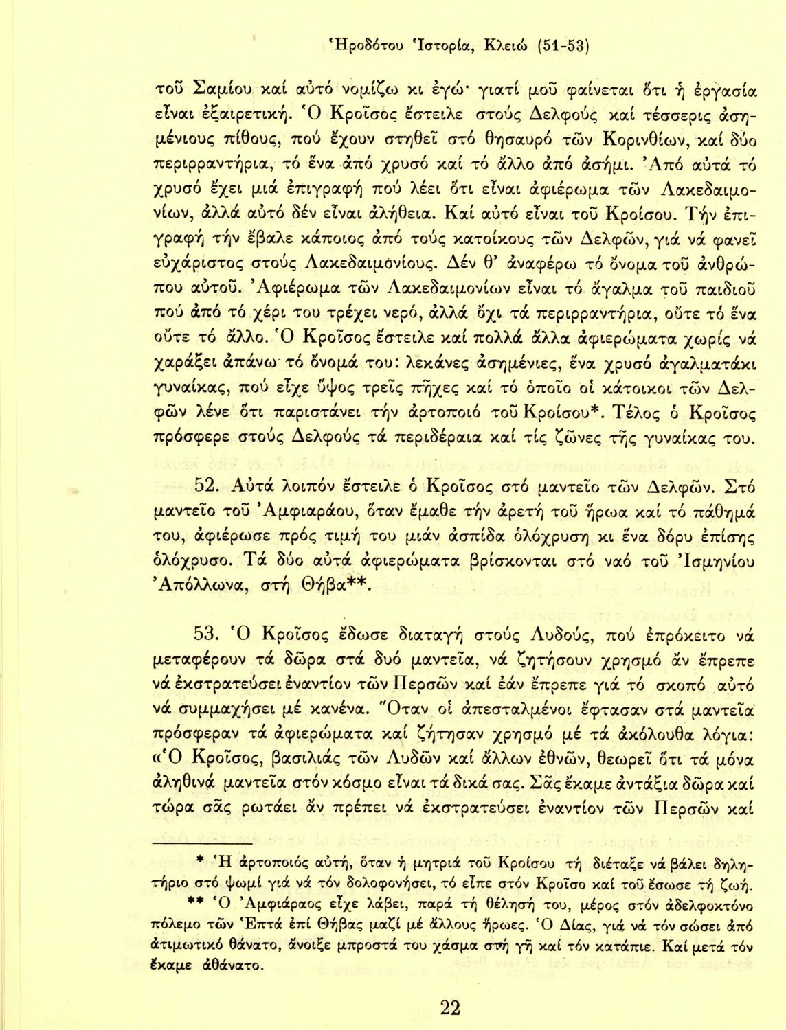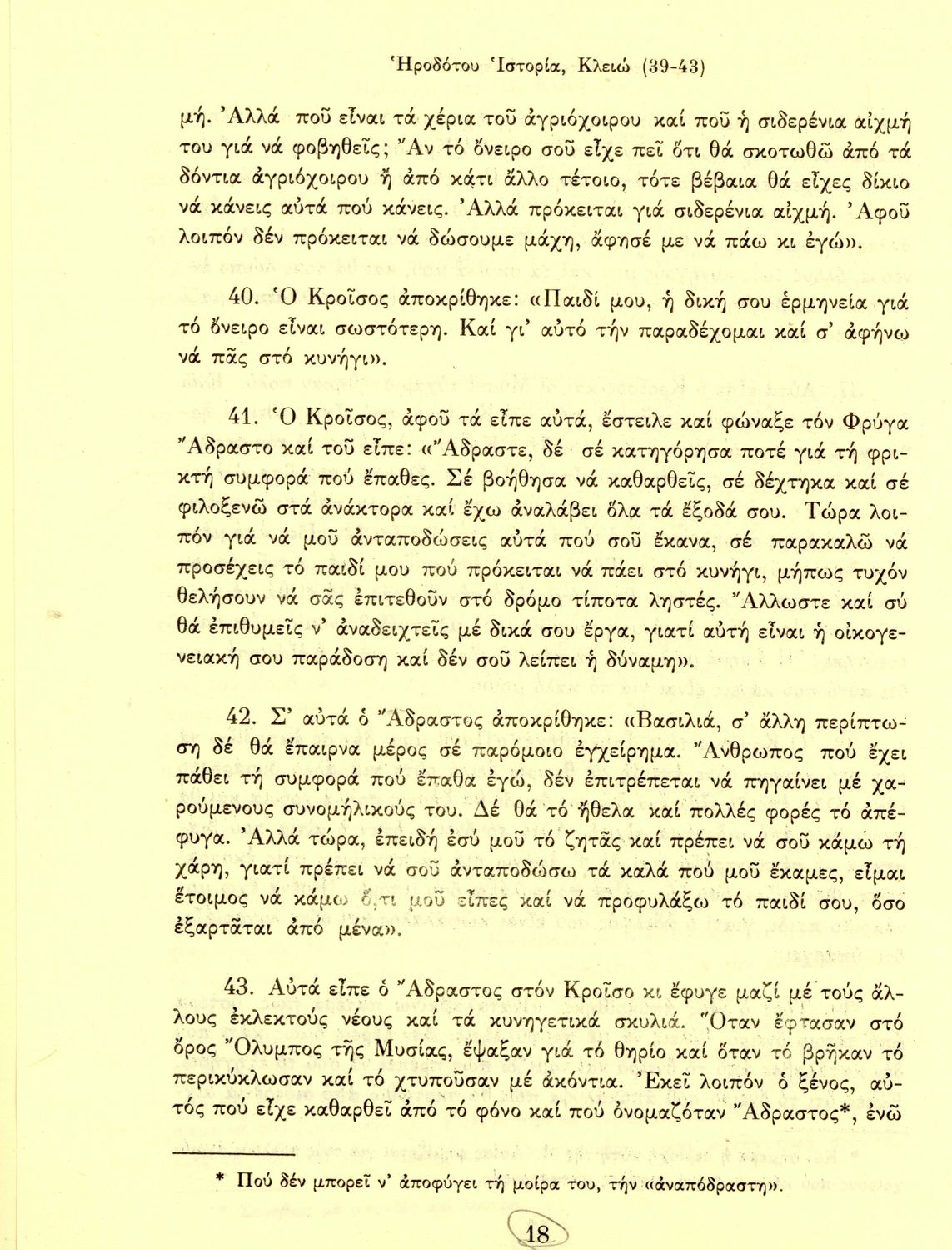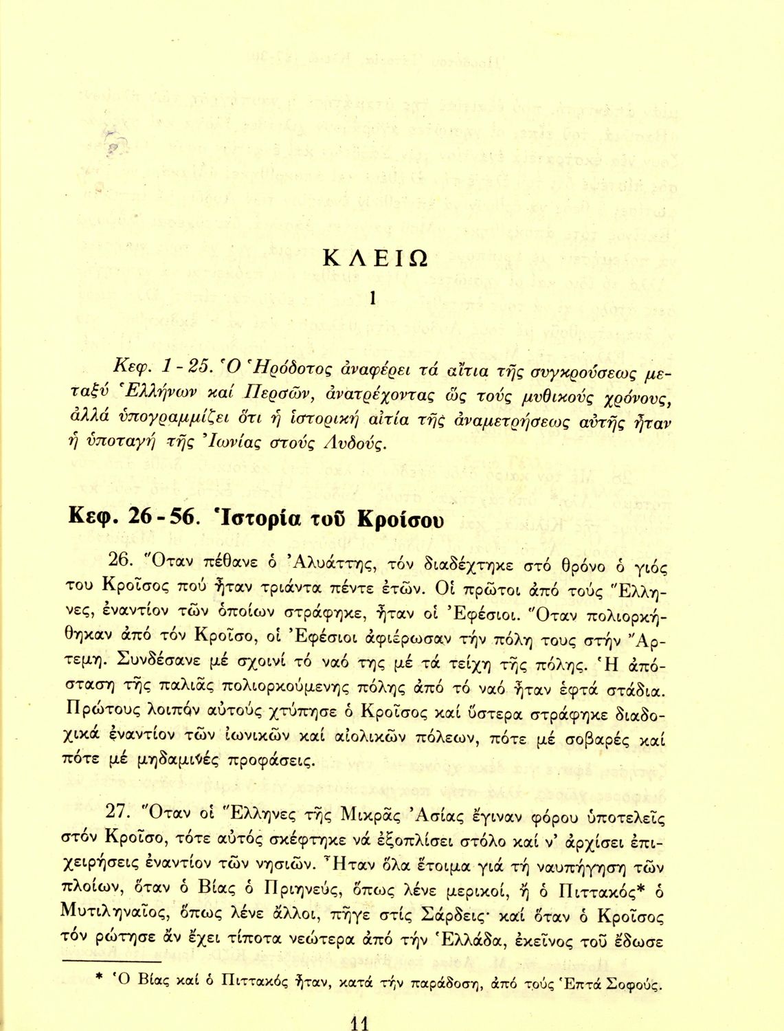 Σχολικό εγχειρίδιο Αρχαίων Ελληνικών Α΄ Γυμνασίου που περιλαμβάνει αποσπάσματα από την Ιστορία του Ηρόδοτου σε μετάφραση, εισαγωγή στη ζωή, το έργο και τη διάλεκτό του και ερμηνευτικά και πραγματολογικά σχόλια.