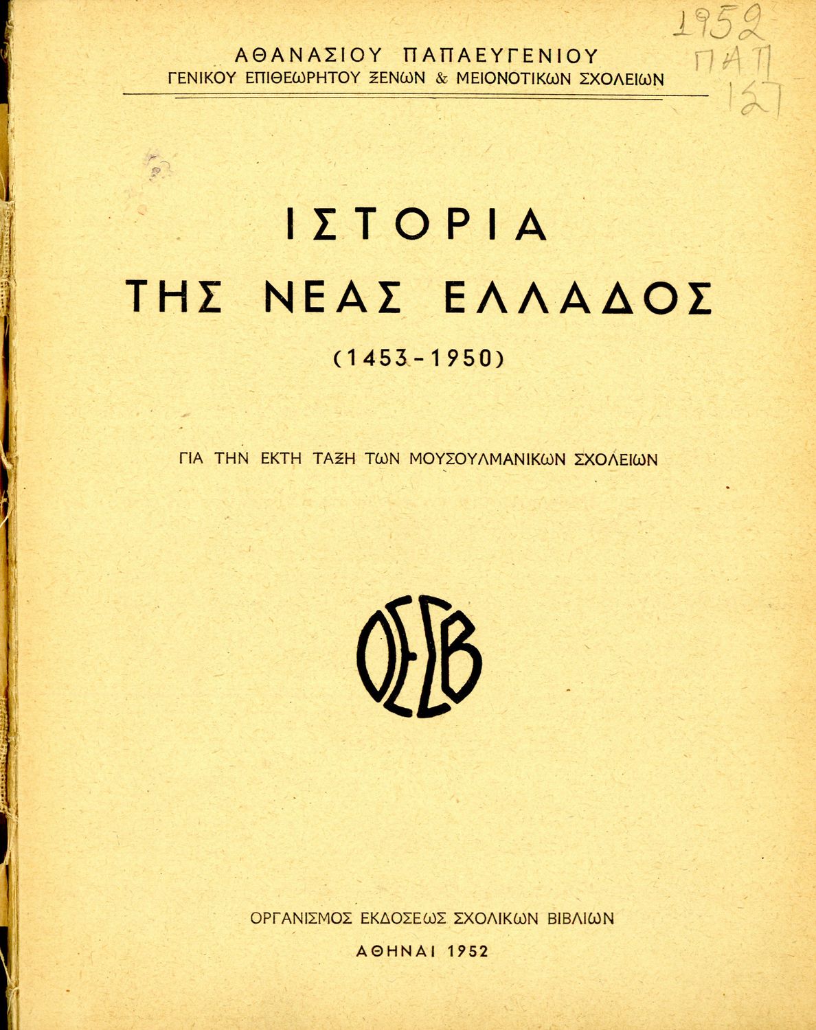 Κωδικός αναγνώρισης: 02-01006 Τίτλος: Ιστορία της νέας Ελλάδος (1453 -1950) για την έκτη τάξη των μουσουλμανικών σχολείων Συγγραφέας: Αθανάσιος Παπαευγενίου Μέγεθος και υπόστρωμα: Σχολικό εγχειρίδιο, μαλακό εξώφυλλο, 166 σελίδες. Εξώφυλλο (έγχρωμο), σκίτσα (ασπρόμαυρα). |