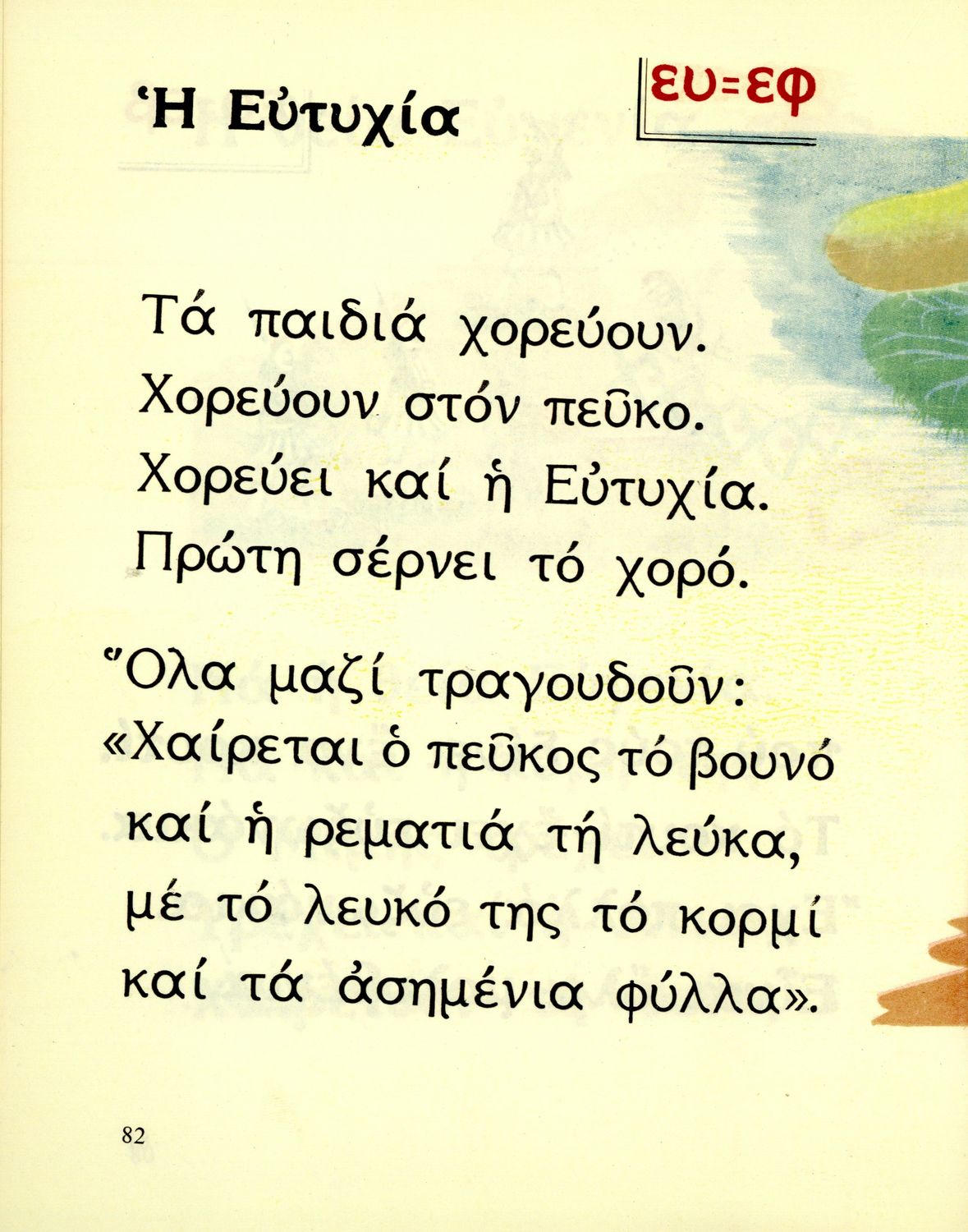 Αναγνωστικό Α΄ Δημοτικού που περιέχει ποιήματα και πεζά με σκηνές και προκρίνει τις αξίες της καλοσύνης, της υπευθυνότητας, της εργατικότητας, της αγάπης προς τα ζώα, αλλά και της διασκέδασης.