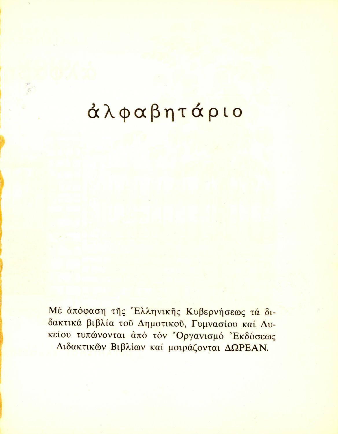 Κωδικός αναγνώρισης: 02-01007 Τίτλος: Αλφαβητάριο Συγγραφέας: Ι. Κ. Γιαννέλης, Γ. Σακκάς Εικονογράφος: Κώστας Π. Γραμματόπουλος Μέγεθος και υπόστρωμα: Σχολικό εγχειρίδιο, σκληρό εξώφυλλο, 212 σελίδες. Εξώφυλλο (έγχρωμο), σκίτσα (έγχρωμα). |