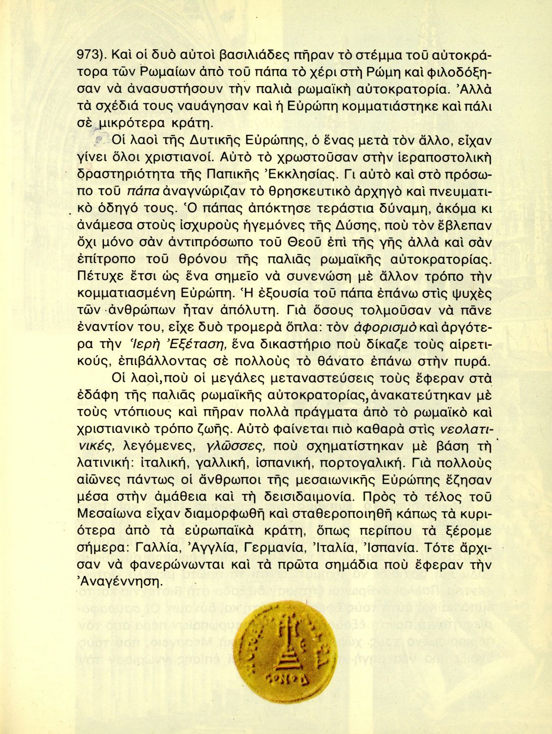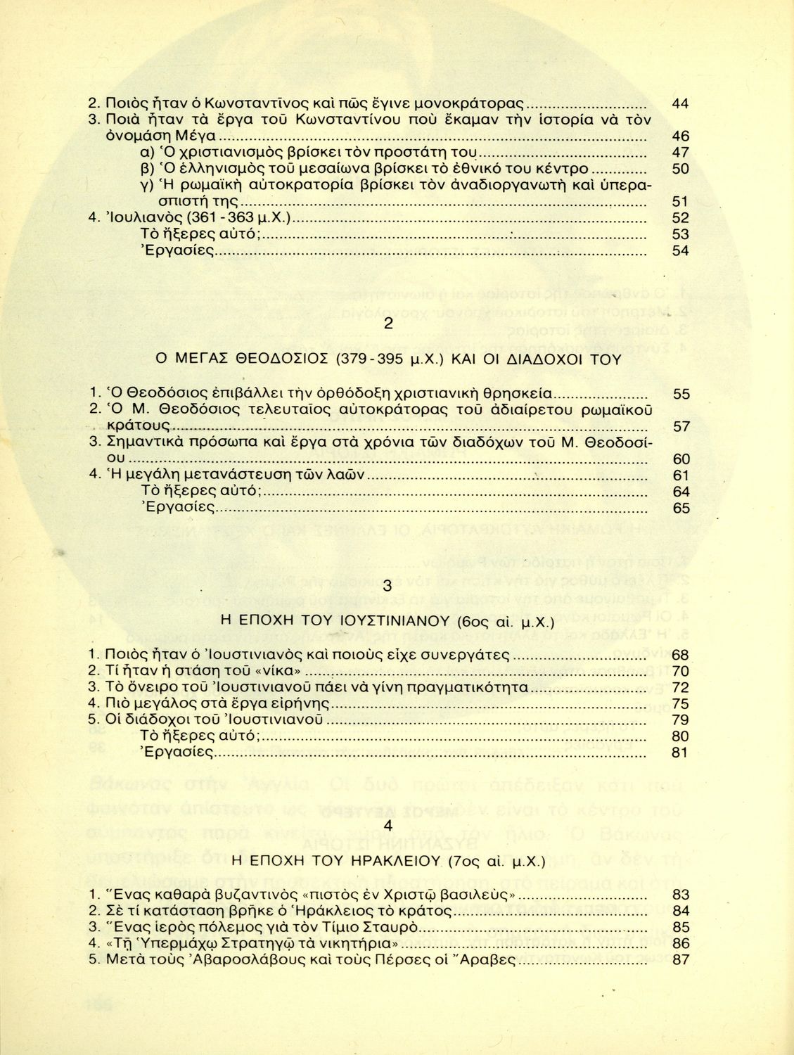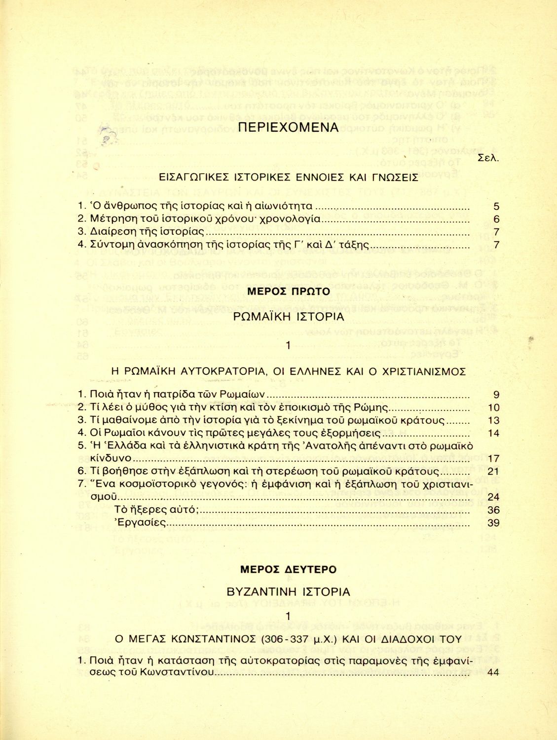 520 ## _aΣχολικό εγχειρίδιο για την Ε΄ Δημοτικού για το μάθημα της Ιστορίας. Το εγχειρίδιο περιλαμβάνει εισαγωγικές γνώσεις για την διαίρεση της ιστορίας και τον υπολογισμό του ιστορικού χρόνου. Το κύριο μέρος του βιβλίου χωρίζεται σε δύο μέρη. Το πρώτο μέρος ασχολείται με τη ρωμαϊκή ιστορία, την ρωμαϊκή αυτοκρατορία, τους Έλληνες και την διάδοση του χριστιανισμού. Το δεύτερο μέρος εμπεριέχει την βυζαντινή ιστορία, όπου εκεί σχολιάζονται τα έργα των Βυζαντινών αυτοκρατόρων από του Μ. Κωνσταντίνου κ.ε., η δυναστεία των Ισαύρων, η Μακεδονική Ηγεμονία, οι Σταυροφορίες, η άλωση, η Ευρώπη, ο μεσαίωνας κα η αναγέννηση.