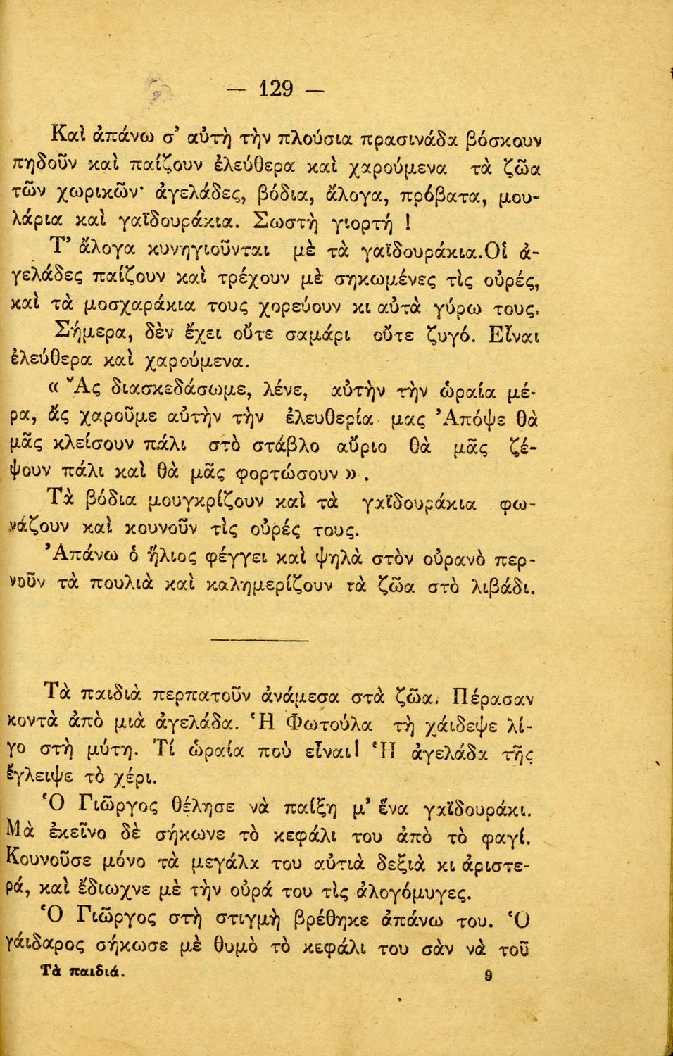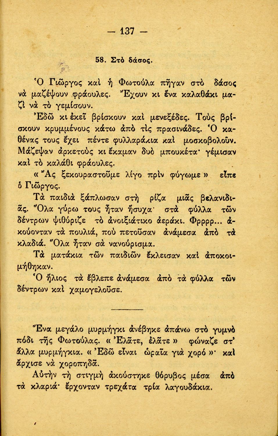Αναγνωστικό Β' Δημοτικού που περιλαμβάνει μικρά διηγήματα και ποιήματα με περιεχόμενο από την οικογενειακή και κοινωνική ζωή, την ελληνική φύση, την ελληνική ιστορία και μυθολογία και την υγιεινή.
