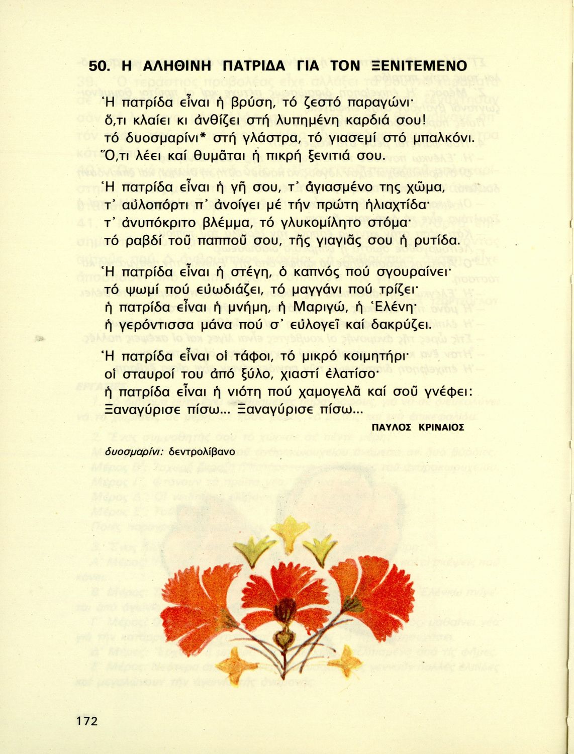 Αναγνωστικό ΣΤ΄ Δημοτικού που αντλεί τα θέματά του από τη θρησκευτική, εθνική, οικογενειακή, κοινωνική και επαγγελματική ζωή και την σύγχρονη ελληνική ιστορία. Φέρει το σύμβολο της δικτατορίας.