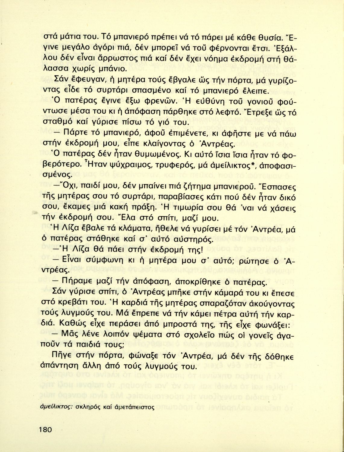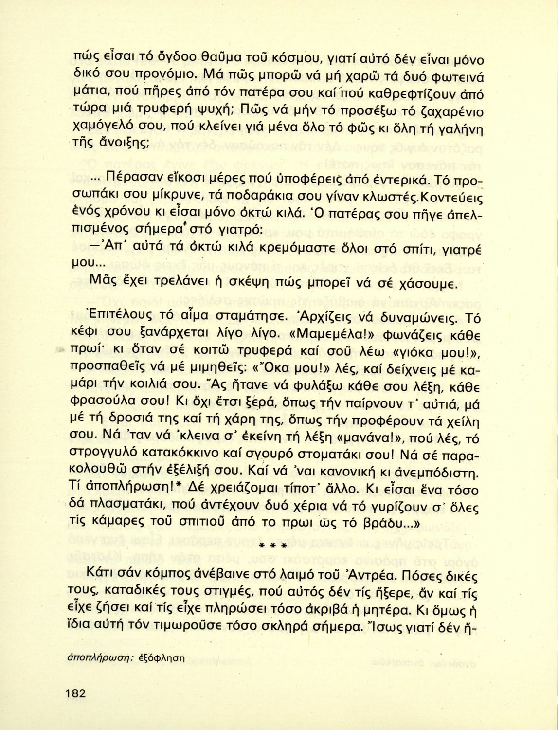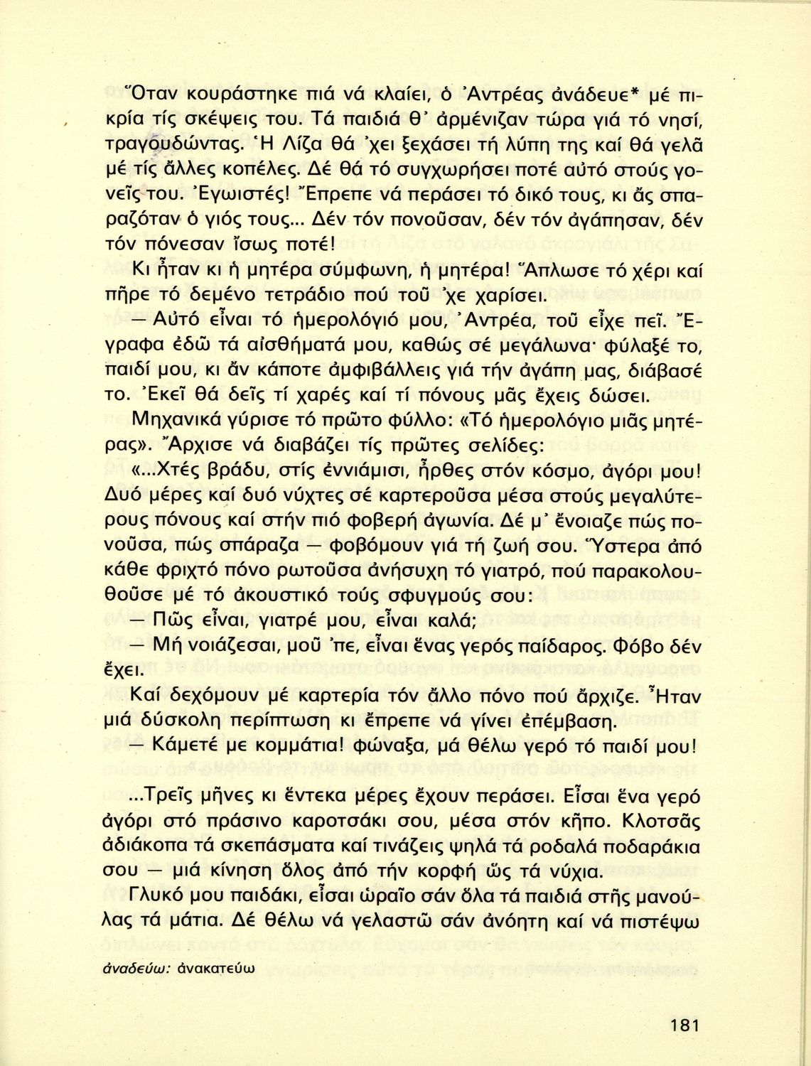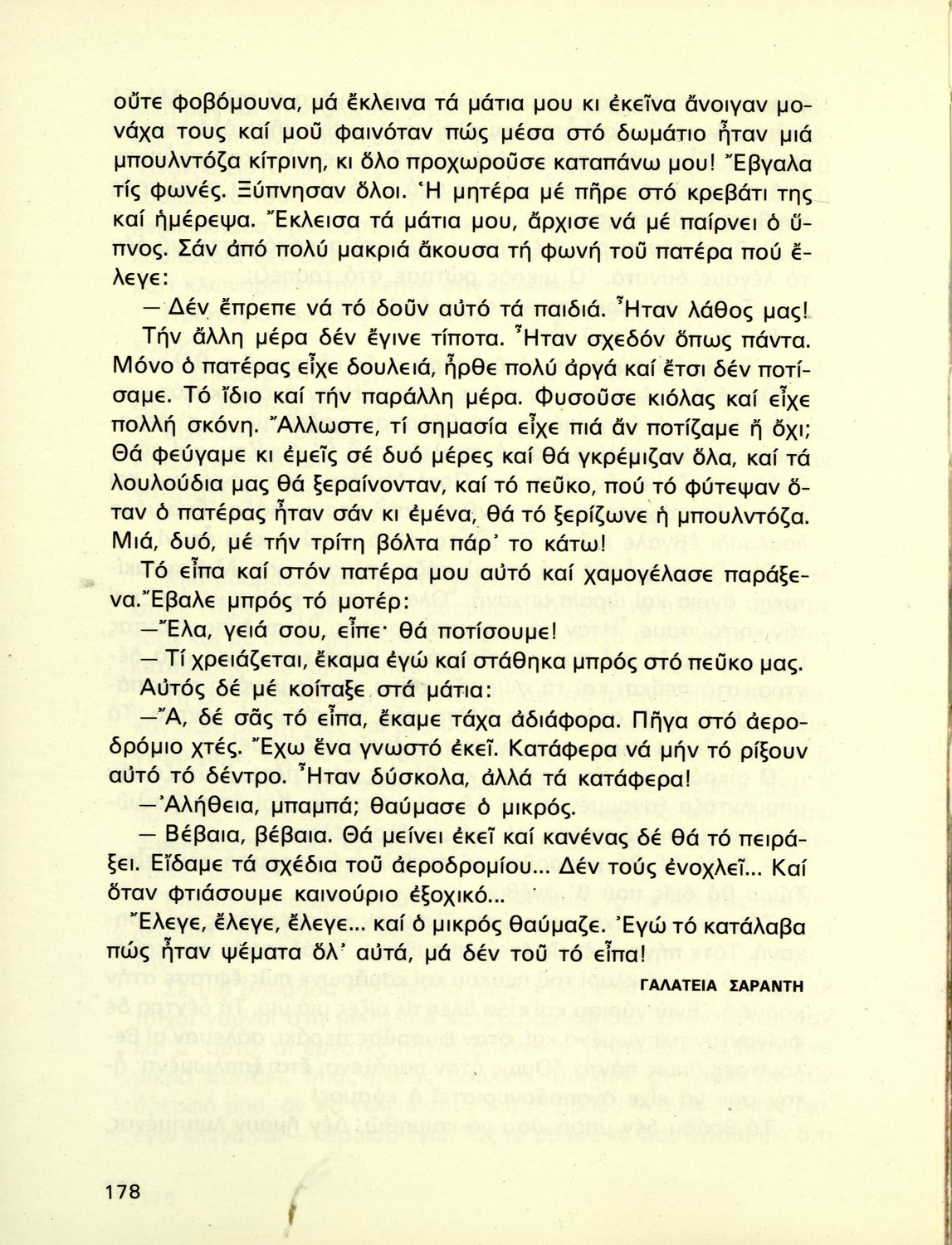 Αναγνωστικό ΣΤ΄ Δημοτικού που περιέχει πεζά και ποιήματα εμπνευσμένα από την κοινωνική, θρησκευτική και εθνική ζωή, την πολιτιστική κληρονομιά και τα ολυμπιακά ιδεώδη καθώς και από τις ασχολίες των ανθρώπων και τα προβλήματά τους.