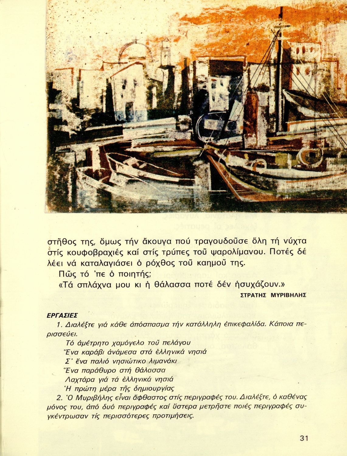 520 ## _aΑναγνωστικό ΣΤ΄ Δημοτικού που περιέχει πεζά και ποιήματα εμπνευσμένα από την κοινωνική, θρησκευτική και εθνική ζωή, την πολιτιστική κληρονομιά και τα ολυμπιακά ιδεώδη καθώς και από τις ασχολίες των ανθρώπων και τα προβλήματά τους.